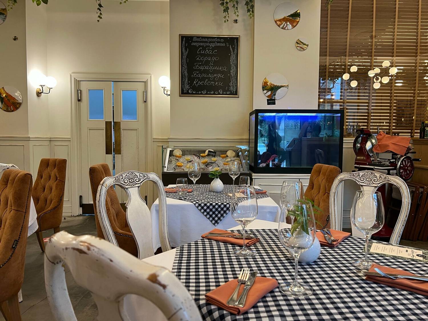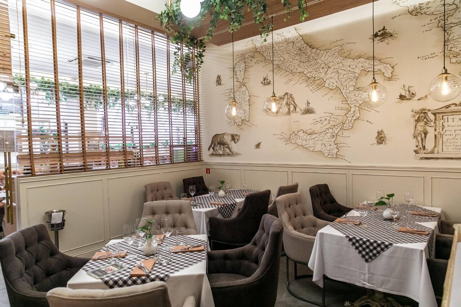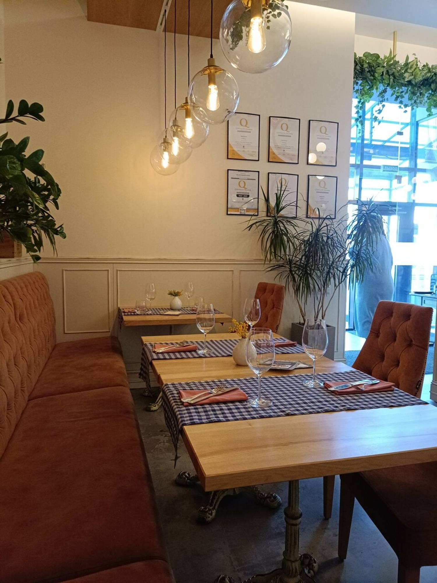 Атмосфера. Ресторан погружает в атмосферу современной и элегантной Италии, где царит ощущение легкости и гостеприимства. После реконструкции интерьер, выполненный в серо-терракотовых и бежевых тонах с клетчатыми скатертями, мягкими креслами, резными стульями и зеленью под потолком, создает стильную обстановку без лишней помпезности. Детали вроде карты Италии на стене, черно-белых фотографий и витрины со свежей рыбой усиливают впечатление аутентичности. Заведение идеально подойдет как для семейного ужина, так и для особого случая.