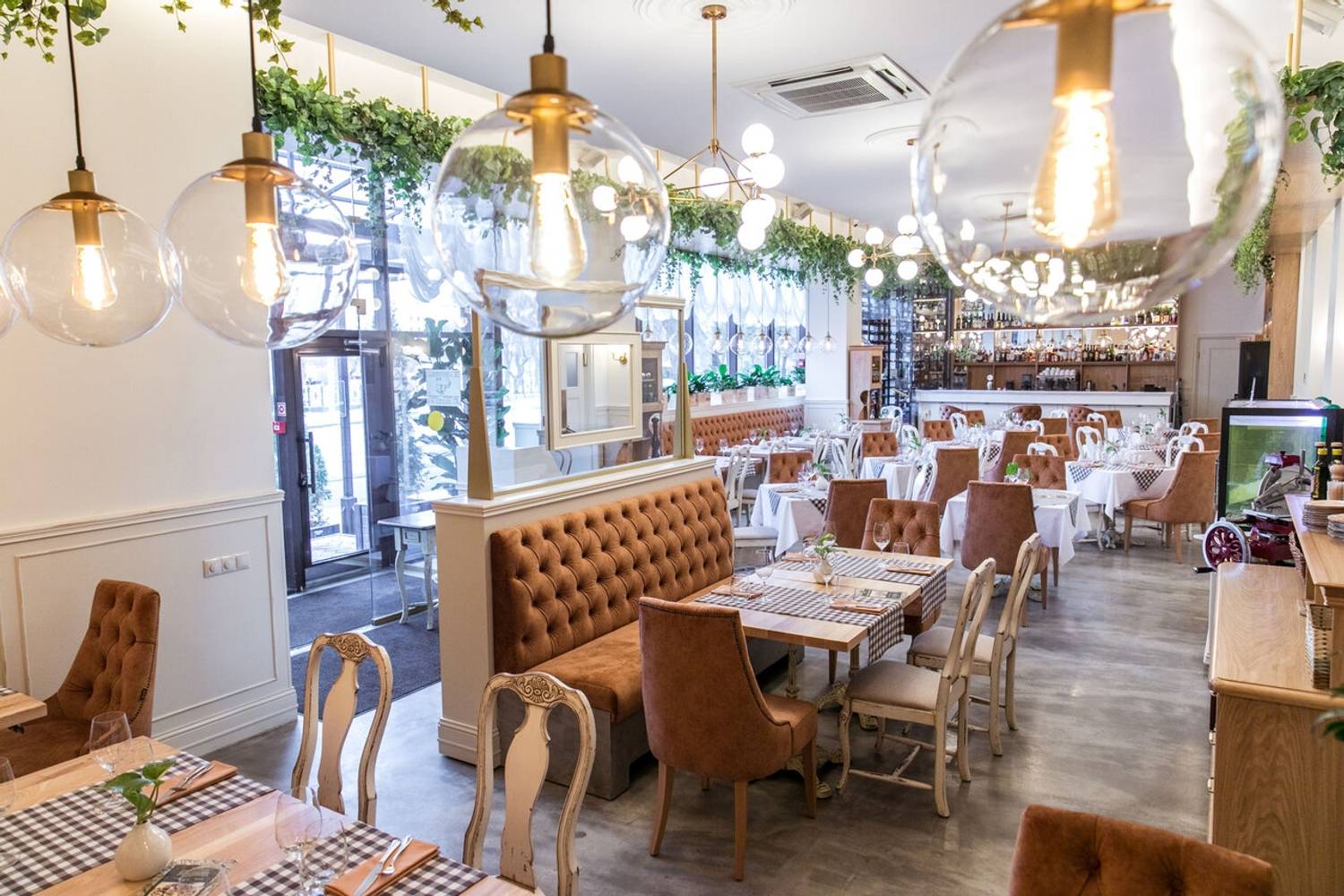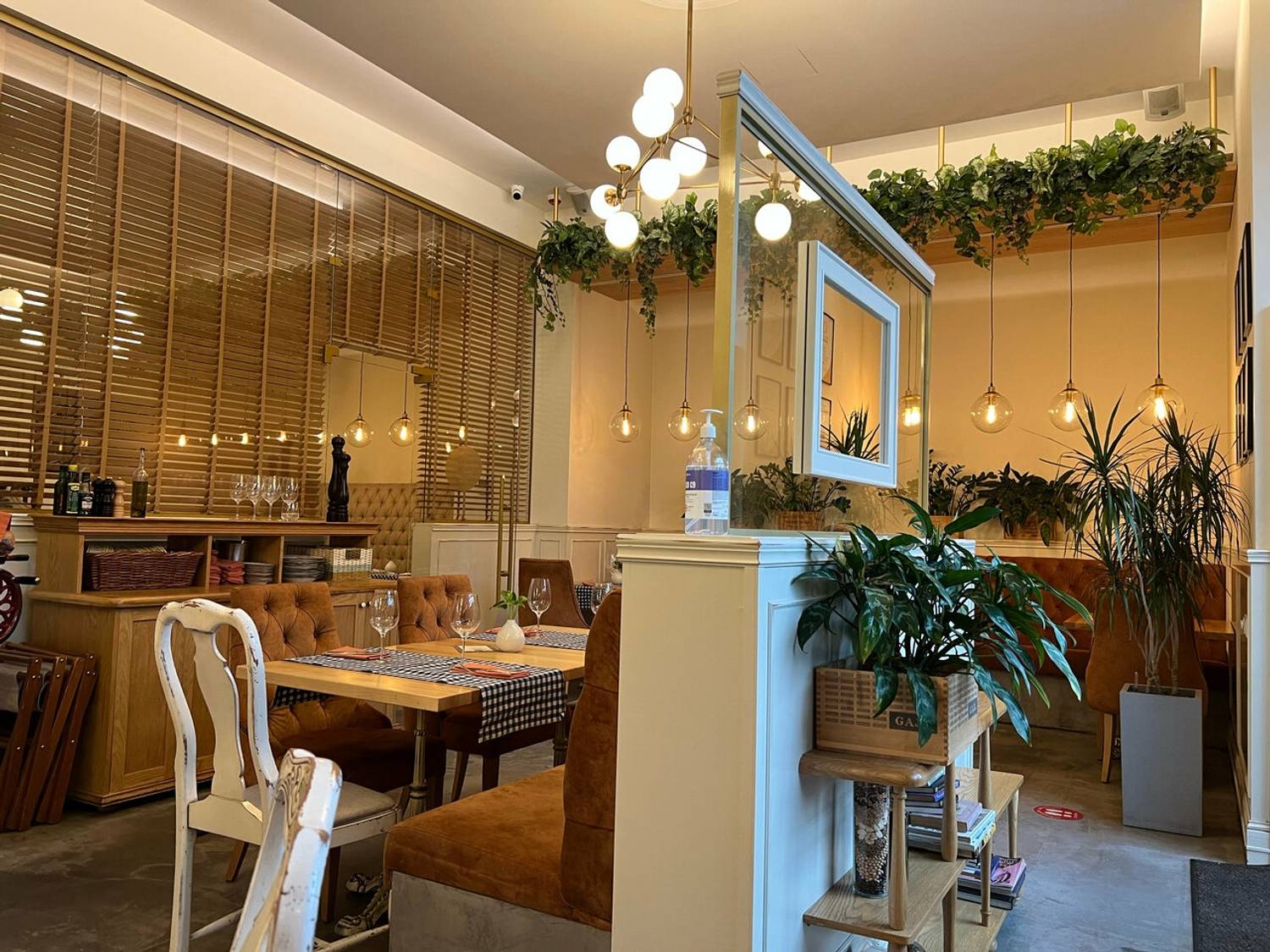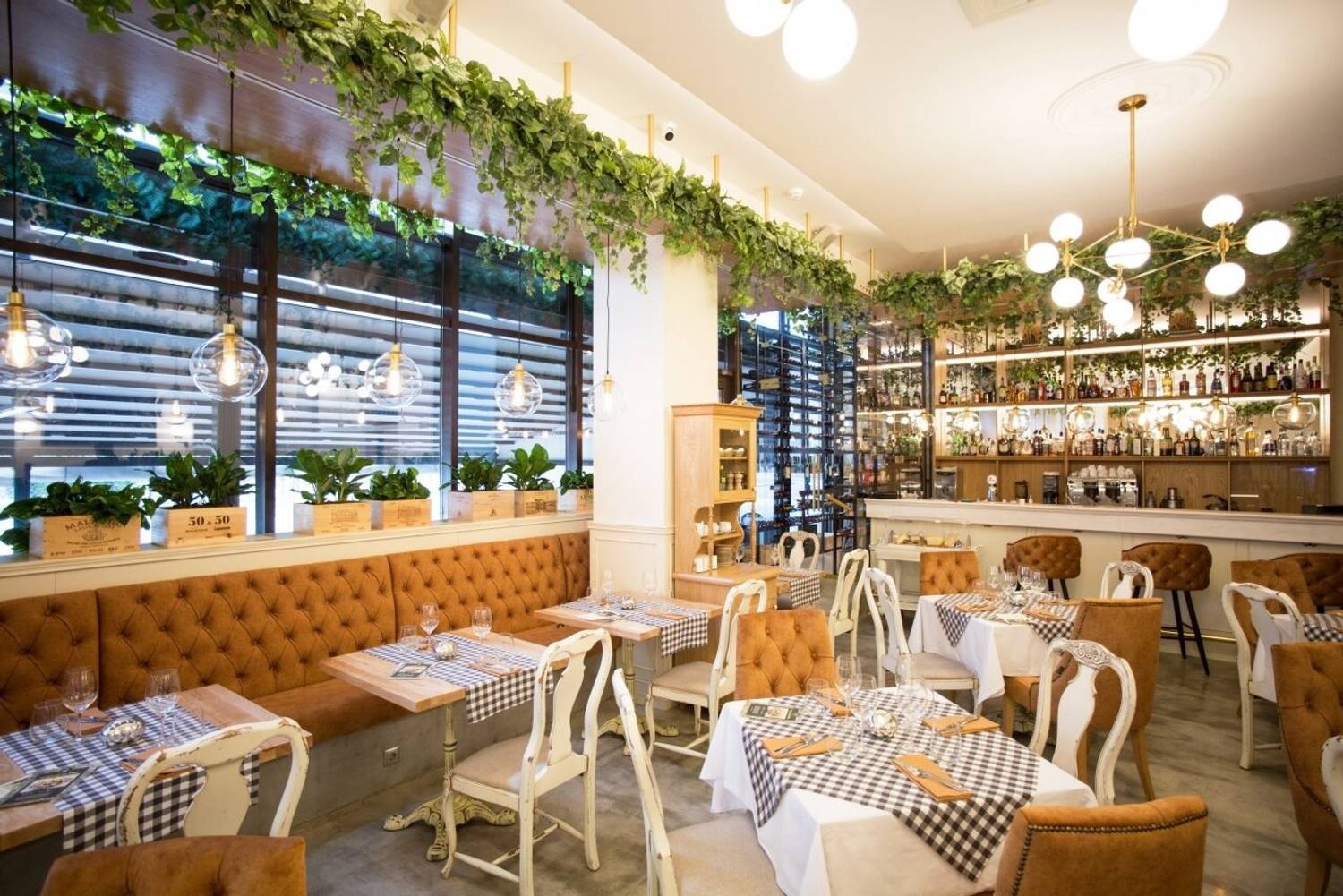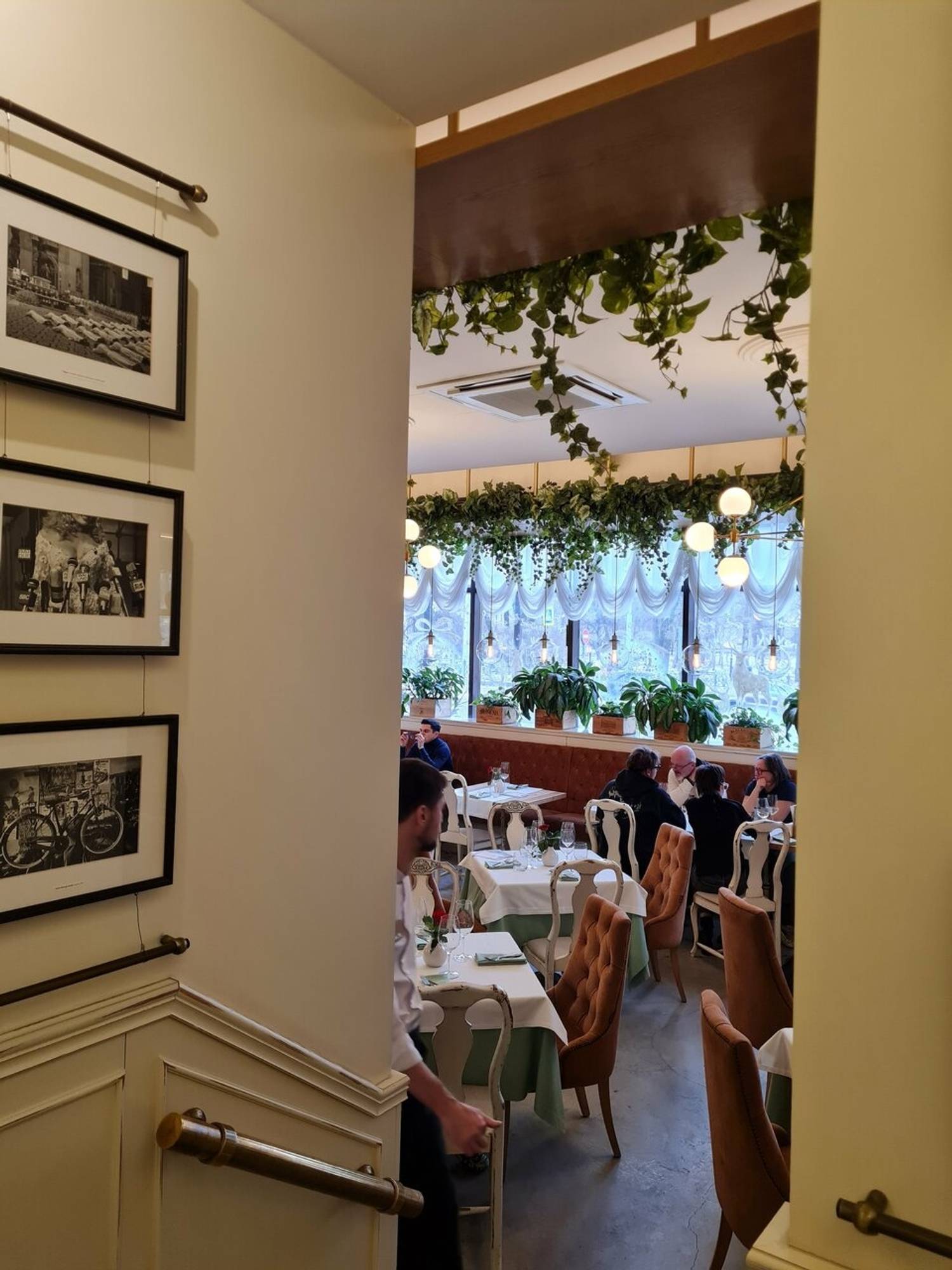 Атмосфера. Ресторан погружает в атмосферу современной и элегантной Италии, где царит ощущение легкости и гостеприимства. После реконструкции интерьер, выполненный в серо-терракотовых и бежевых тонах с клетчатыми скатертями, мягкими креслами, резными стульями и зеленью под потолком, создает стильную обстановку без лишней помпезности. Детали вроде карты Италии на стене, черно-белых фотографий и витрины со свежей рыбой усиливают впечатление аутентичности. Заведение идеально подойдет как для семейного ужина, так и для особого случая.