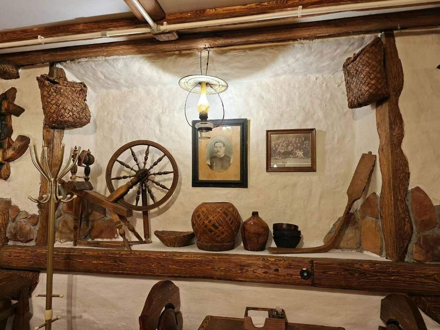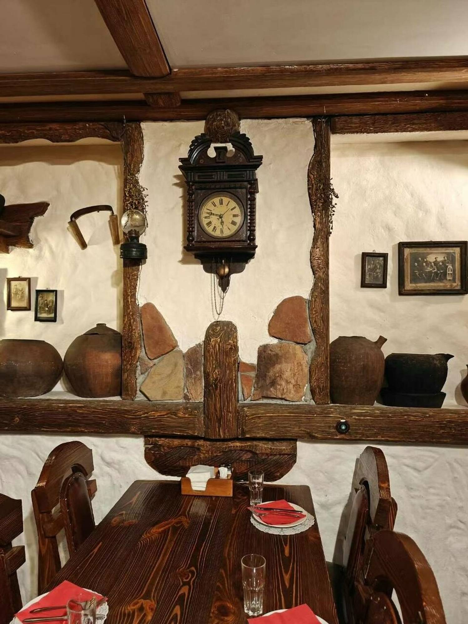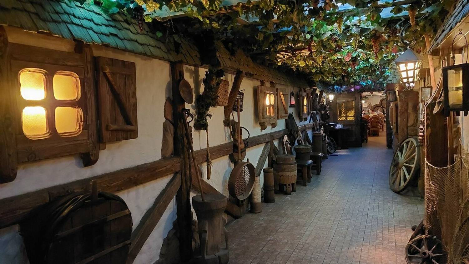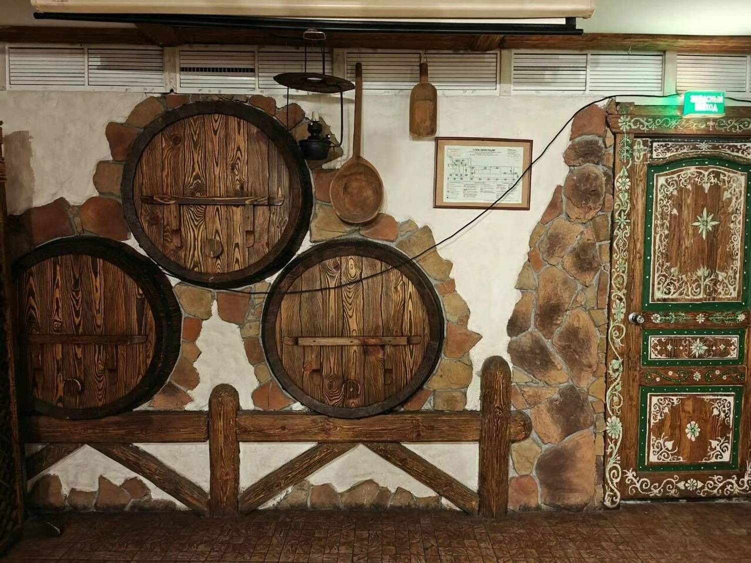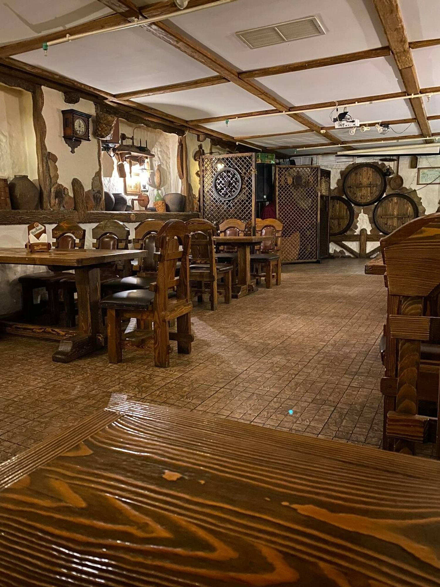 Атмосфера. Пространство настраивает на душевный отдых, характерный для старой таверны или постоялого двора. В дизайне обилие дерева: темные массивные столы, деревянные перегородки между ними, расписные двери и декоративные элементы в виде бочек, колес и деревянных оконных рам на белых стенах. Мягкий свет от стилизованных фонарей дополняет картину и создает уютную и камерную обстановку. По вечерам здесь звучит живая музыка, а также работает караоке, что превращает ужин в полноценное вечернее мероприятие.