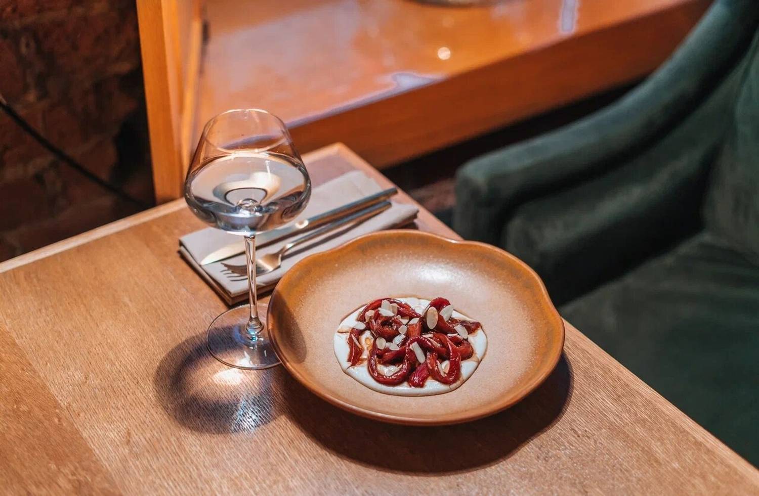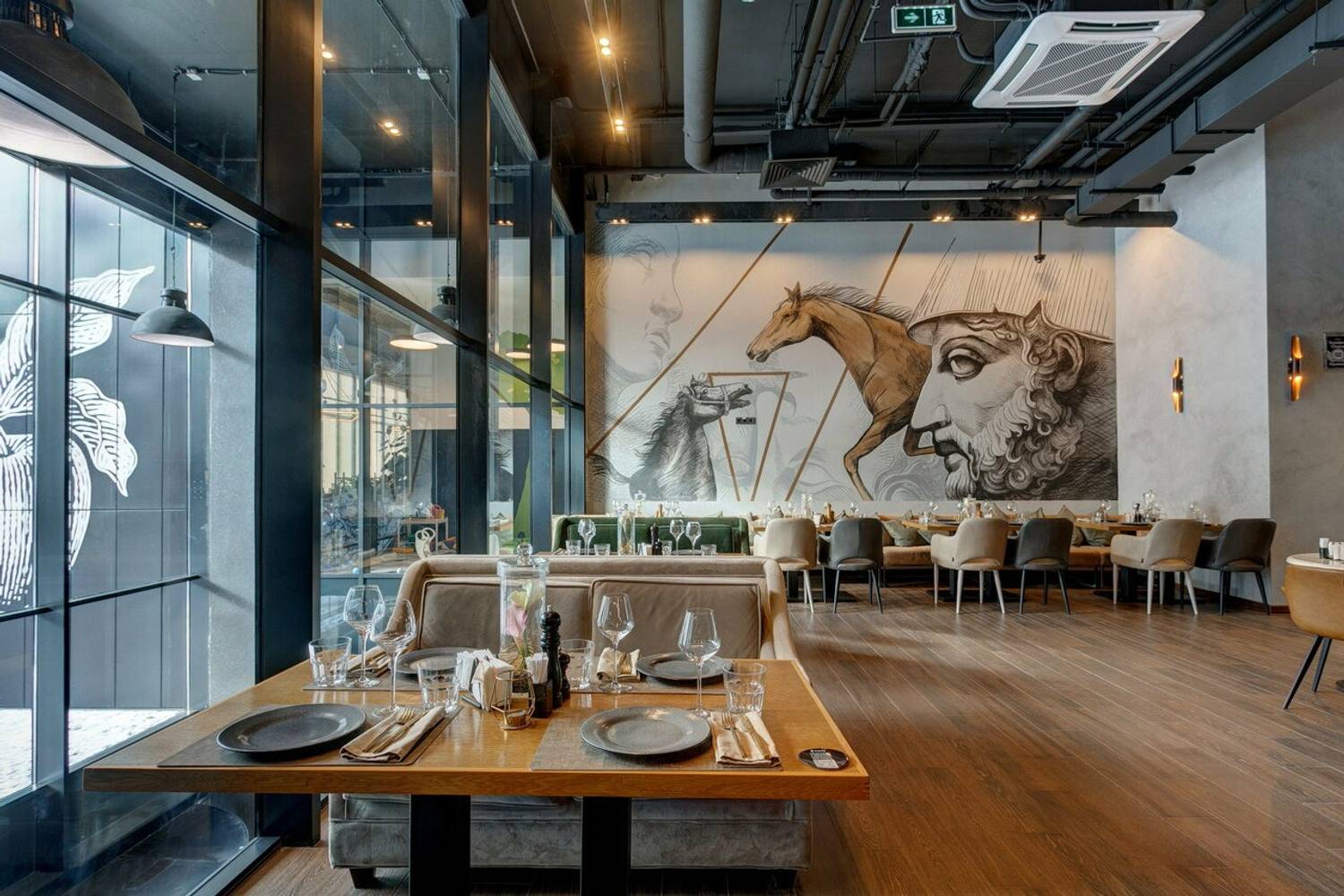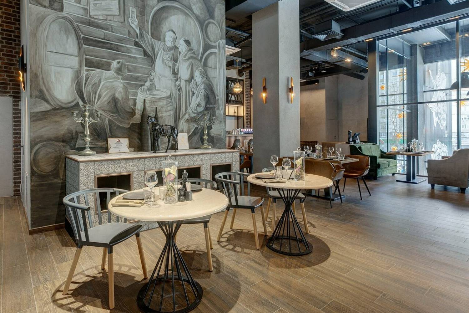 Атмосфера. Пространство состоит из двух контрастных залов. Первый — светлый и воздушный: панорамное остекление наполняет его естественным светом, а стены украсили авторской росписью и современными художественными элементами. Второй зал погружает в атмосферу уединения: приглушенный свет, мерцающие блики и мягкие тени превращают каждый столик в островок тишины. Интерьер балансирует между лаконичностью и деталями — деревянные поверхности, металлические акценты и продуманная подсветка задают тон неспешной дегустации.