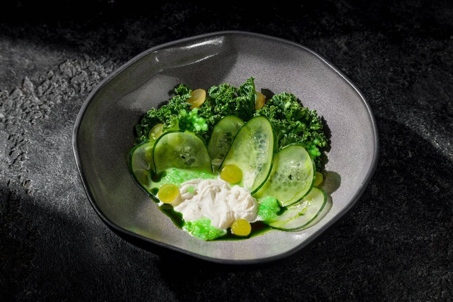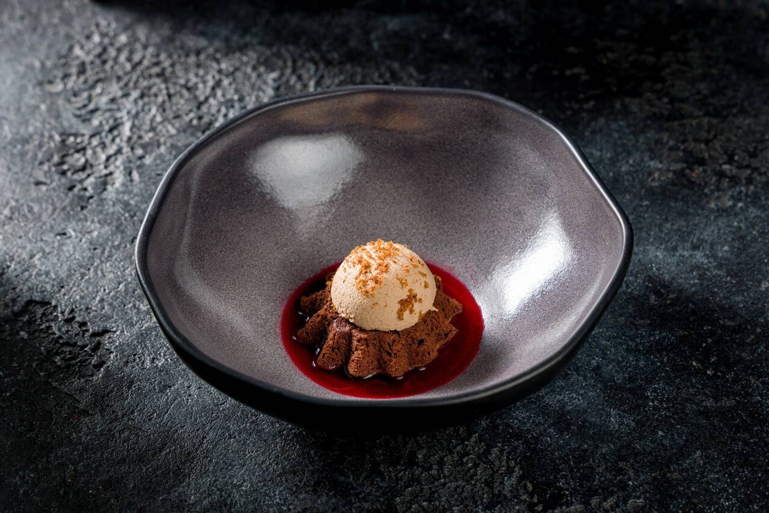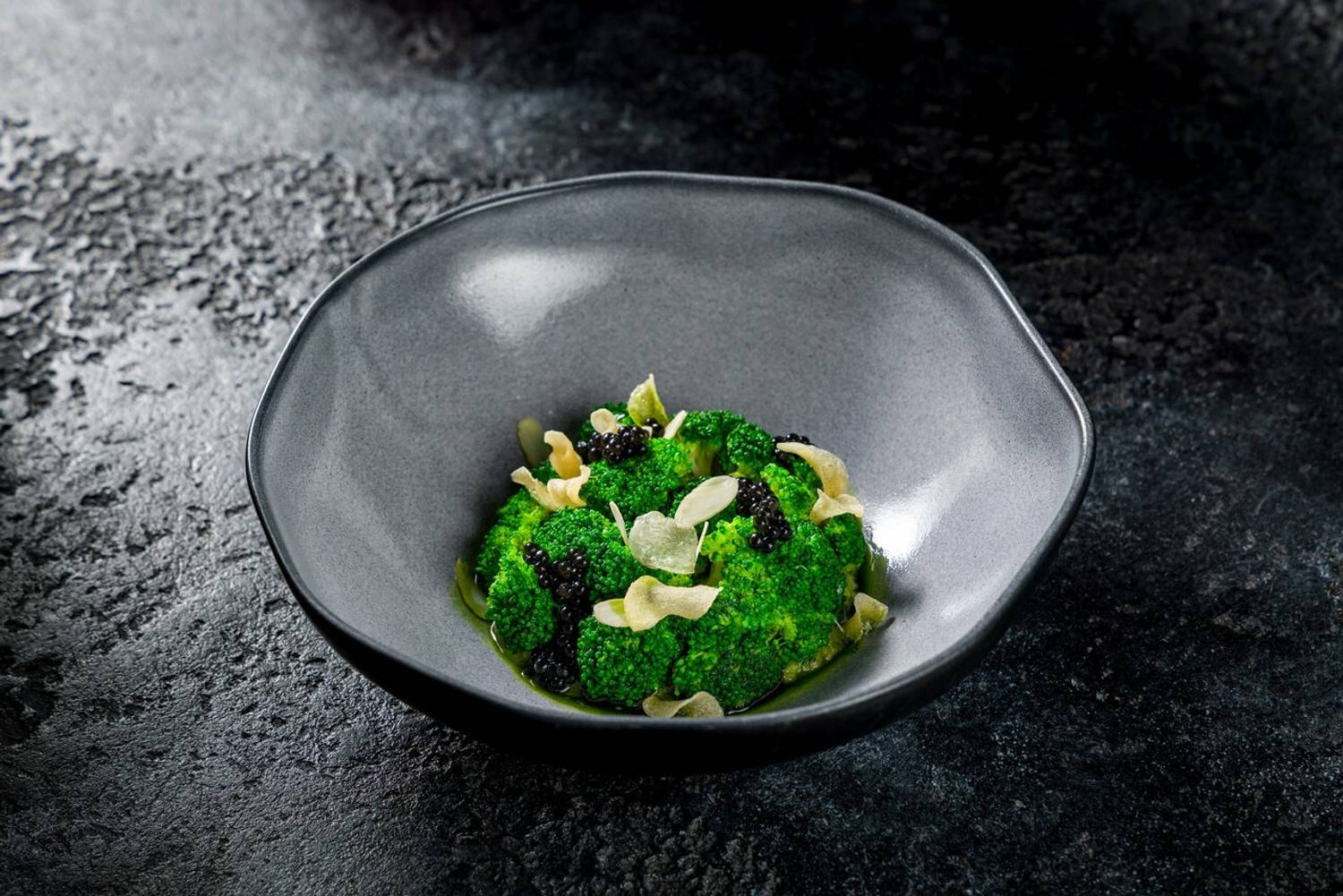 Атмосфера. Пространство состоит из двух контрастных залов. Первый — светлый и воздушный: панорамное остекление наполняет его естественным светом, а стены украсили авторской росписью и современными художественными элементами. Второй зал погружает в атмосферу уединения: приглушенный свет, мерцающие блики и мягкие тени превращают каждый столик в островок тишины. Интерьер балансирует между лаконичностью и деталями — деревянные поверхности, металлические акценты и продуманная подсветка задают тон неспешной дегустации.