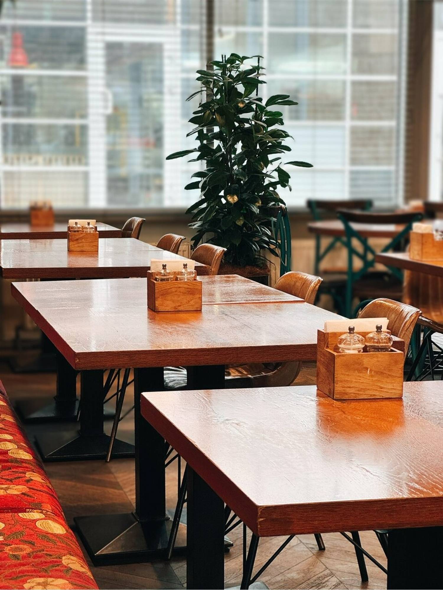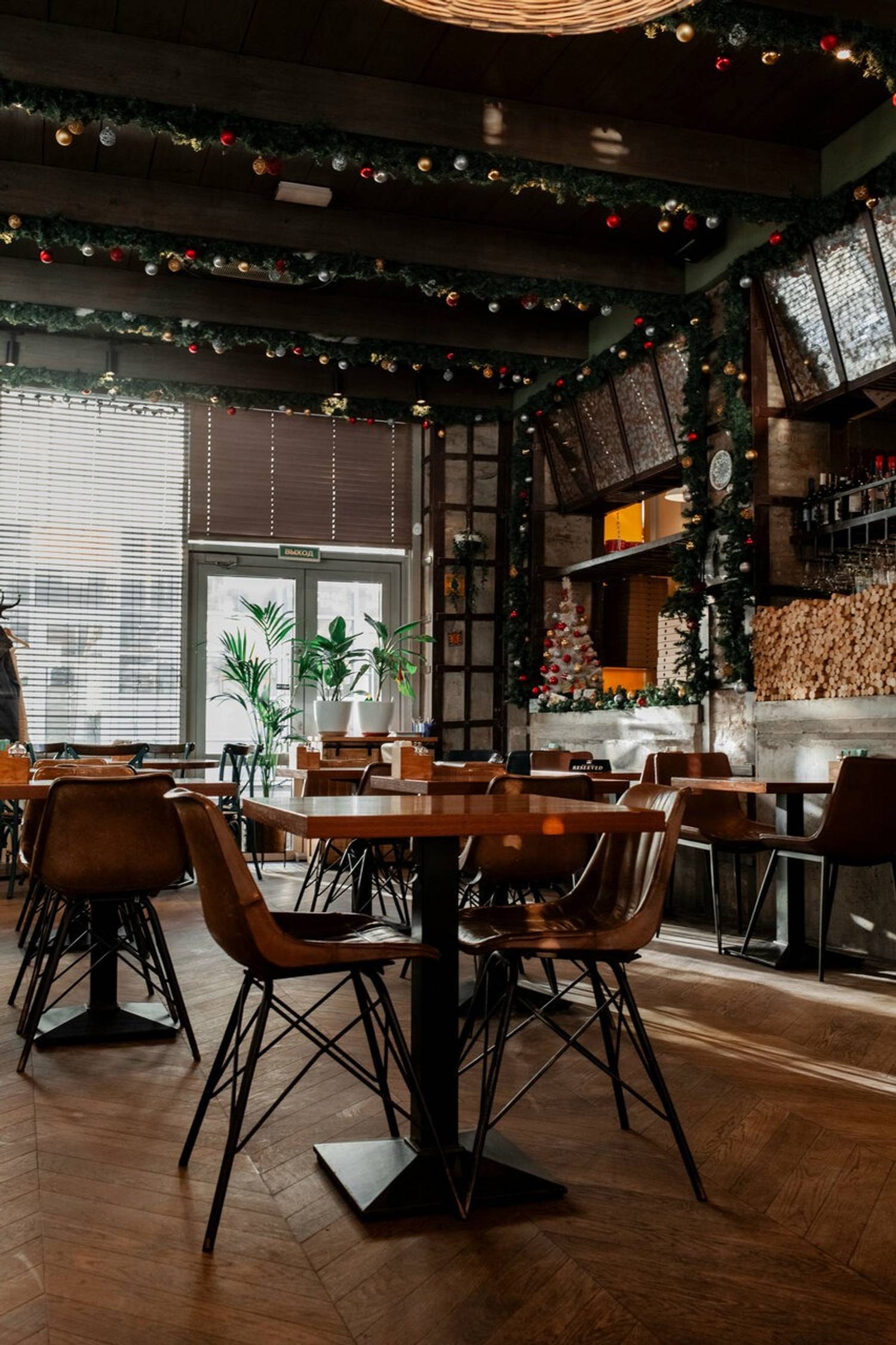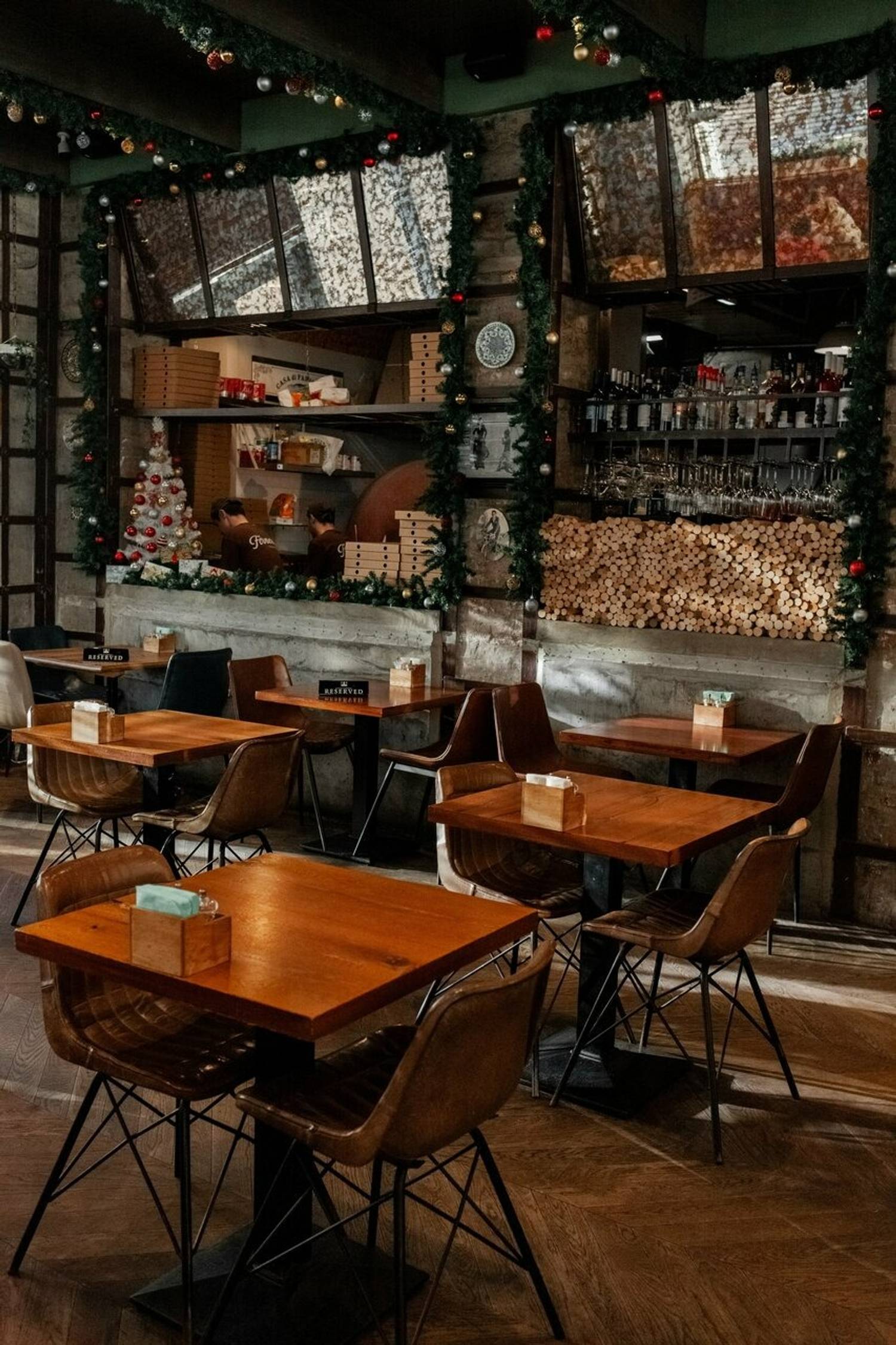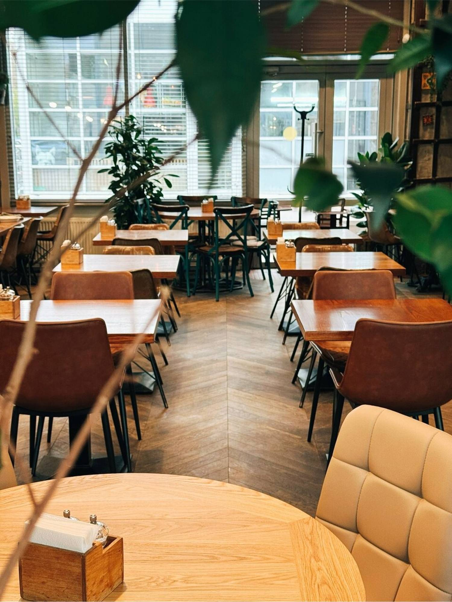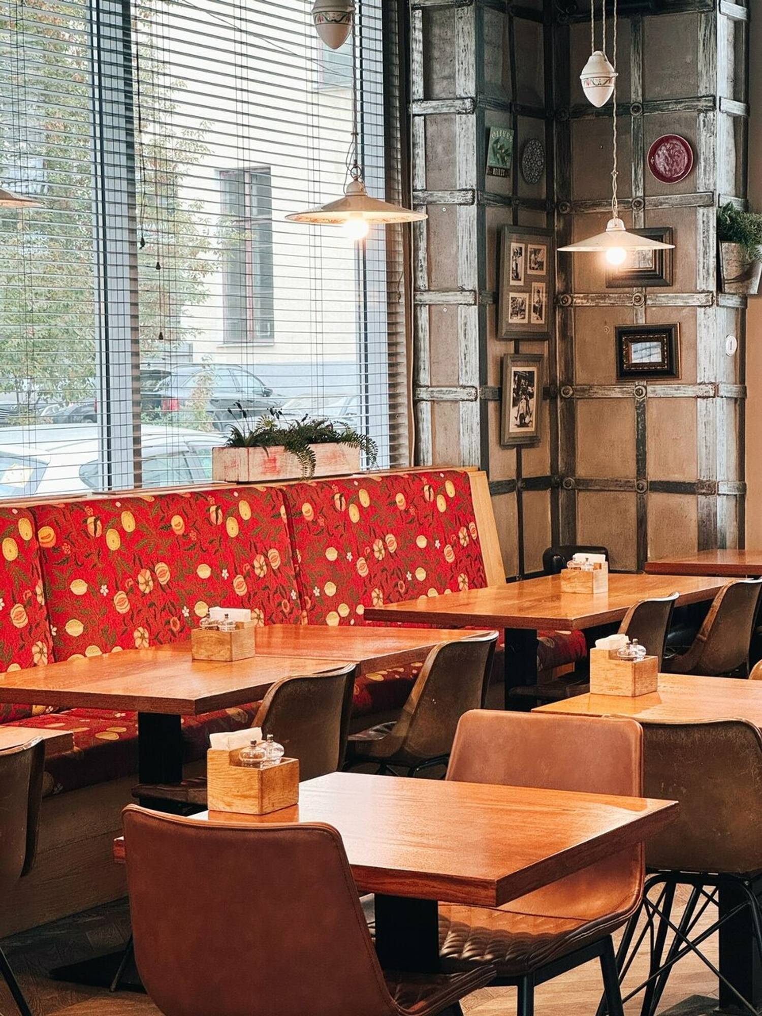 Атмосфера. Внутри — теплая палитра оттенков: коричневый, карамельный и оранжевый создают уютное настроение. В глубине зала работает открытая кухня, за которой можно наблюдать. Столики из светлого дерева расставлены вдоль окон, а в центре — стол рядом с диваном, обитым гобеленами с оленьим рисунком. Винтажные картины в темно‑дубовых рамах, декоративные тарелки на стенах и стеллажи с дровами добавляют интерьеру характер.