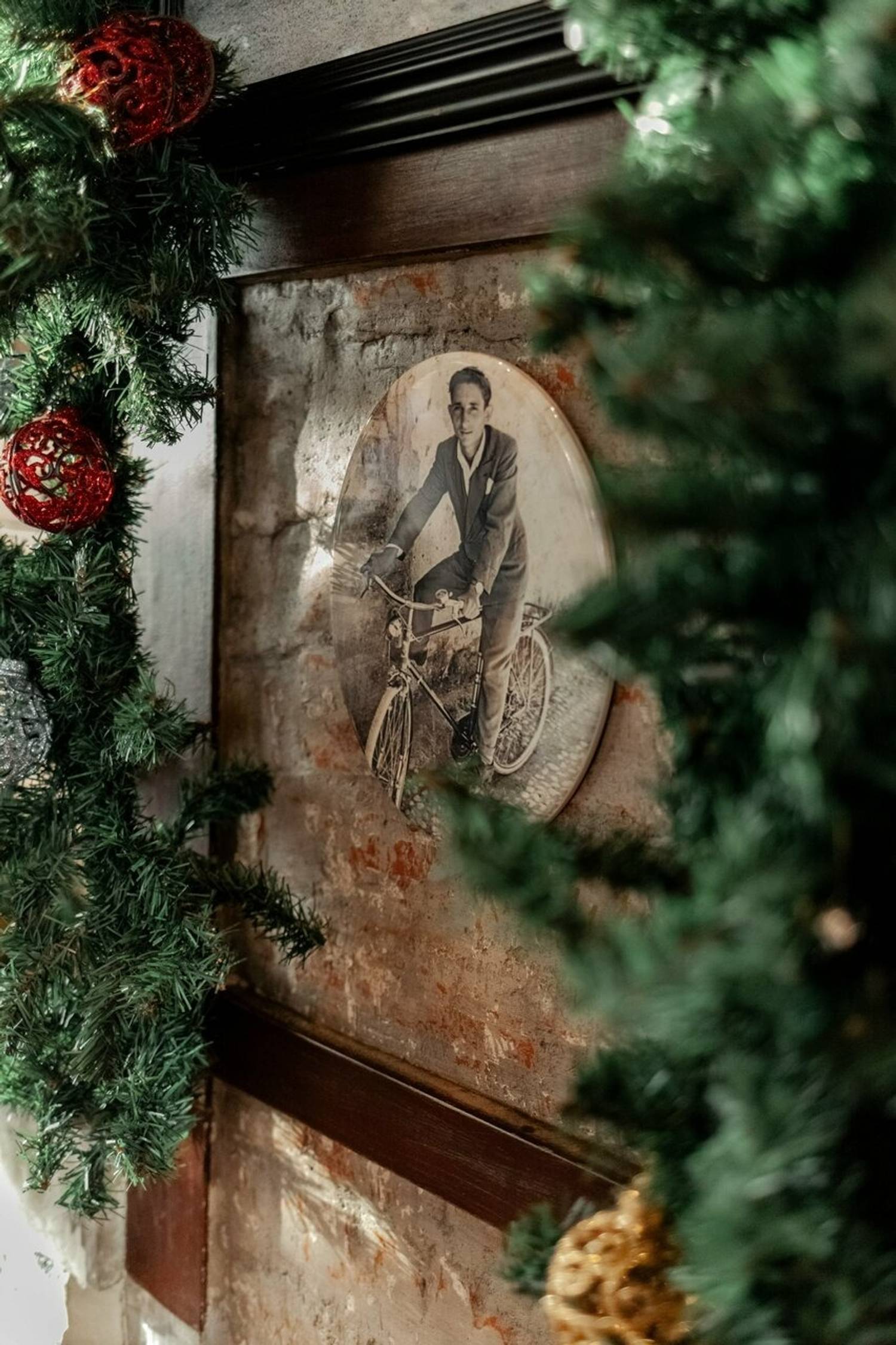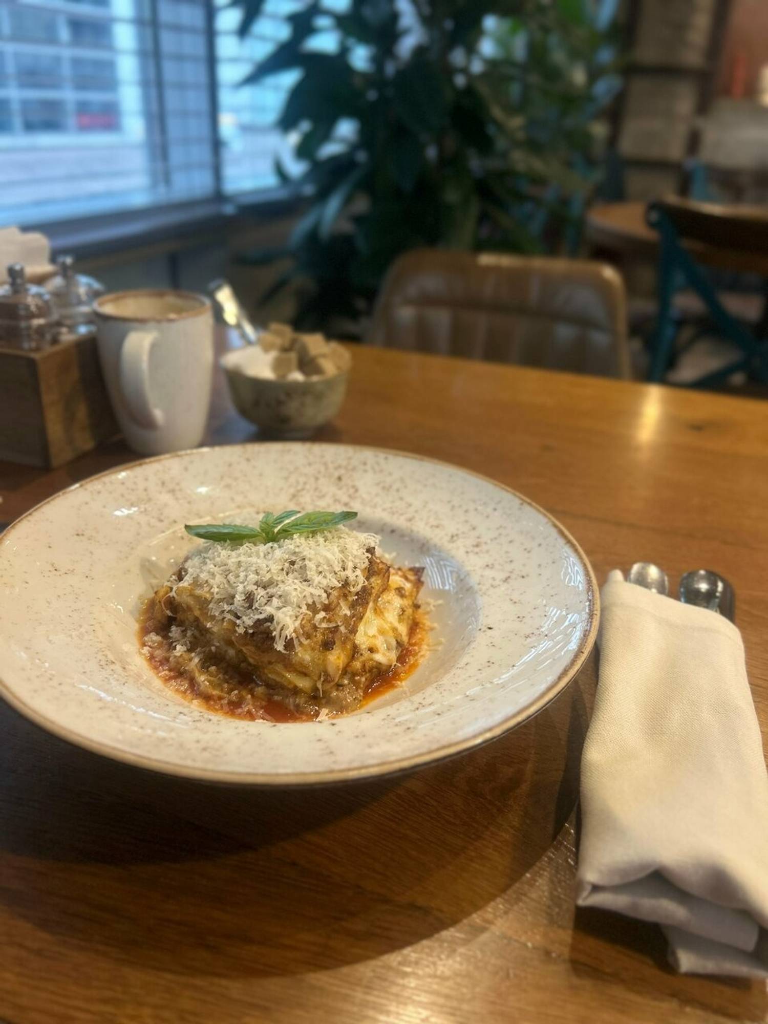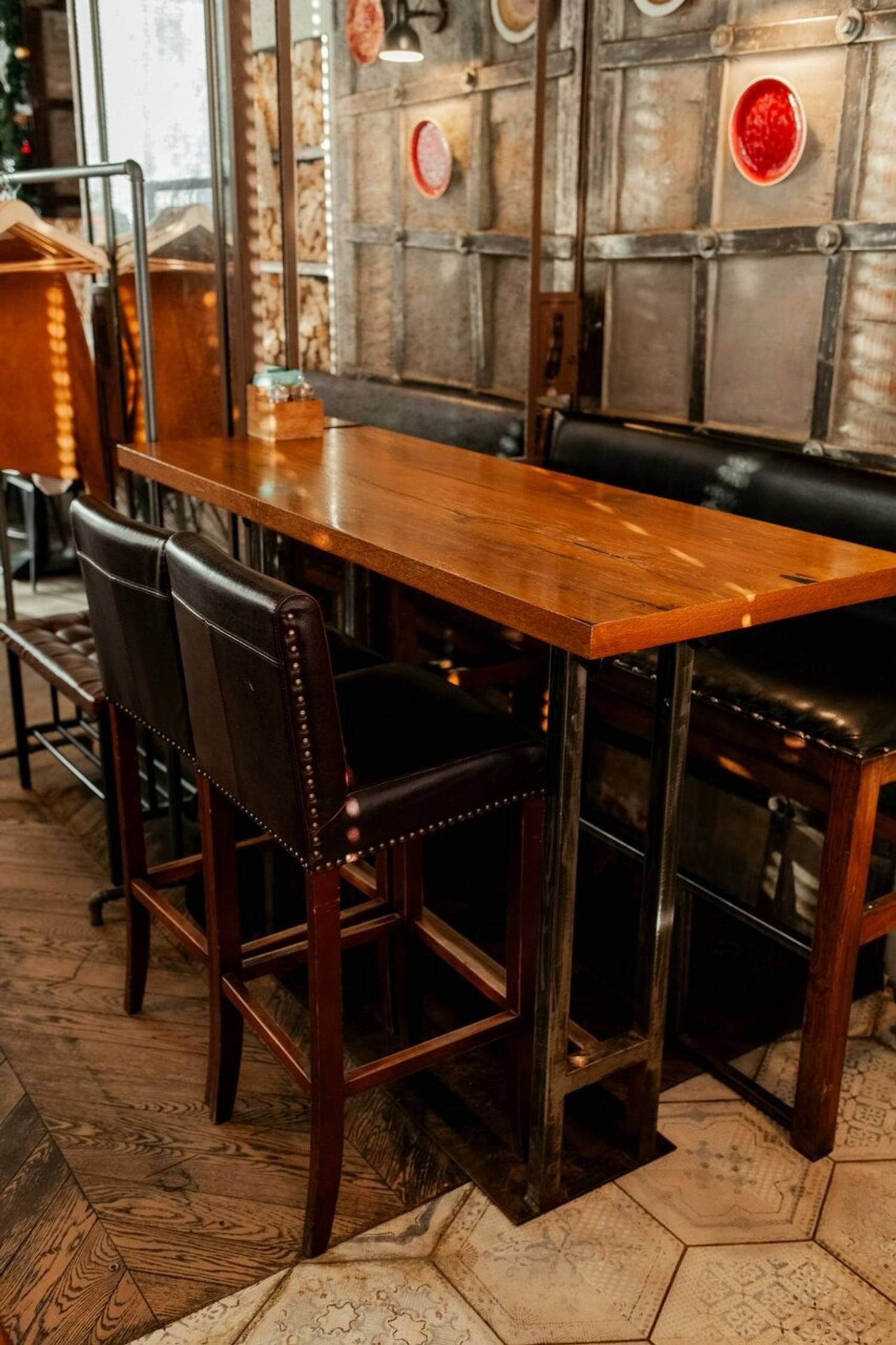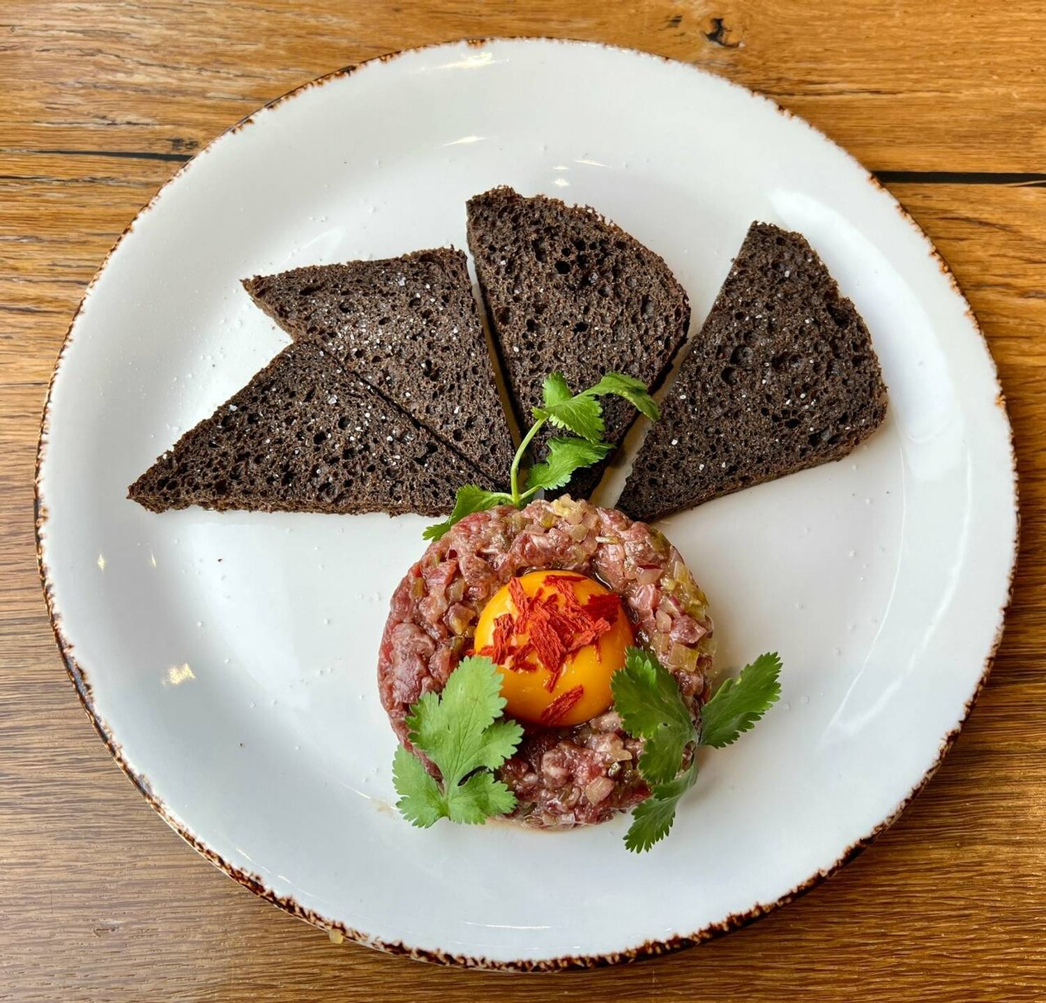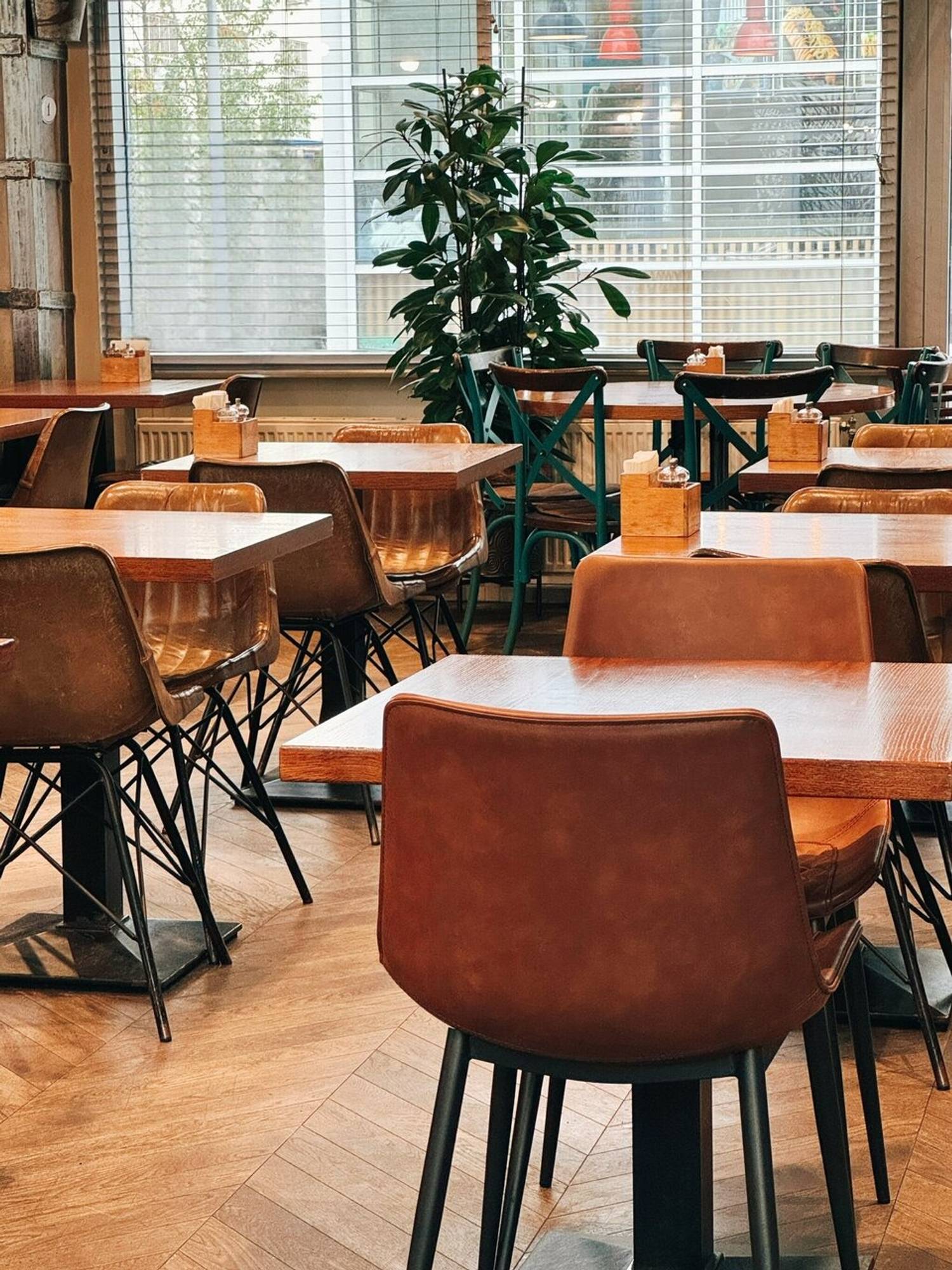 Атмосфера. Внутри — теплая палитра оттенков: коричневый, карамельный и оранжевый создают уютное настроение. В глубине зала работает открытая кухня, за которой можно наблюдать. Столики из светлого дерева расставлены вдоль окон, а в центре — стол рядом с диваном, обитым гобеленами с оленьим рисунком. Винтажные картины в темно‑дубовых рамах, декоративные тарелки на стенах и стеллажи с дровами добавляют интерьеру характер.