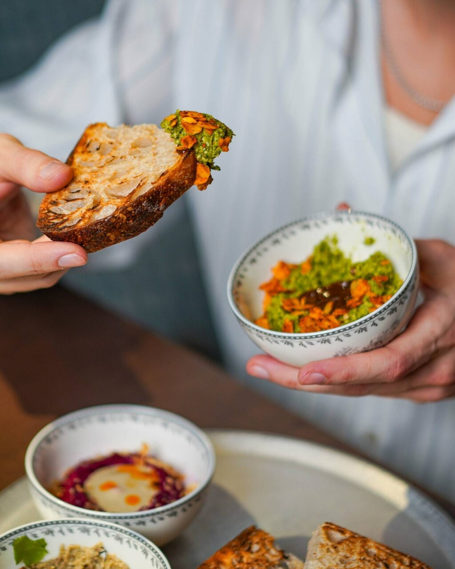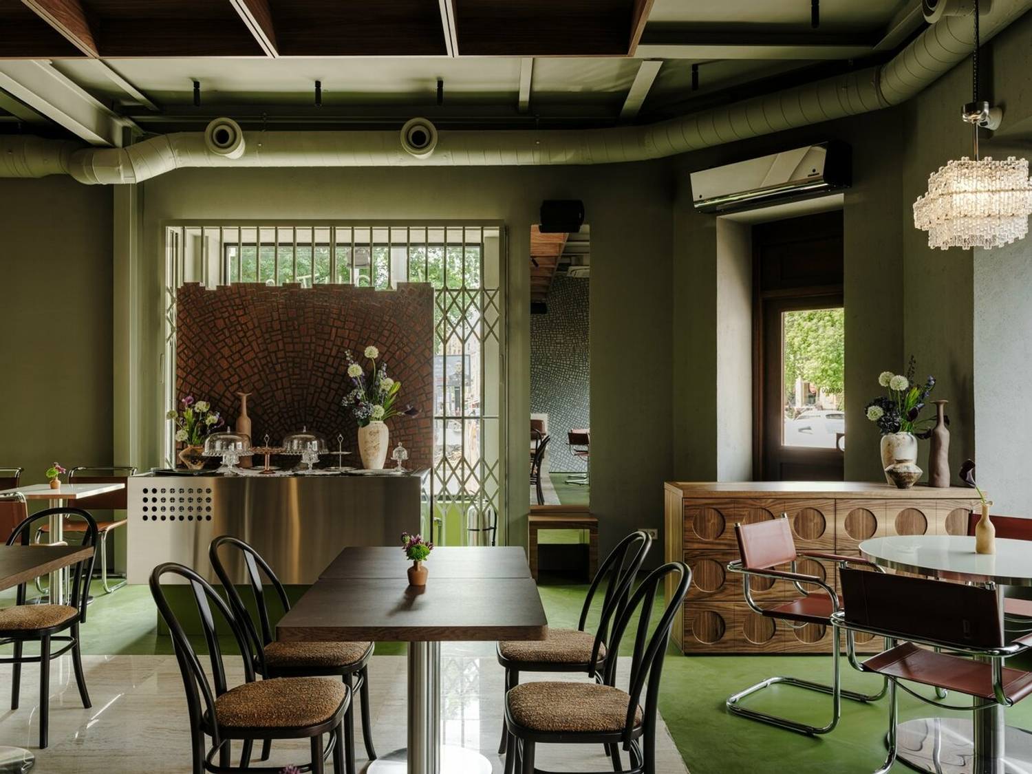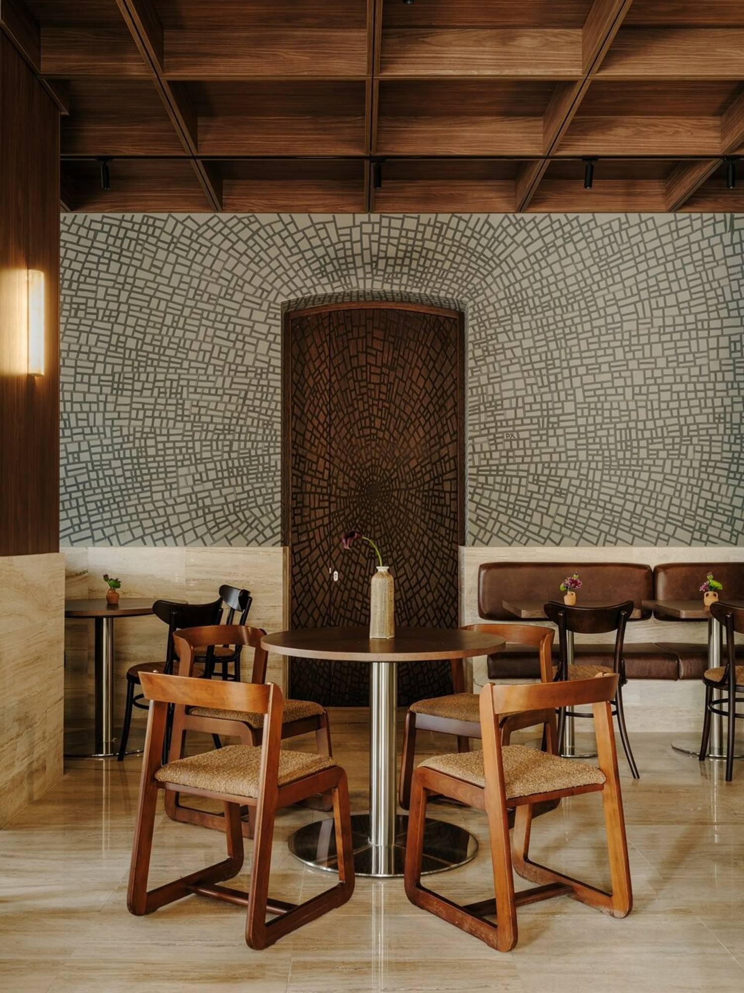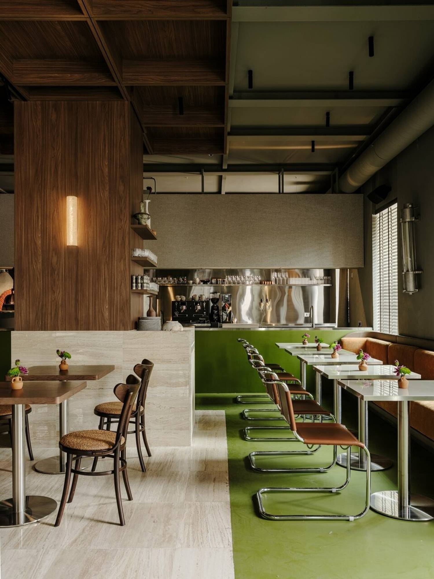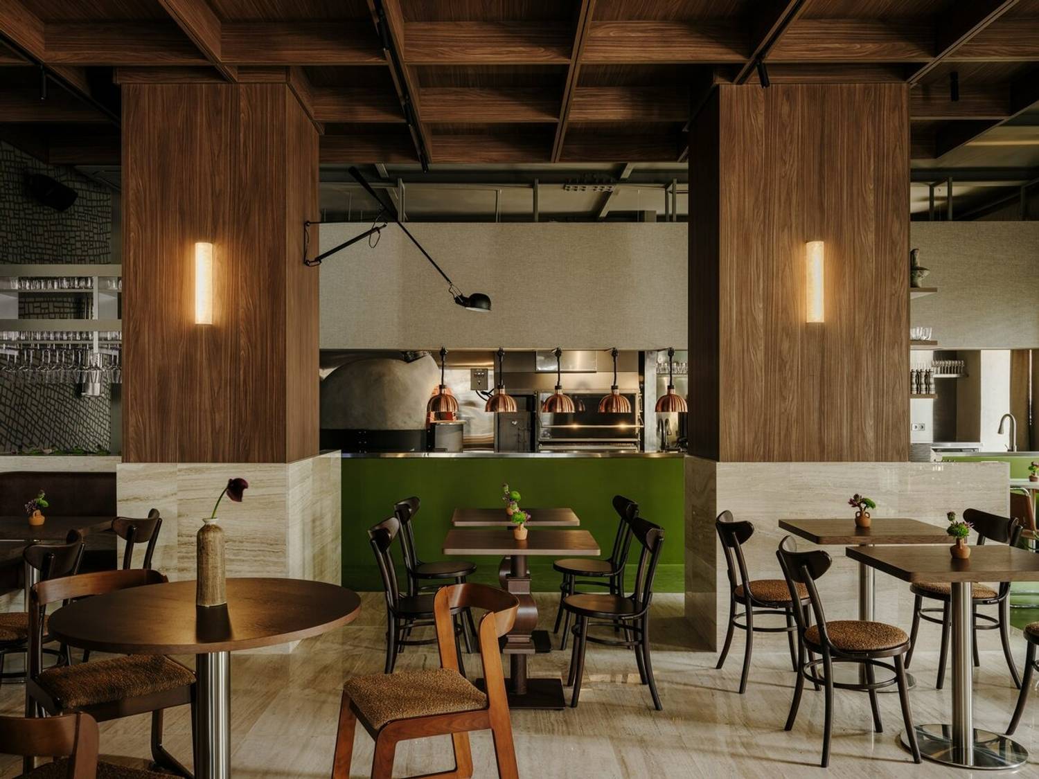 Атмосфера. Здесь чувствуется бодрый городской ритм: зал живет, разговоры рядом, музыка на фоне, а к выходным становится особенно шумно. Пространство собрано на контрастах: современная лаконичность, строгие линии и матовые поверхности соседствуют с деревом и мебелью с ретро-нотками. В центре внимания дровяная печь, она задает тон всему интерьеру. Посадка плотная, столики стоят близко, поэтому вечер легко превращается в общий гул. Стол лучше бронировать заранее, а визит планировать так, чтобы не ограничиваться лимитом по времени.