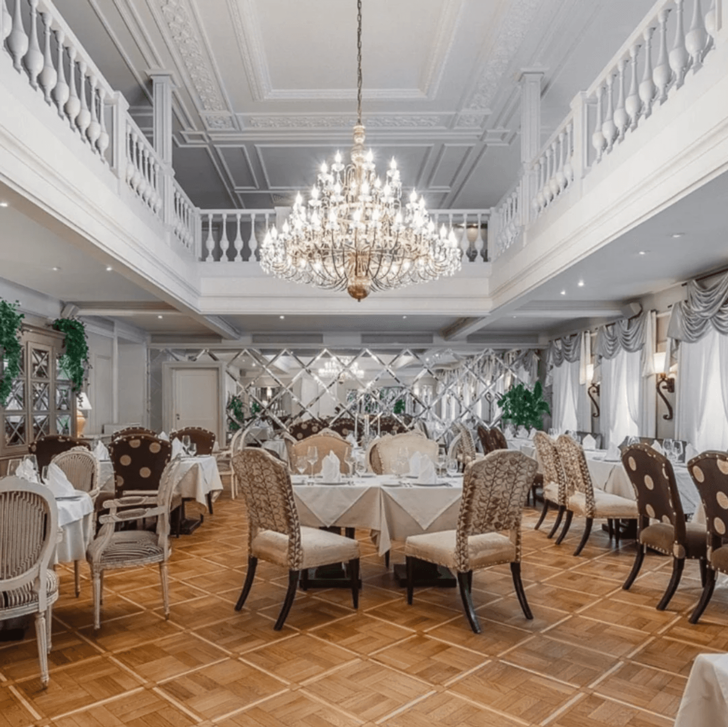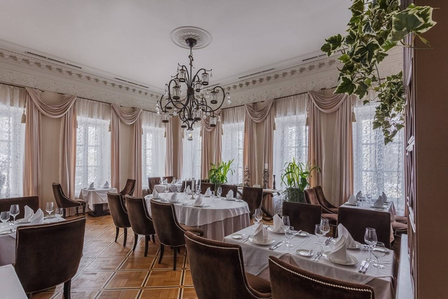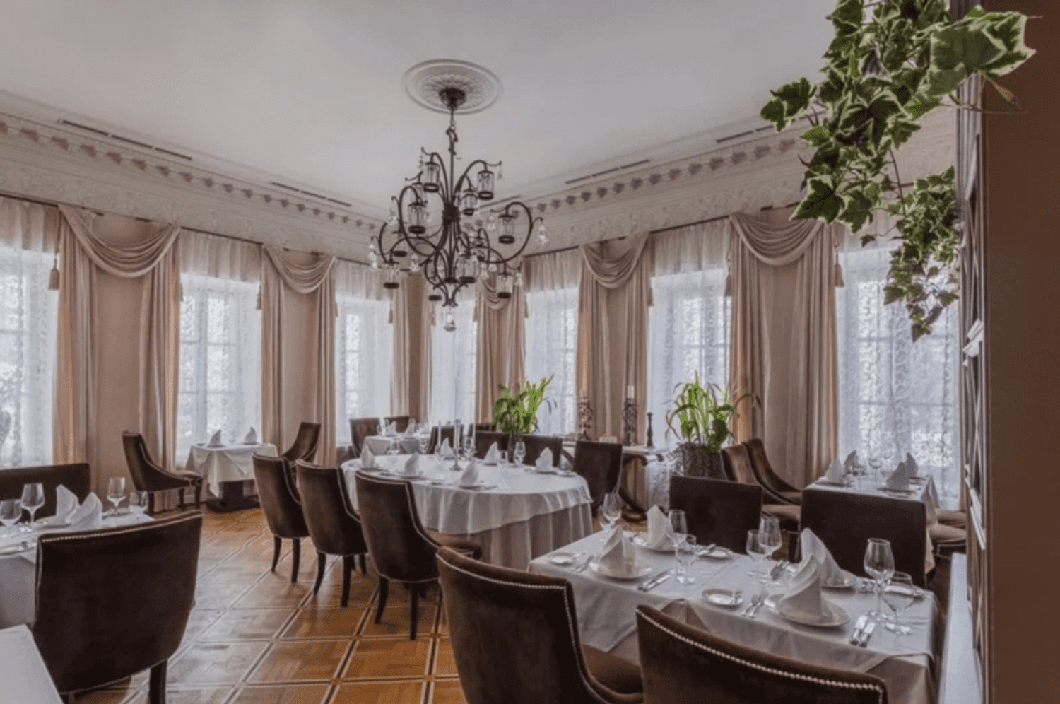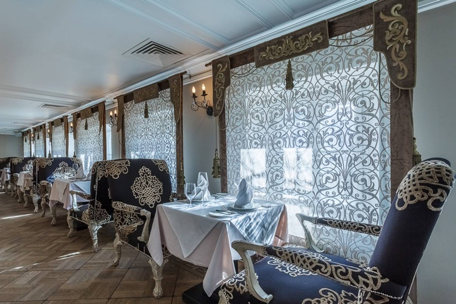 Атмосфера. В трехэтажном здании девять залов ресторана украшены дизайнерскими люстрами с позолотой, зеркалами в золоченых рамах, мебелью в стиле XIX века и фрагментами старинного паркета. По вечерам в ресторане проходят выступления цыганского ансамбля, джазовые концерты, караоке и танцевальные программы.