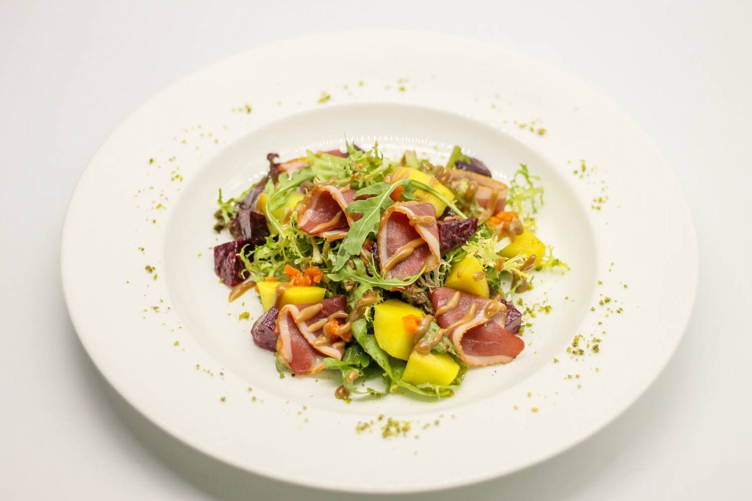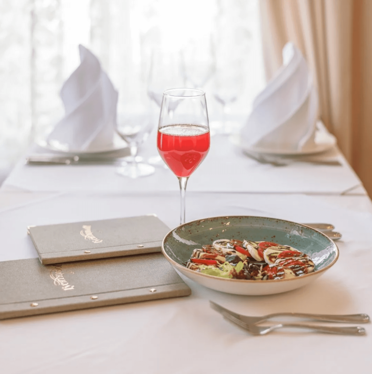 Еда и напитки. В меню — блюда русской кухни в авторской интерпретации: оливье с мясом перепелов, фаршированные утки, заячий паштет с тыквенным мармеладом, котлеты из кролика и стерлядь на картофельном пюре. На десерт фисташковый рулет и окрошка 18+. Из напитков — чай из самовара с традиционными сладостями, обширная винная карта, настойки, хреновуха, клюквенная, крепкий алкоголь.