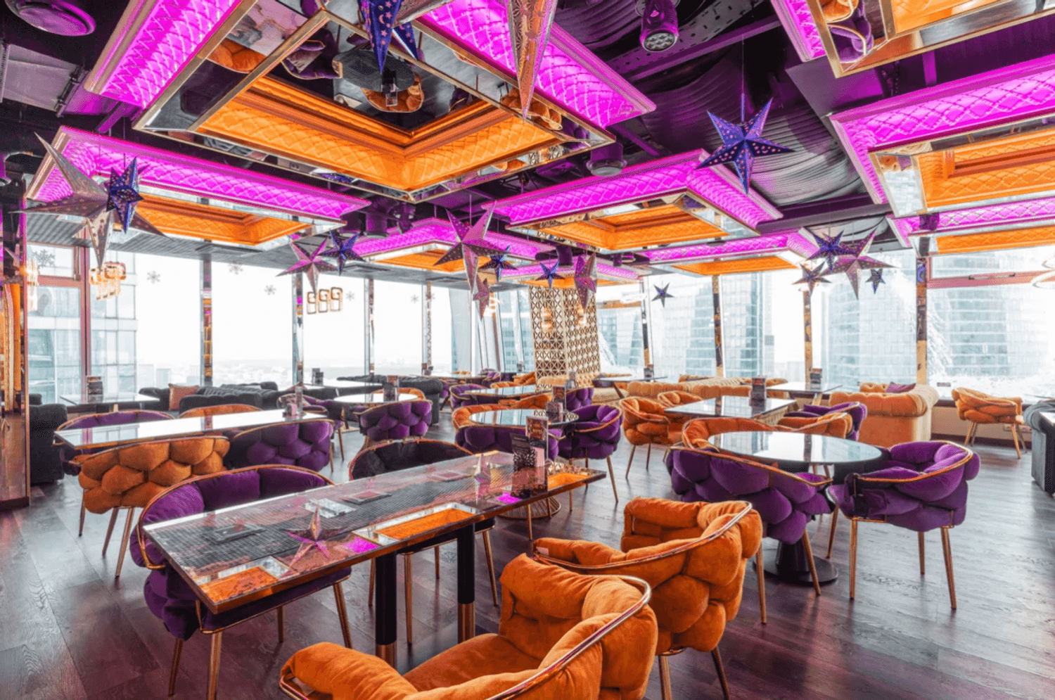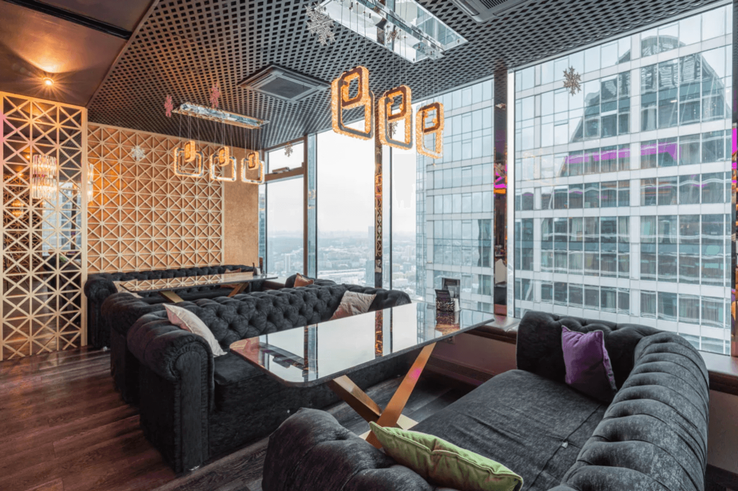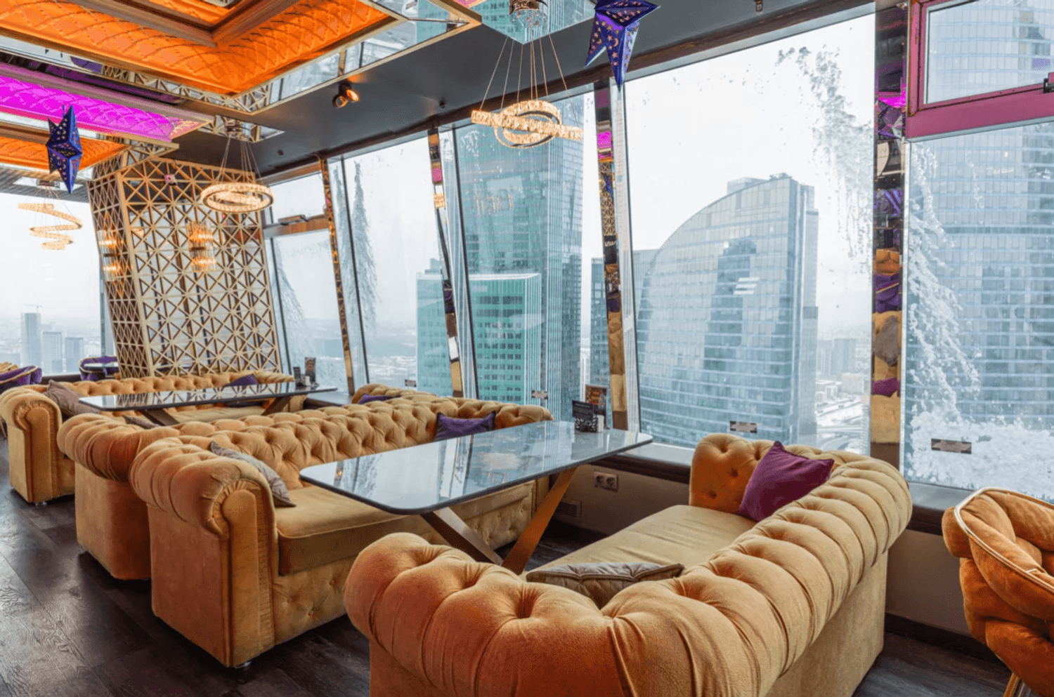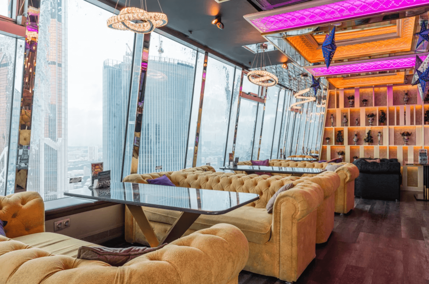 Атмосфера. Пространство с современным дизайном и панорамными окнами создает ощущение пребывания прямо над облаками. Стильная яркая мебель, продуманное освещение, вид на город и его огни — все это формирует ощущение того, что ты на вершине мира и вся Москва принадлежит тебе.