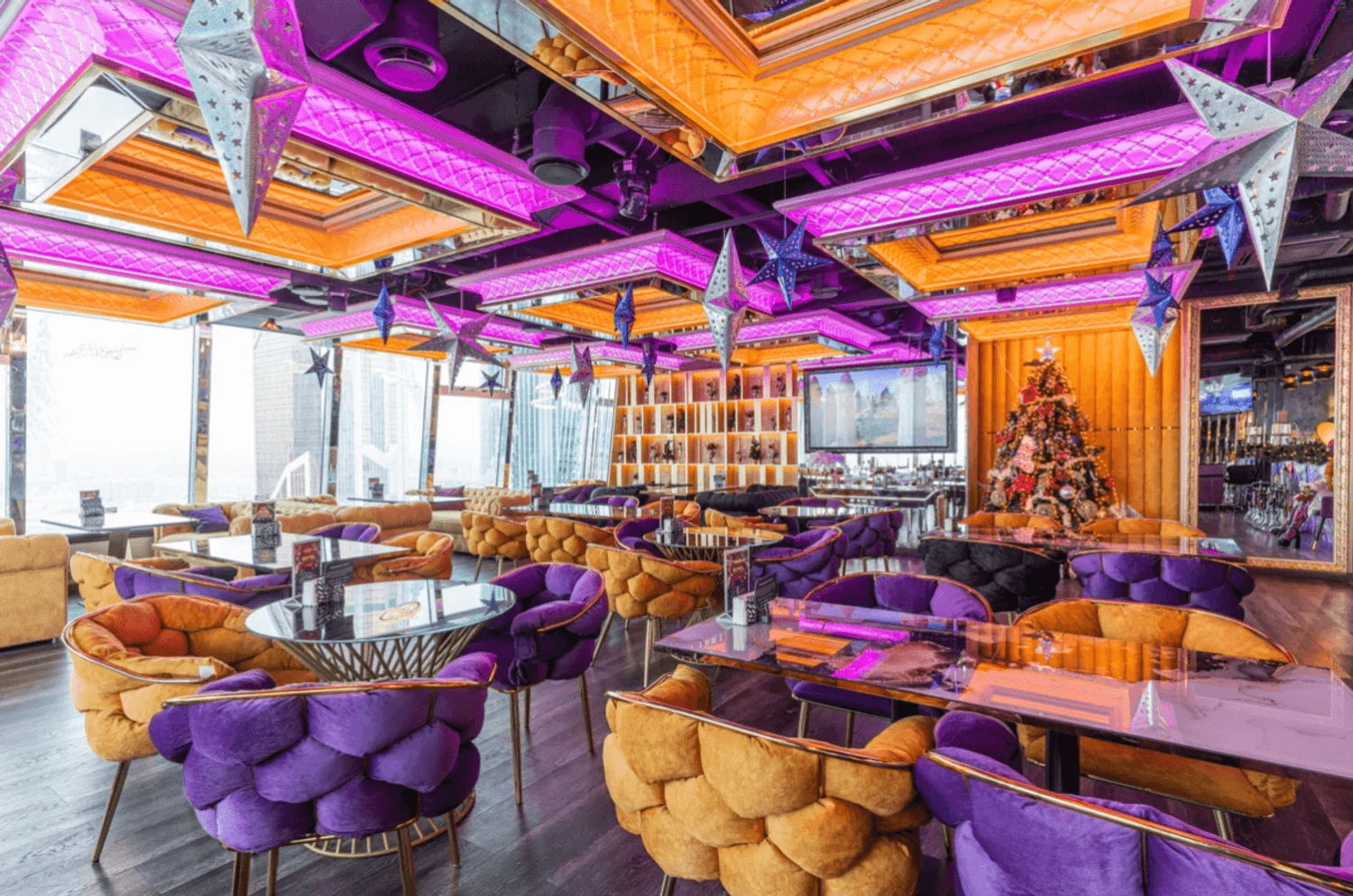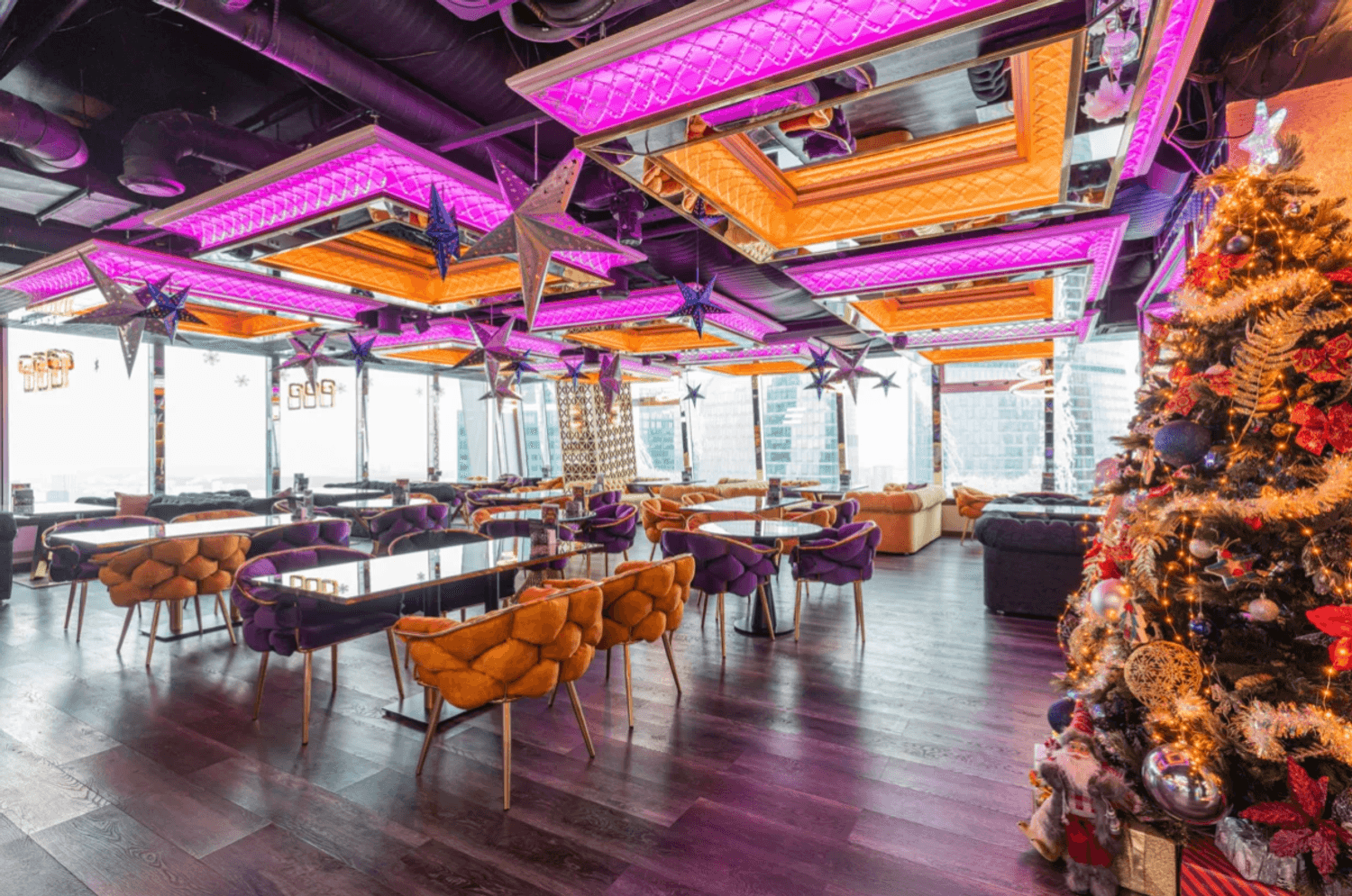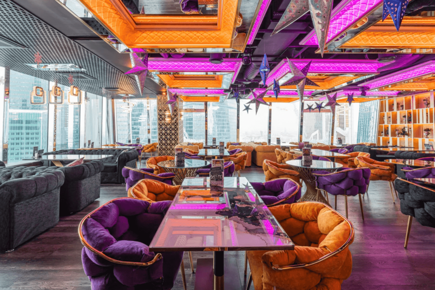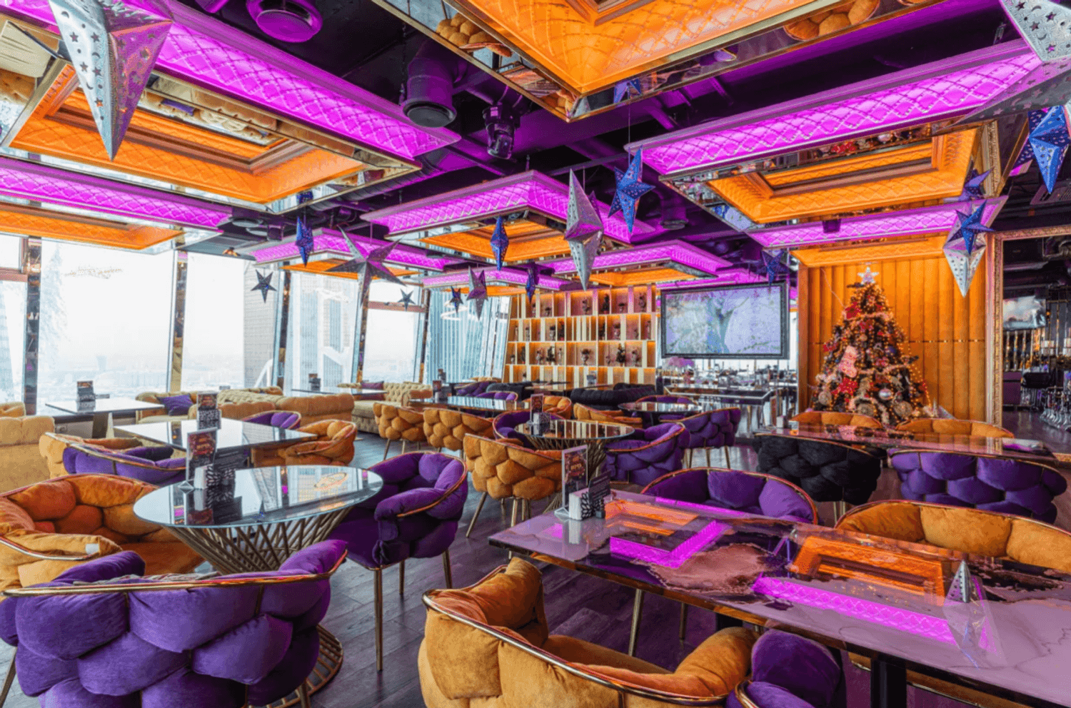 Атмосфера. Пространство с современным дизайном и панорамными окнами создает ощущение пребывания прямо над облаками. Стильная яркая мебель, продуманное освещение, вид на город и его огни — все это формирует ощущение того, что ты на вершине мира и вся Москва принадлежит тебе.