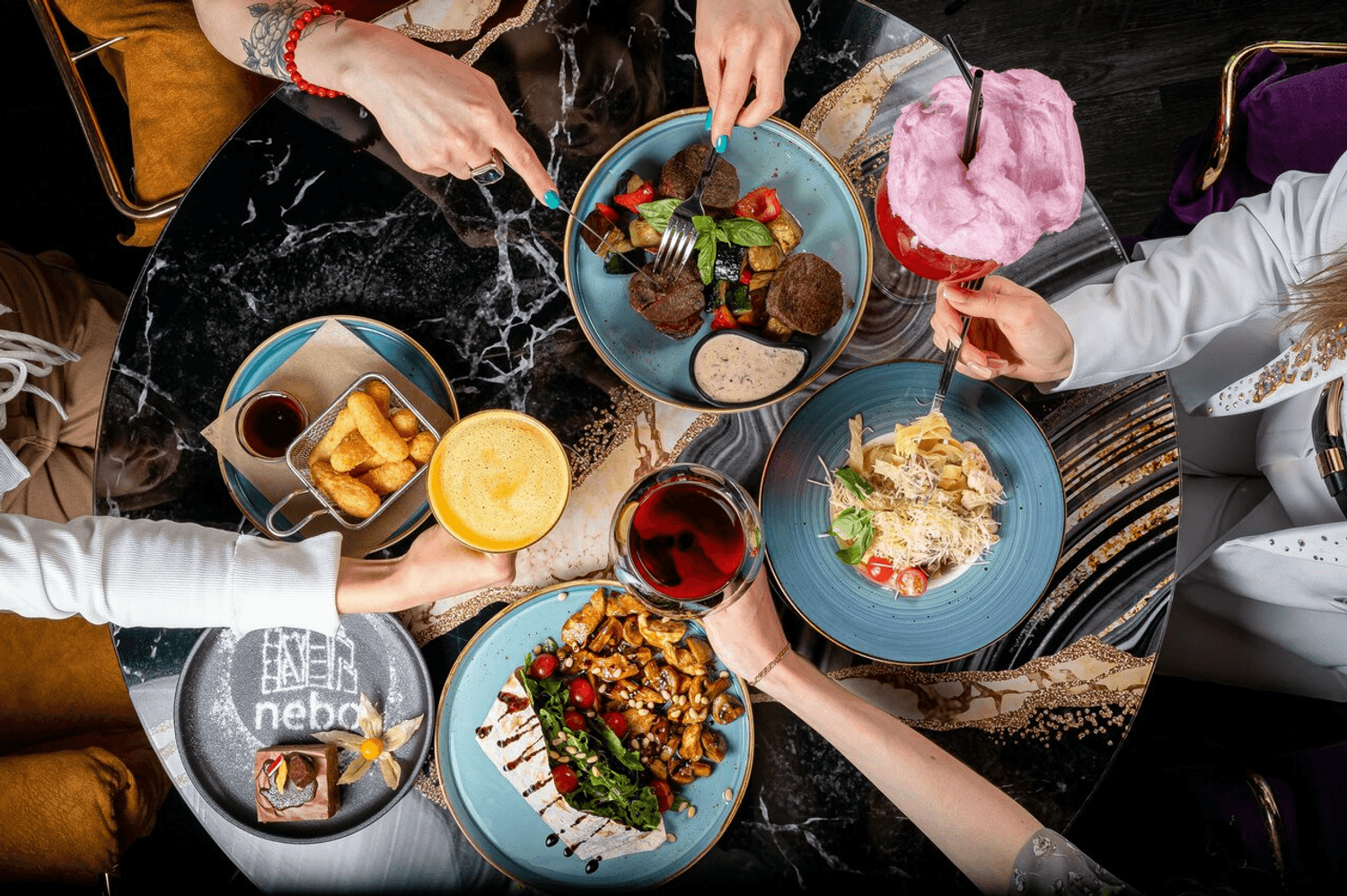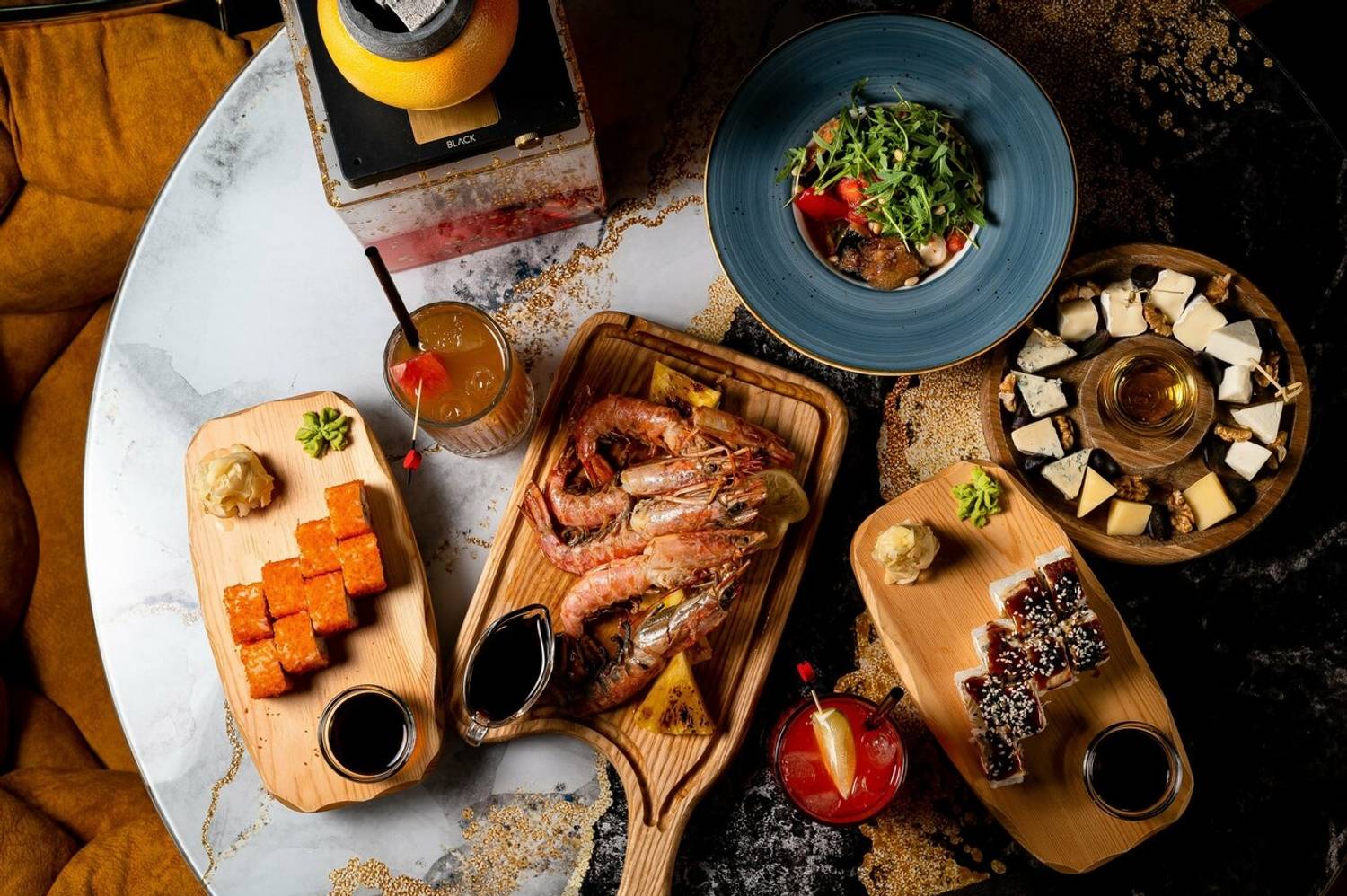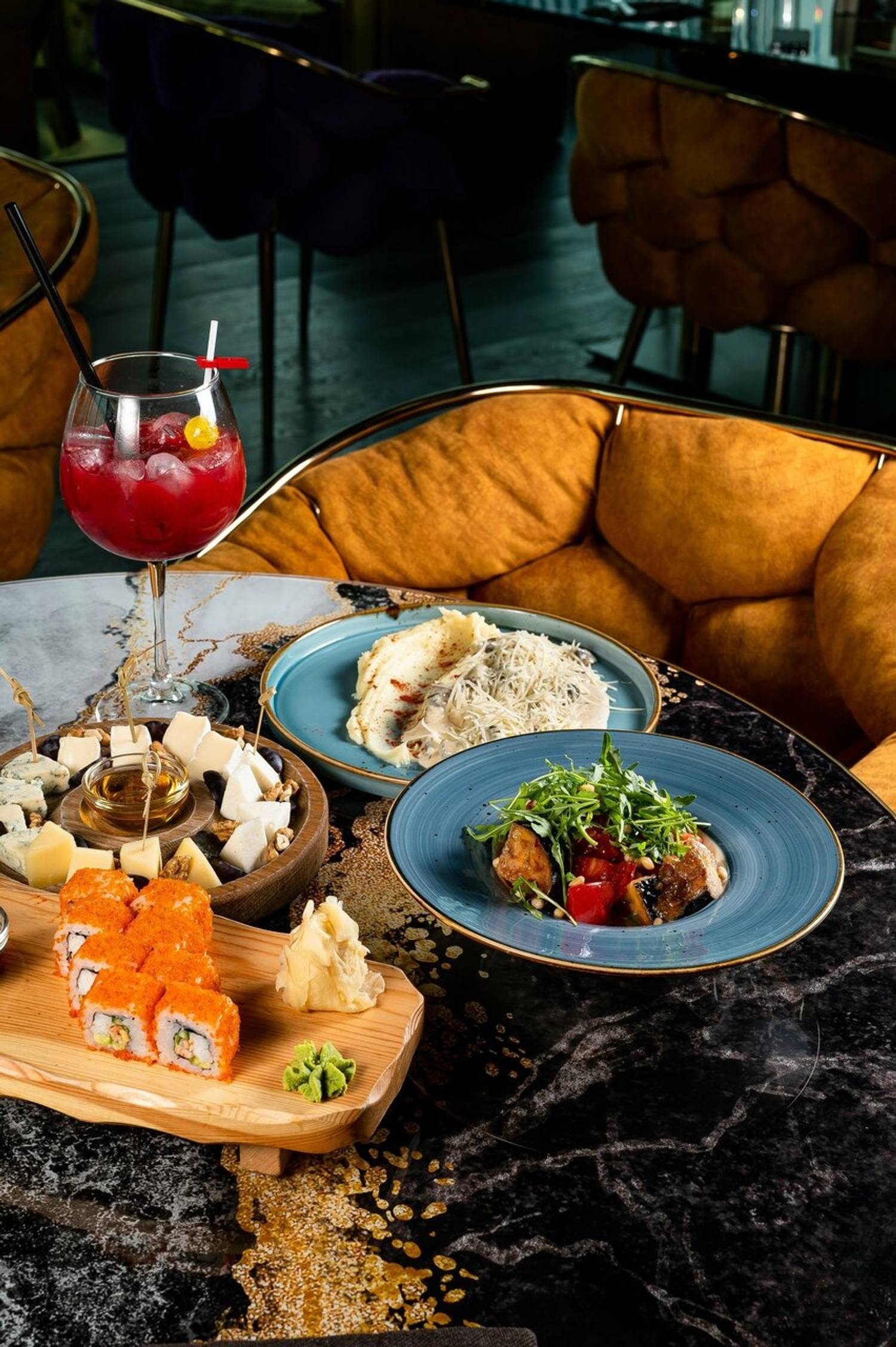 Еда и напитки. В меню сочетаются средиземноморские и японские мотивы. Шеф делает ставку на блюда, где сохраняется естественный вкус качественных продуктов — от свежих морепродуктов до мраморной говядины. Барная карта включает авторские коктейли по эксклюзивным рецептам и классические сочетания.