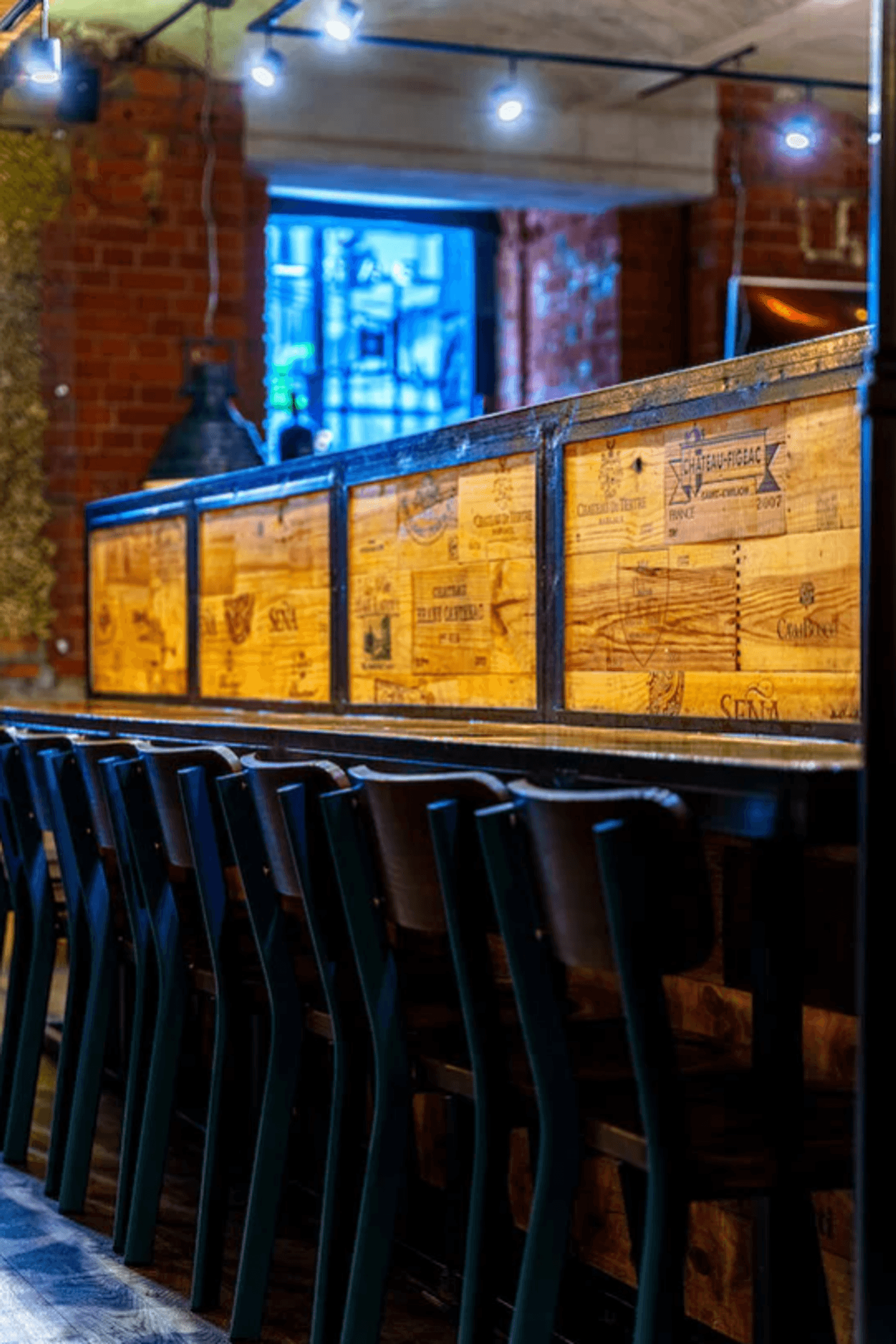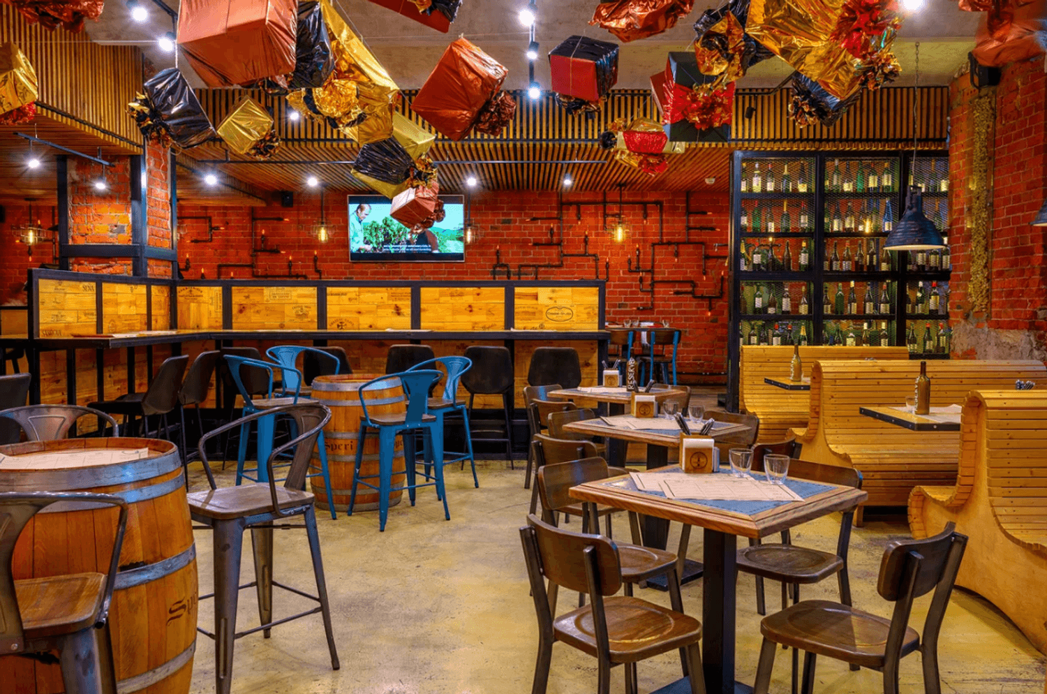 Атмосфера. Интерьер выполнен с использованием дерева и металла, что создает одновременно атмосферу уюта и современности. В баре два зала: один для более оживленных встреч, а второй — для расслабленного отдыха. В декоре присутствуют и необычные вещи: например, бочки вместо столов и деревянные скамьи из электричек.