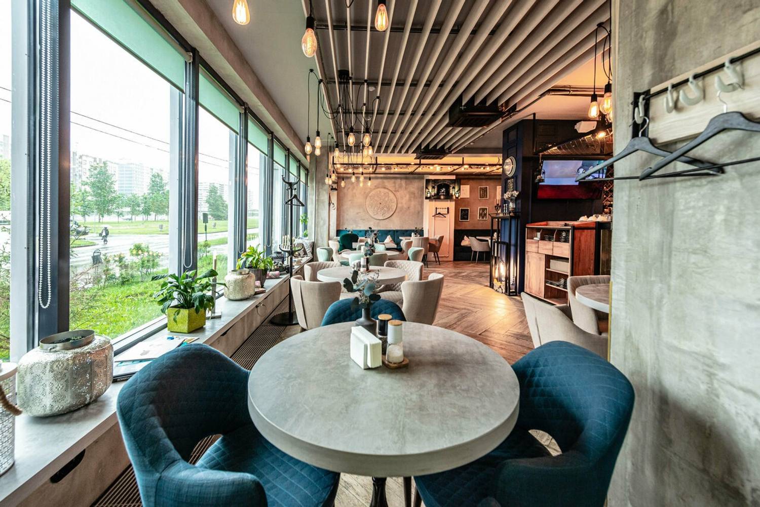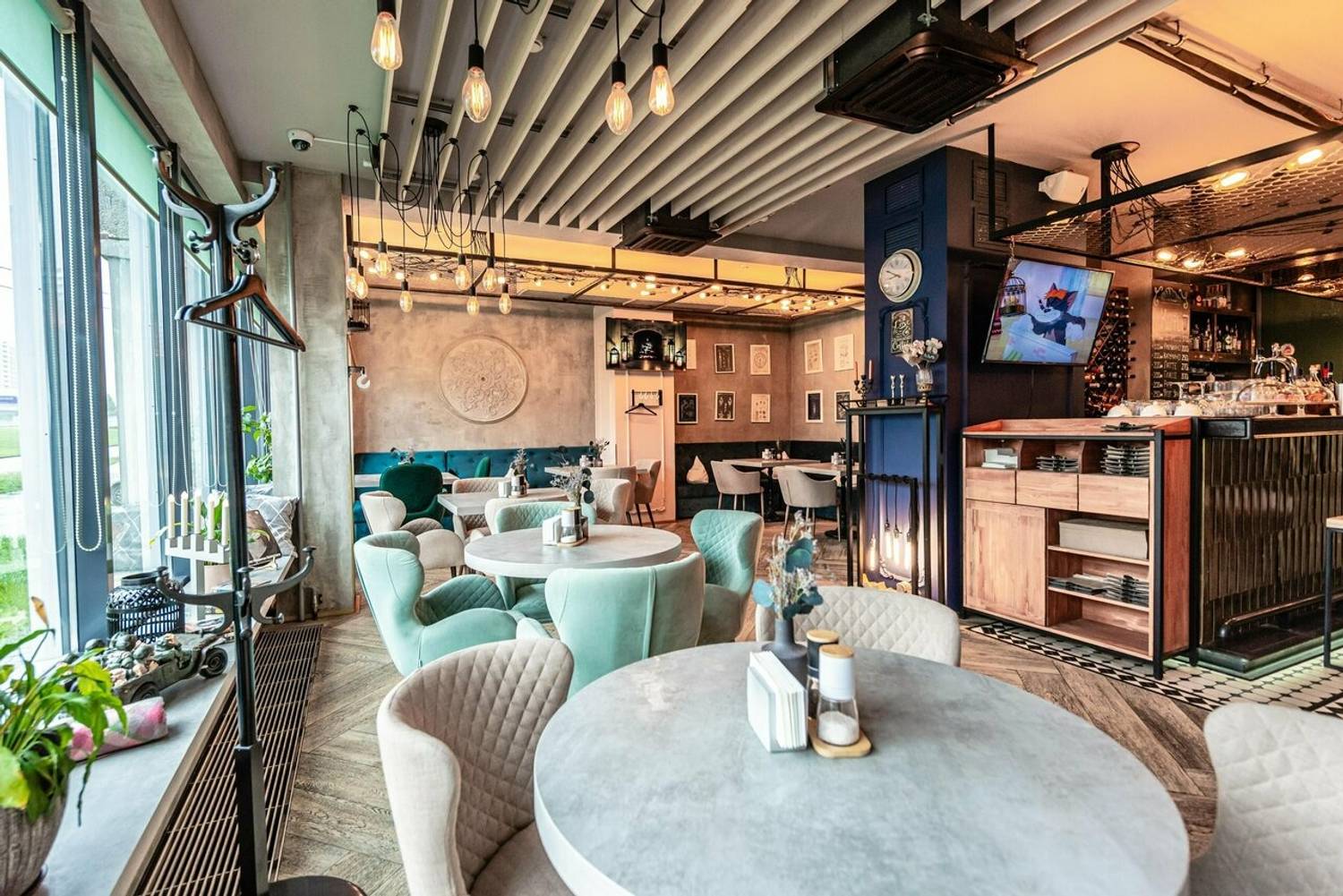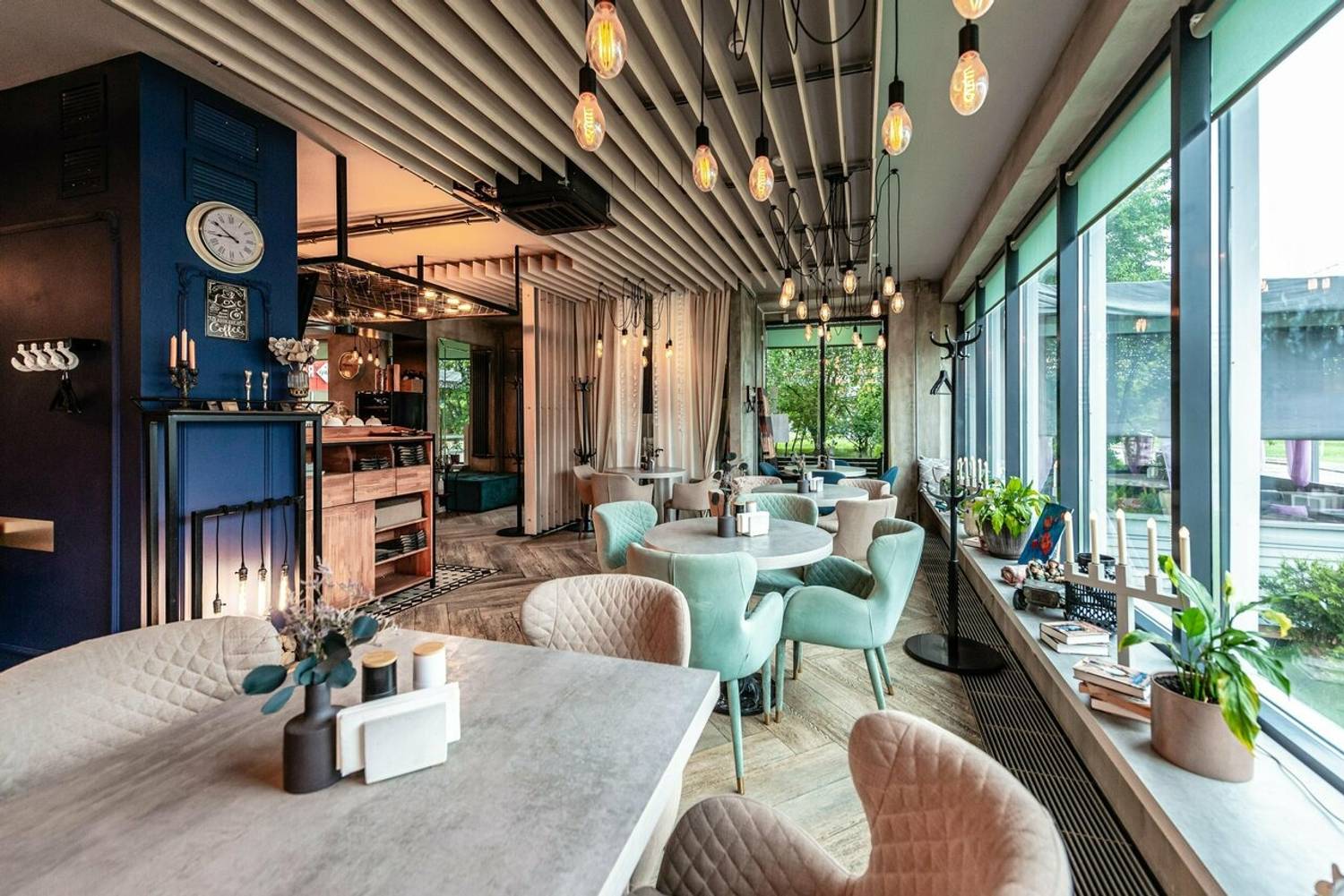 Атмосфера. Пространство создает ощущение света и спокойствия благодаря большим окнам и мягкой цветовой гамме с бирюзовыми акцентами. Детали интерьера — такие, как картины на стенах, крупные вазы на подоконниках и круглое декоративное панно, — добавляют помещению индивидуальности. Летом впечатление дополняет открытая терраса с плетеной мебелью. Обстановка располагает к неторопливому отдыху: в мягких креслах удобно провести время с книгой или в беседе за чашкой кофе.