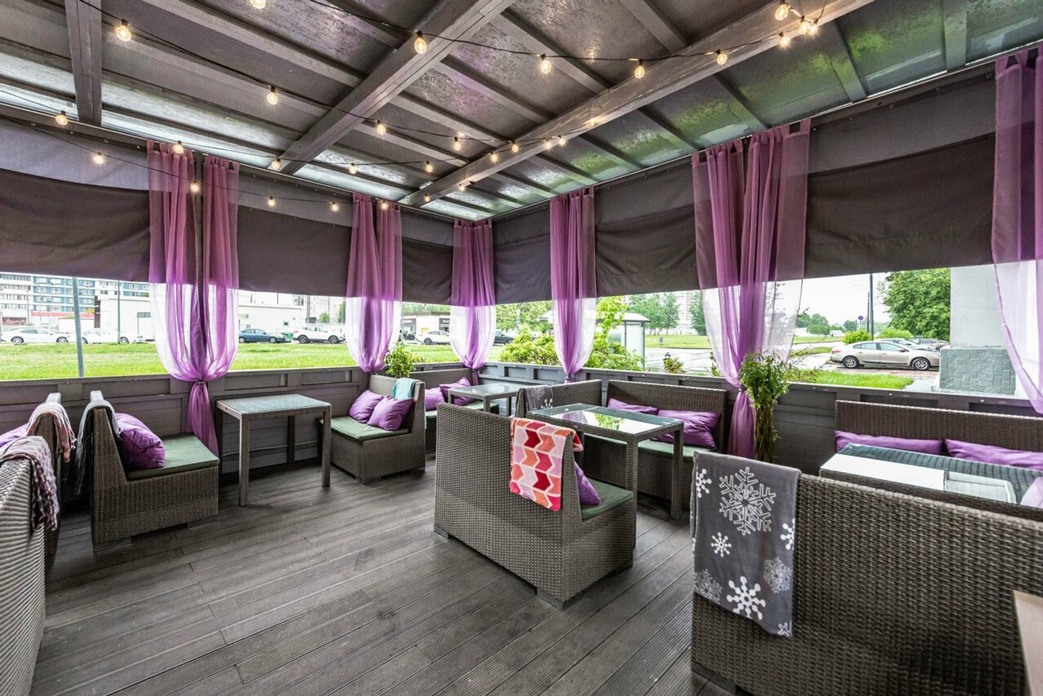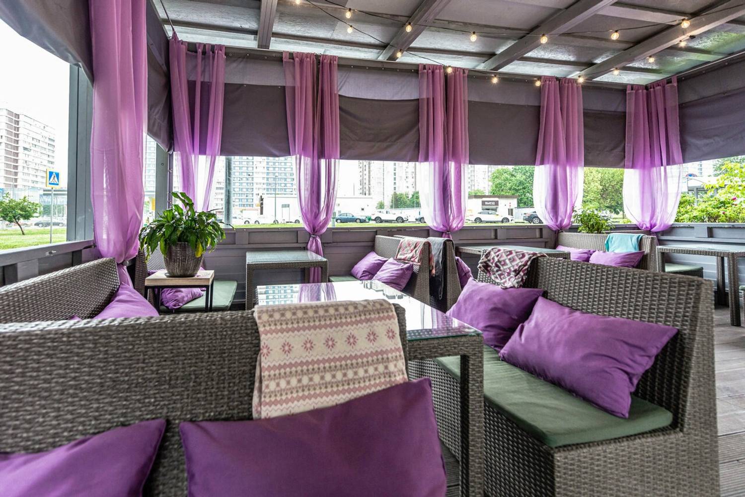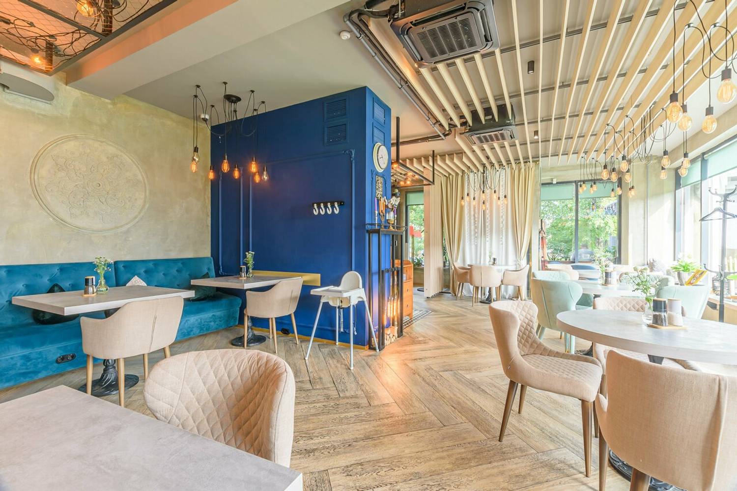 Атмосфера. Пространство создает ощущение света и спокойствия благодаря большим окнам и мягкой цветовой гамме с бирюзовыми акцентами. Детали интерьера — такие, как картины на стенах, крупные вазы на подоконниках и круглое декоративное панно, — добавляют помещению индивидуальности. Летом впечатление дополняет открытая терраса с плетеной мебелью. Обстановка располагает к неторопливому отдыху: в мягких креслах удобно провести время с книгой или в беседе за чашкой кофе.