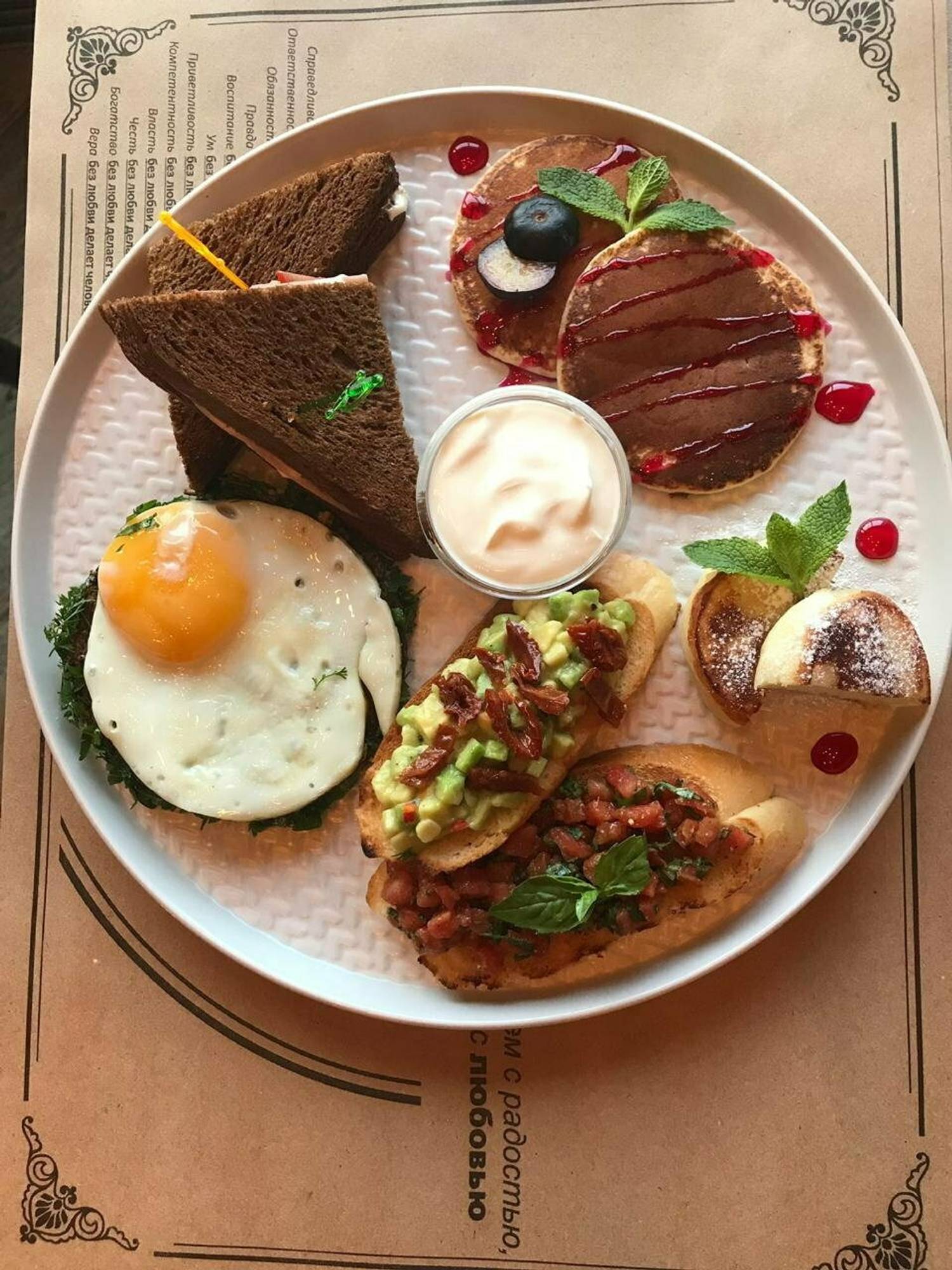 Еда и напитки. Основу меню составляют блюда, приготовленные из натуральных ингредиентов. Особое внимание уделяется выпечке: здесь можно попробовать домашний хлеб по французскому рецепту, который готовится прямо в кафе, а также различные пирожные. В заведении готовят завтраки вроде манной каши, драников с лососем и блины с курицей и сыром. На горячее готовят тыквенный крем-суп с креветками, куриную грудку с авокадо и сибаса в томатном соусе. Для маленьких гостей есть суп с лапшой и фрикадельками, домашние наггетсы, овощные палочки с соусом блю чиз. К блюдам заказывают классические коктейли, вино, пиво и крепкий алкоголь.