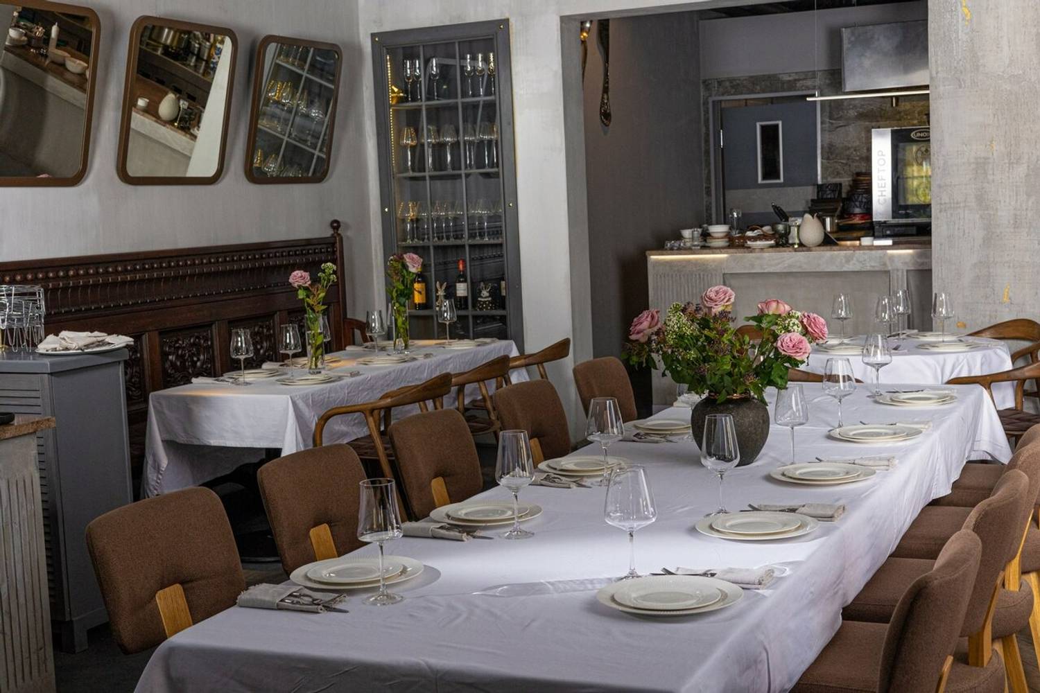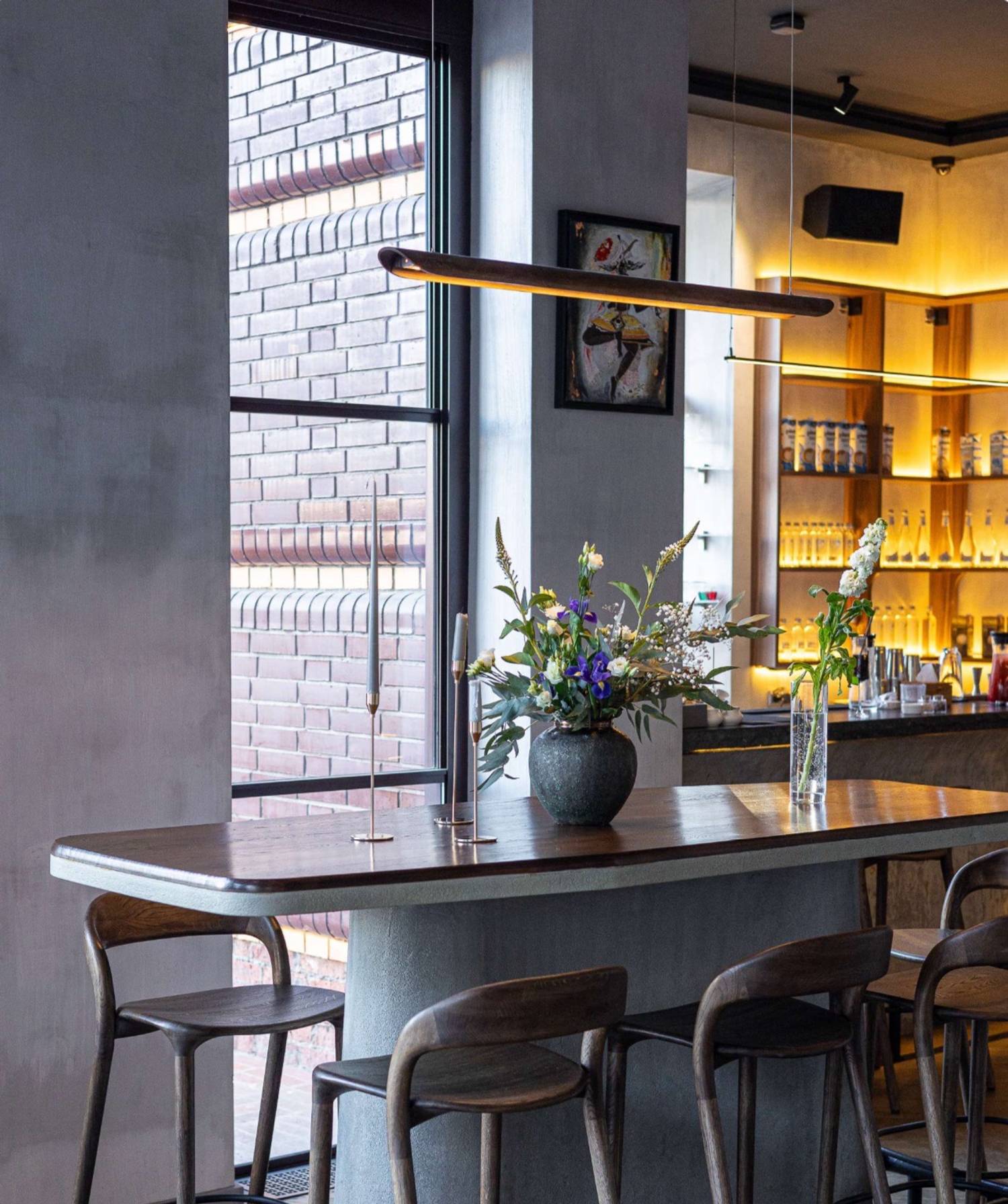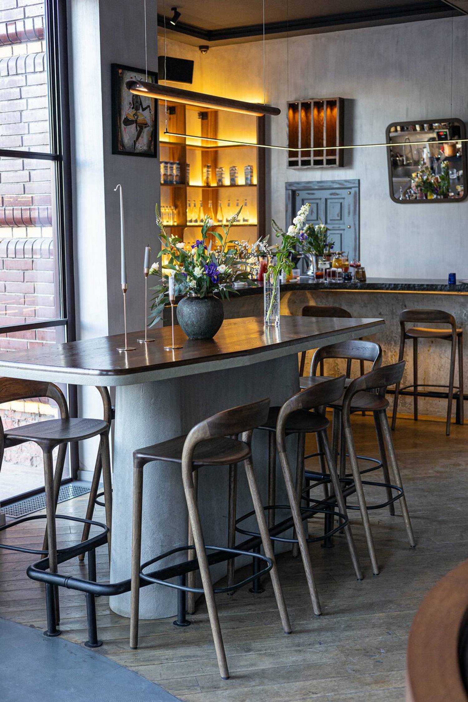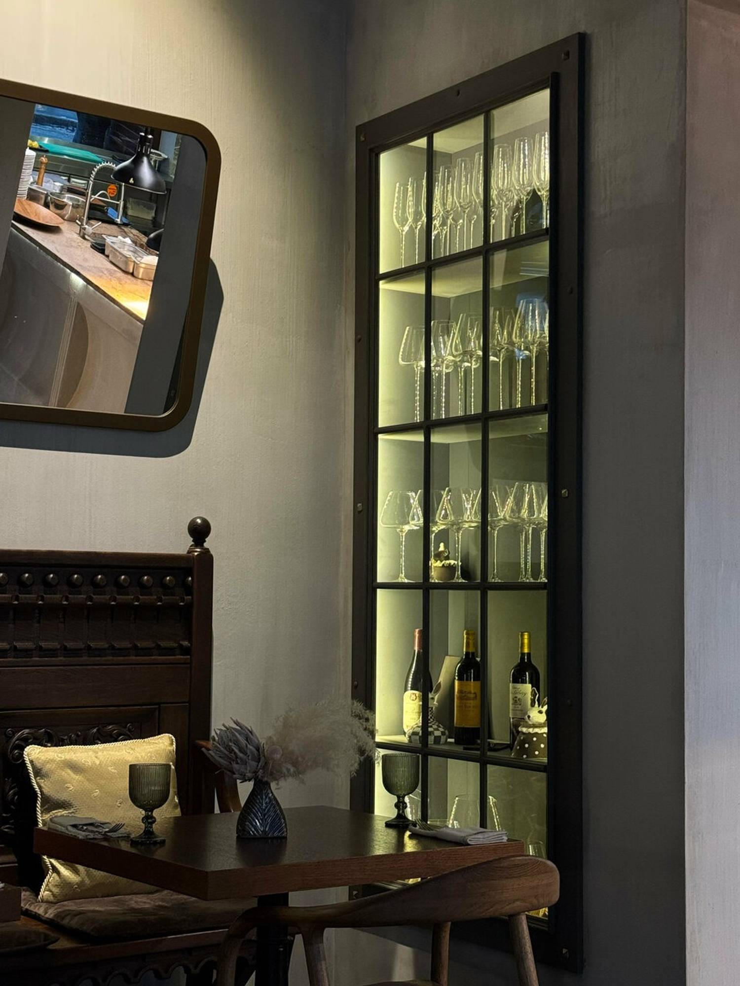 Атмосфера. Лаконичный и сдержанный интерьер с темно-коричневой мебелью. Благородная серая палитра, настенные зеркала в рамах и каменная барная стойка создают элегантную обстановку. Световые акценты, например, подсвеченные стеллажи с бокалами, и открытая дровяная печь добавляют динамики. Здесь комфортно как за большим дубовым столом в компании, так и на полукруглом диване или летней веранде. Каждую пятницу здесь можно послушать живую музыку. Для детей по выходным проводят мастер-классы по приготовлению пиццы.