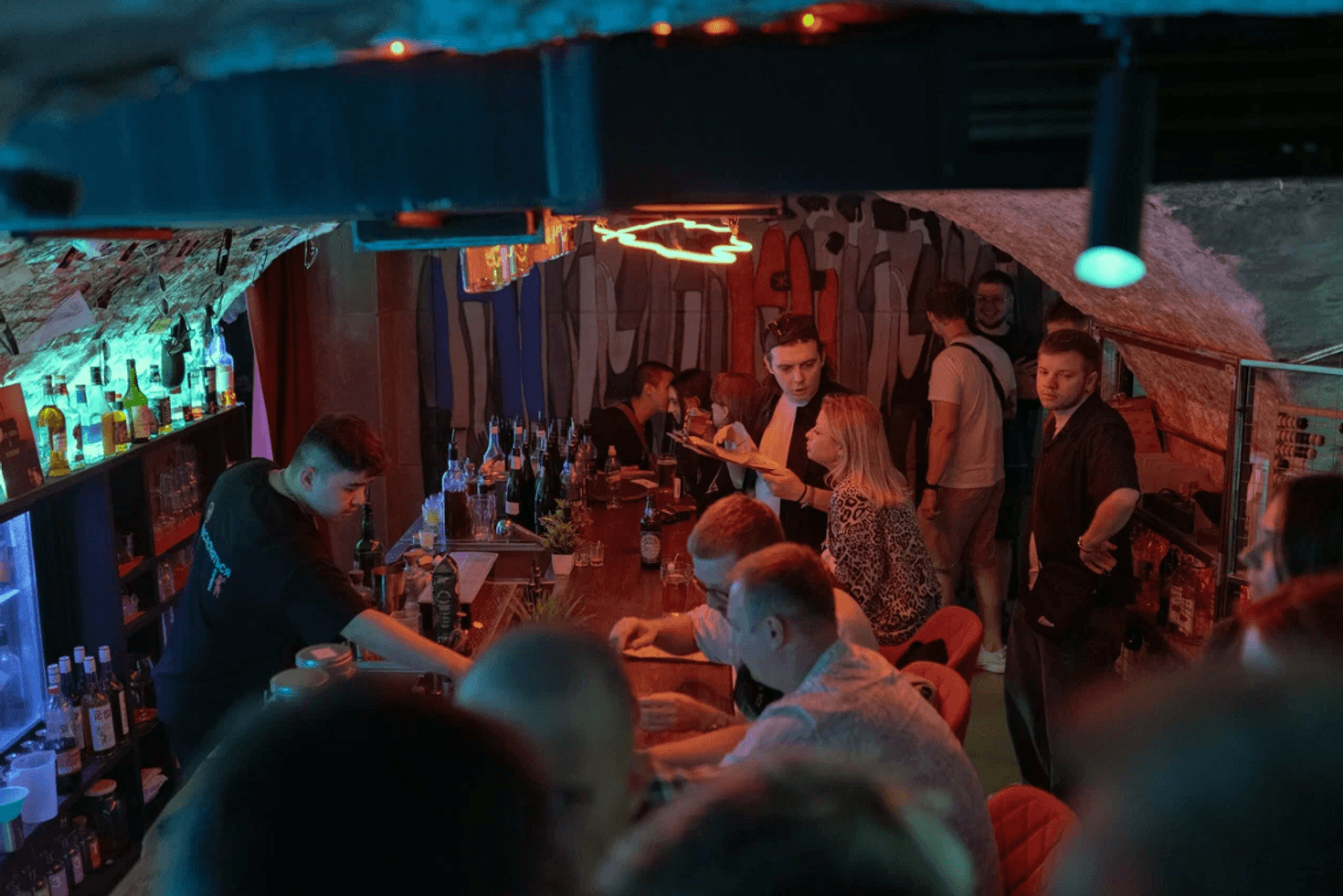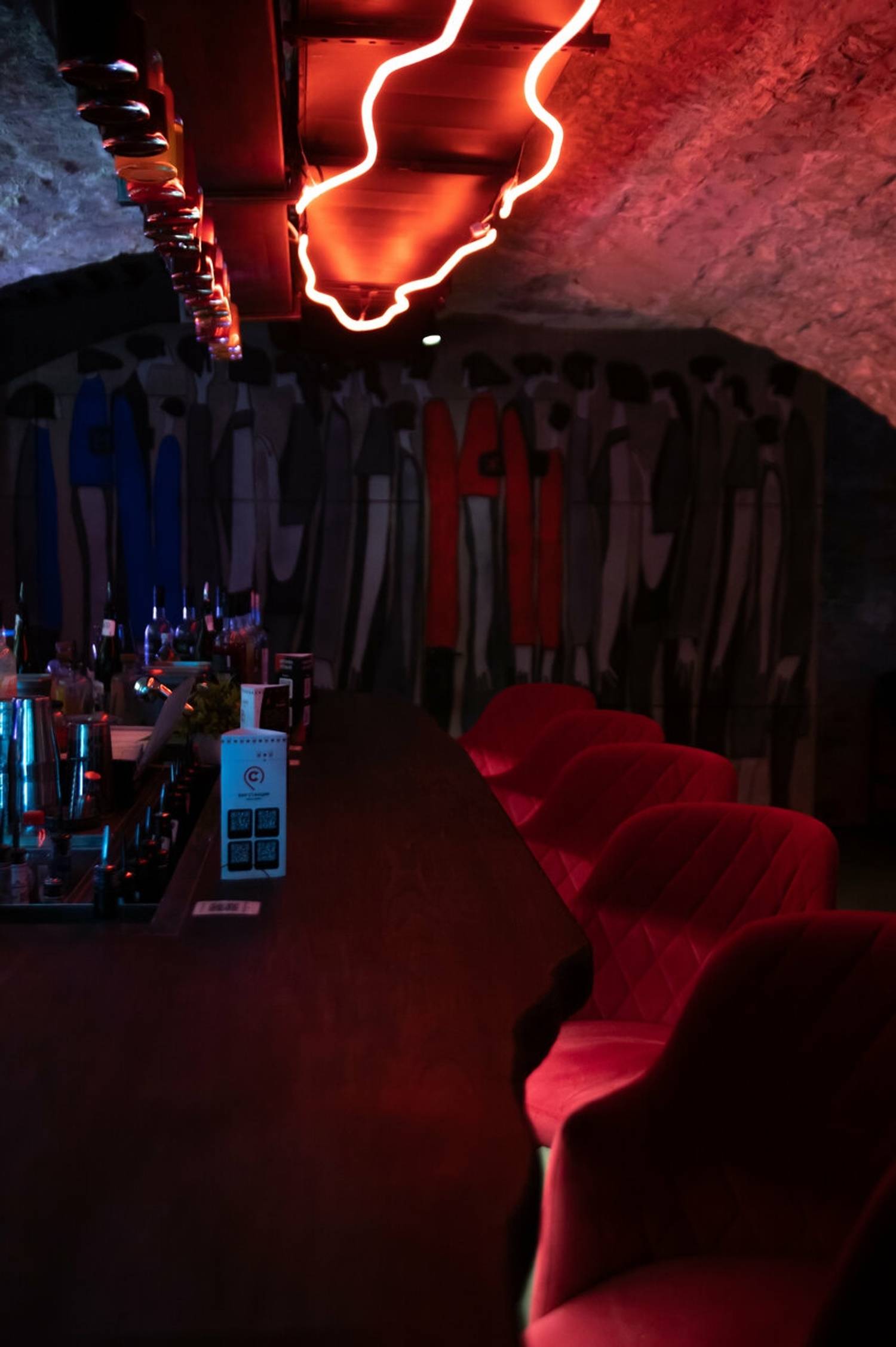 Атмосфера. Бар расположился в полуподвальном помещении с низкими сводчатыми потолками и кирпичными стенами. Простая мебель, росписи на стенах и картины создают непринужденную и живую атмосферу, которая сочетает в себе исторический шарм и современный минимализм.