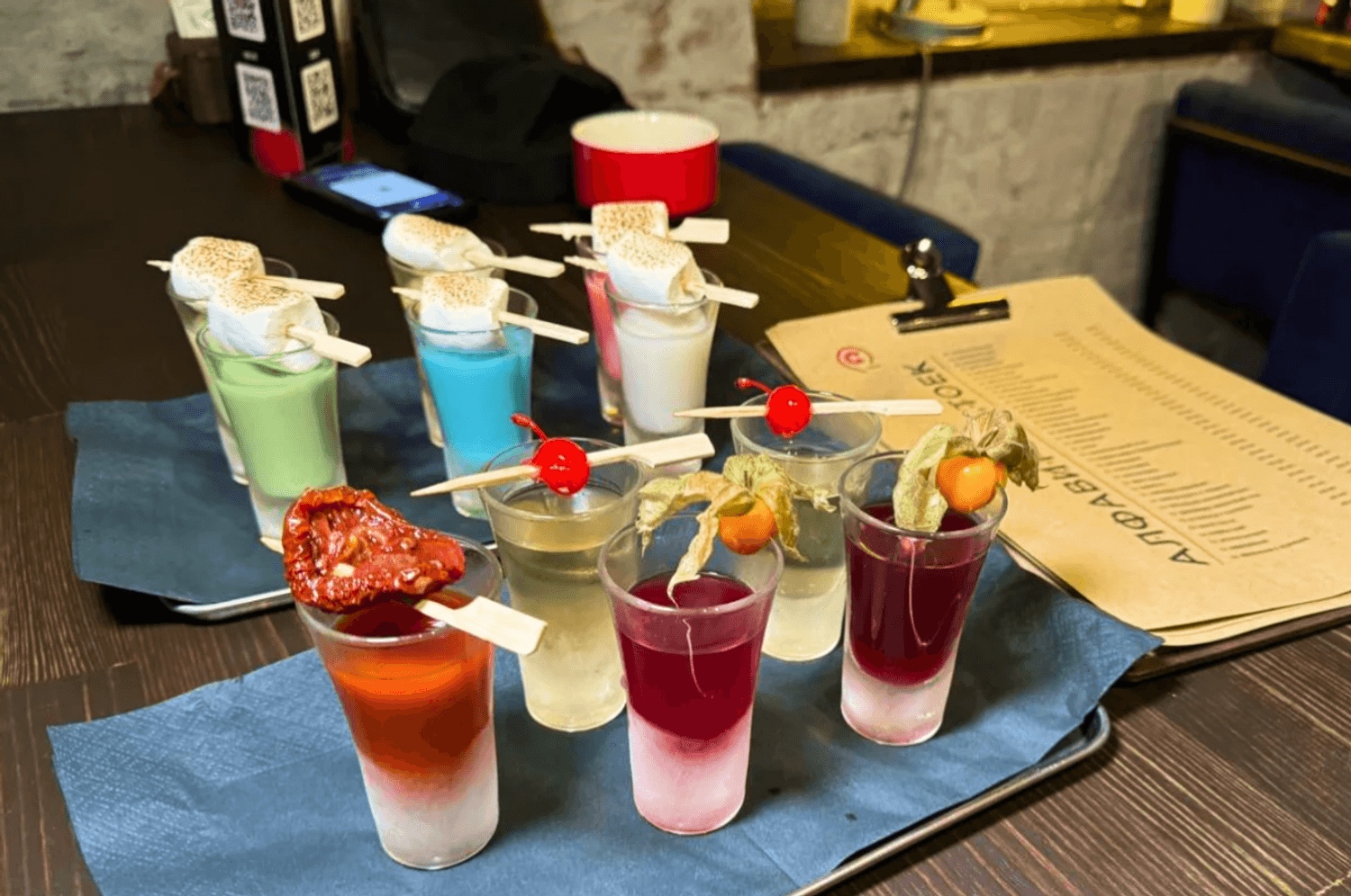 Еда и напитки. Основной фокус — на авторских настойках и крепких напитках. В баре есть шесть видов самарского пива и несколько вариаций томатного гозе. К напиткам подают традиционные закуски, например сырные шарики, рыбную тарелку и даже вафли.