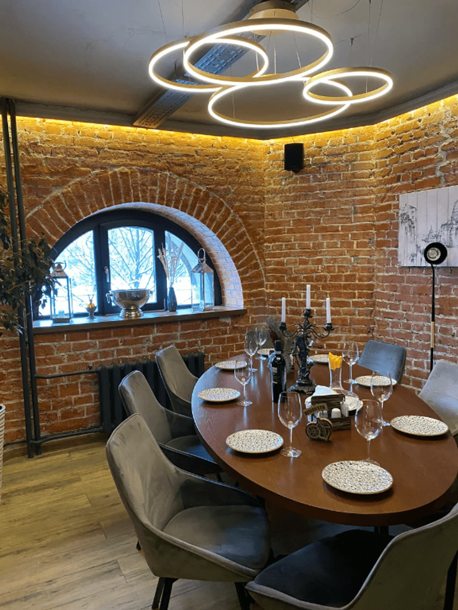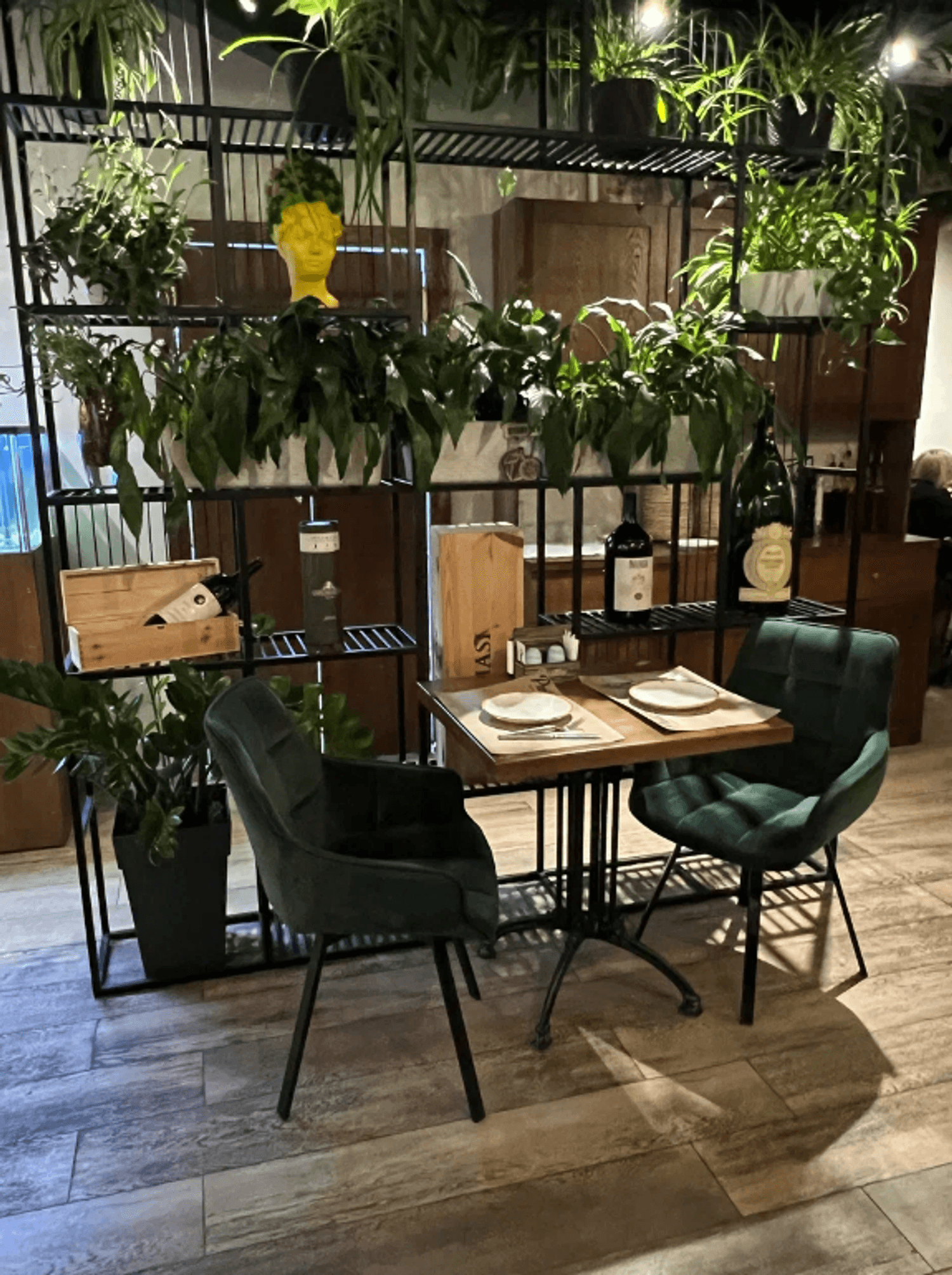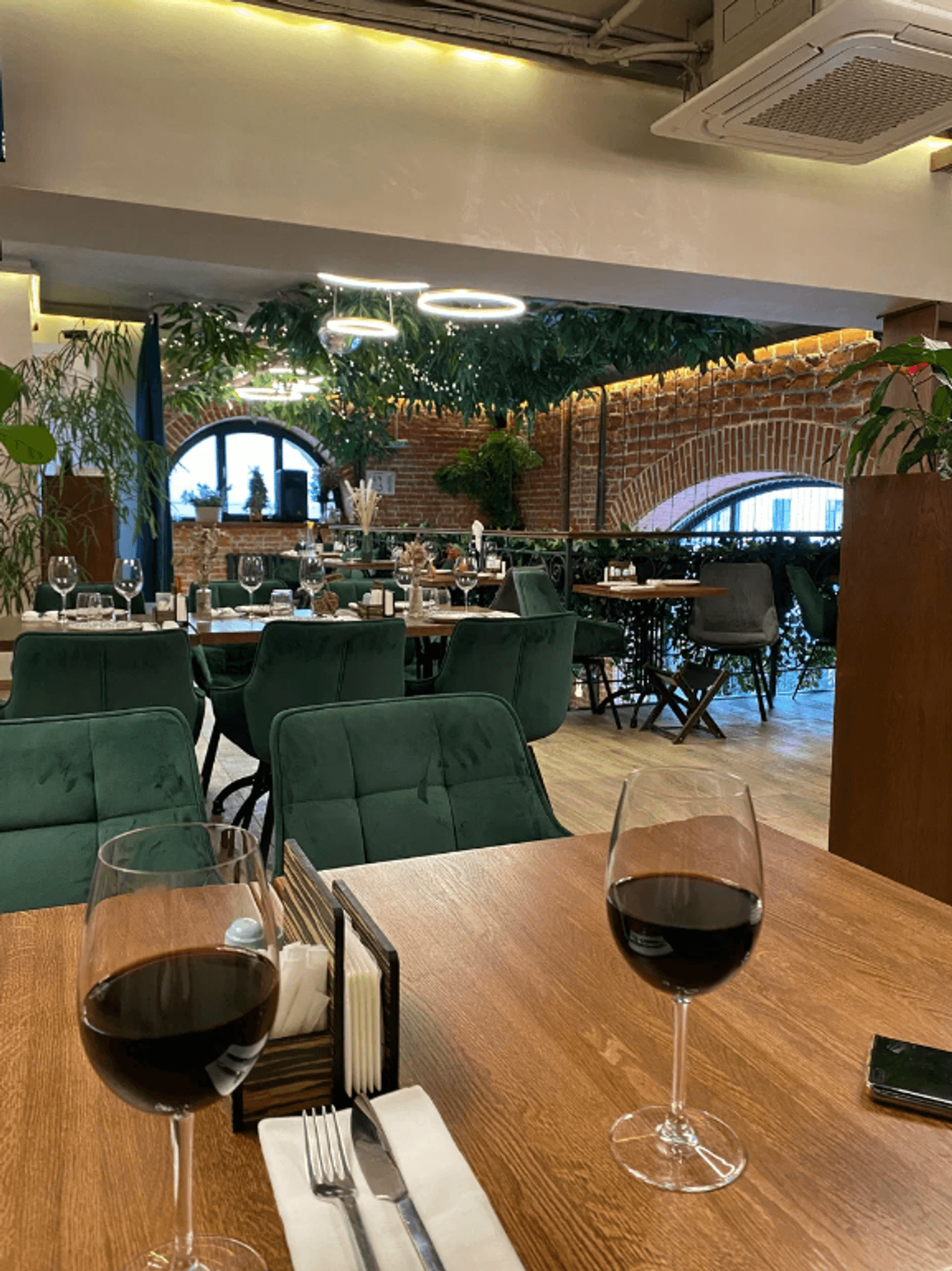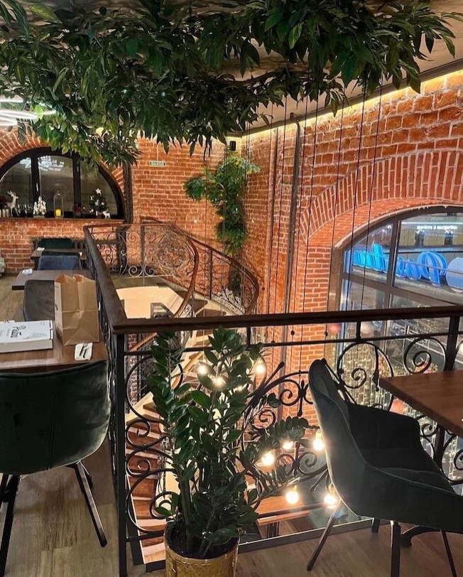 Атмосфера. Пространство с теплыми тонами и кирпичными стенами создает одновременно современную и камерную обстановку. Взгляд сразу притягивает лестница с резными перилами: она ведет на второй этаж, где можно уютно расположиться как за столиками на двоих, так и за большим общим столом. По вечерам пятницы и субботы здесь звучит живая музыка, усиливая ощущение того, что вы в Италии.