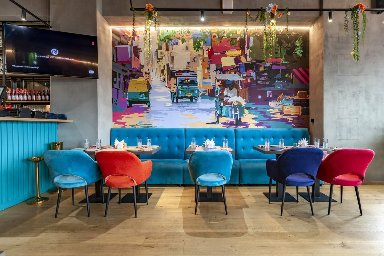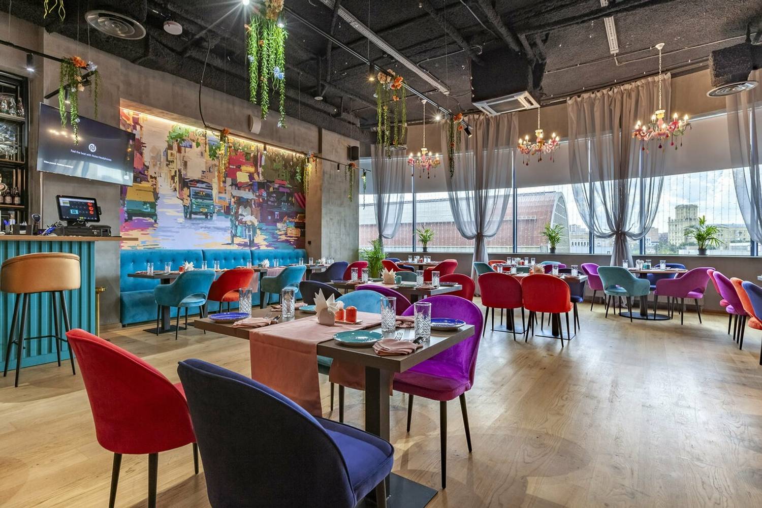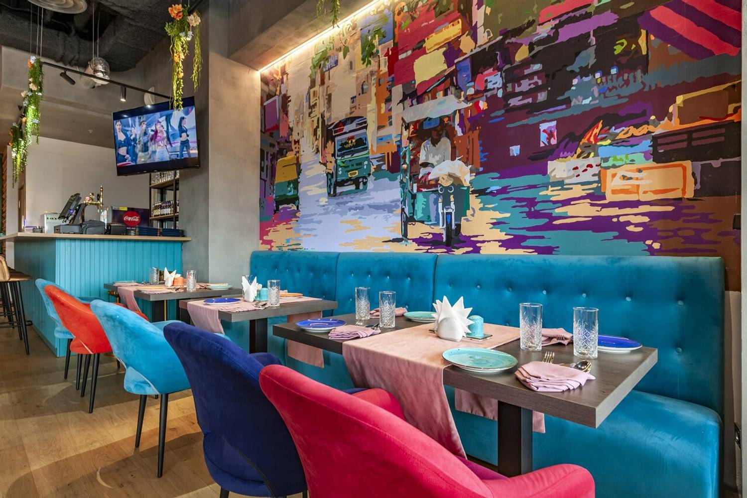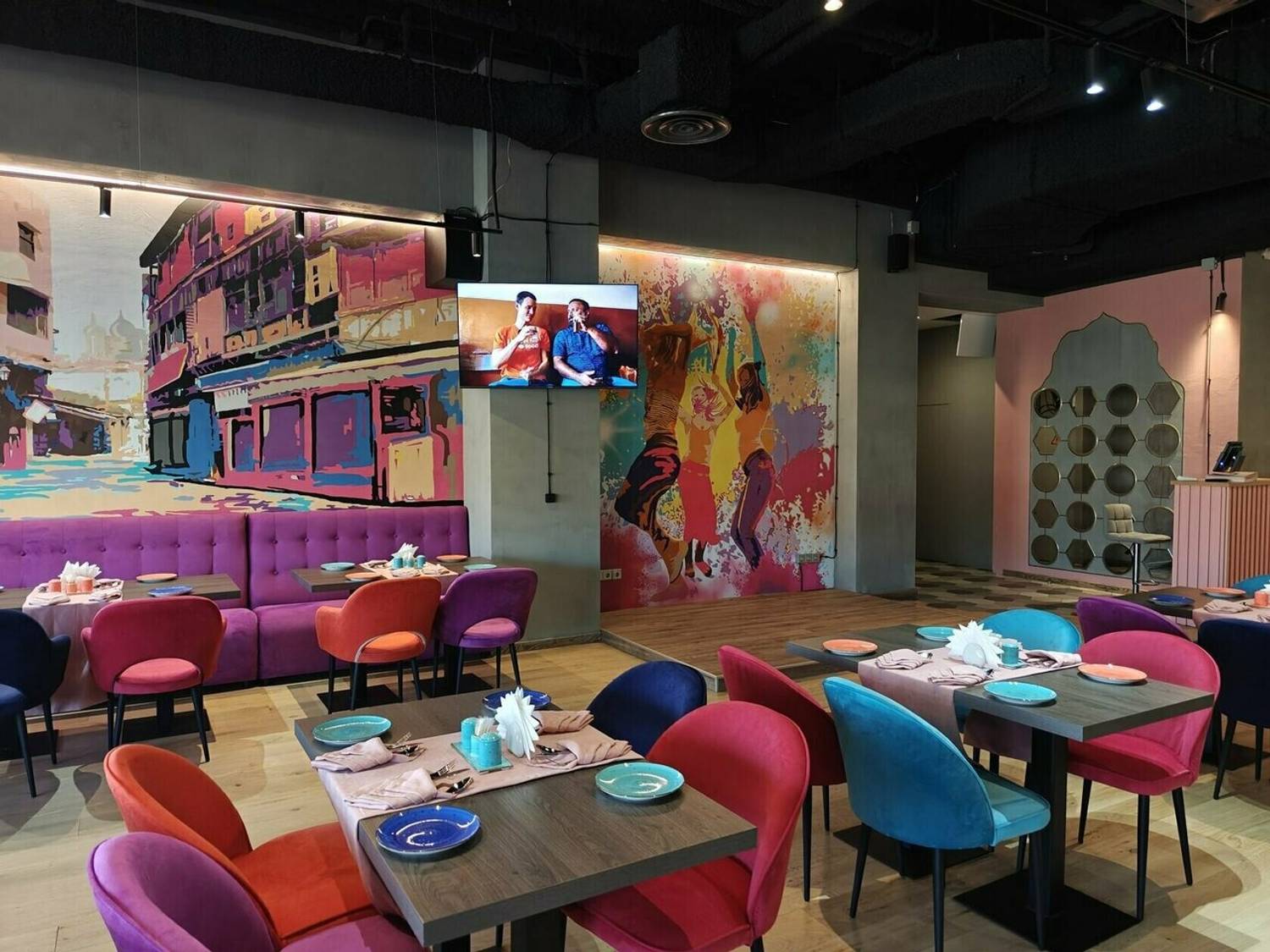 Атмосфера. Вы словно оказываетесь на оживленных улицах Дели. Стены украшены яркими графичными рисунками городских сцен, а также танцующими людьми с красочными брызгами, словно они отмечают праздник Холи. Неоновые надписи, яркие диваны и стулья в синих, оранжевых и фиолетовых тонах, декоративный мопед и люстры, украшенные растениями, дополняют атмосферу красочной Индии. Прозрачные длинные портьеры будто смягчают яркость пространства, добавляют нежности. Есть посадка как за столом, так и за стильной барной стойкой бирюзового оттенка.