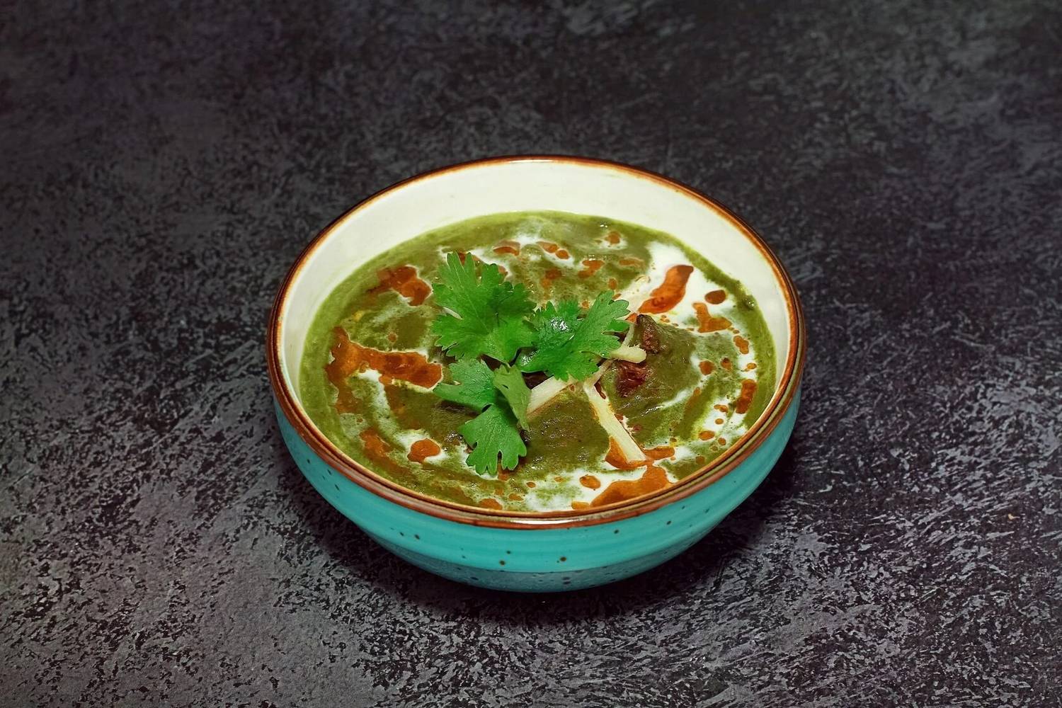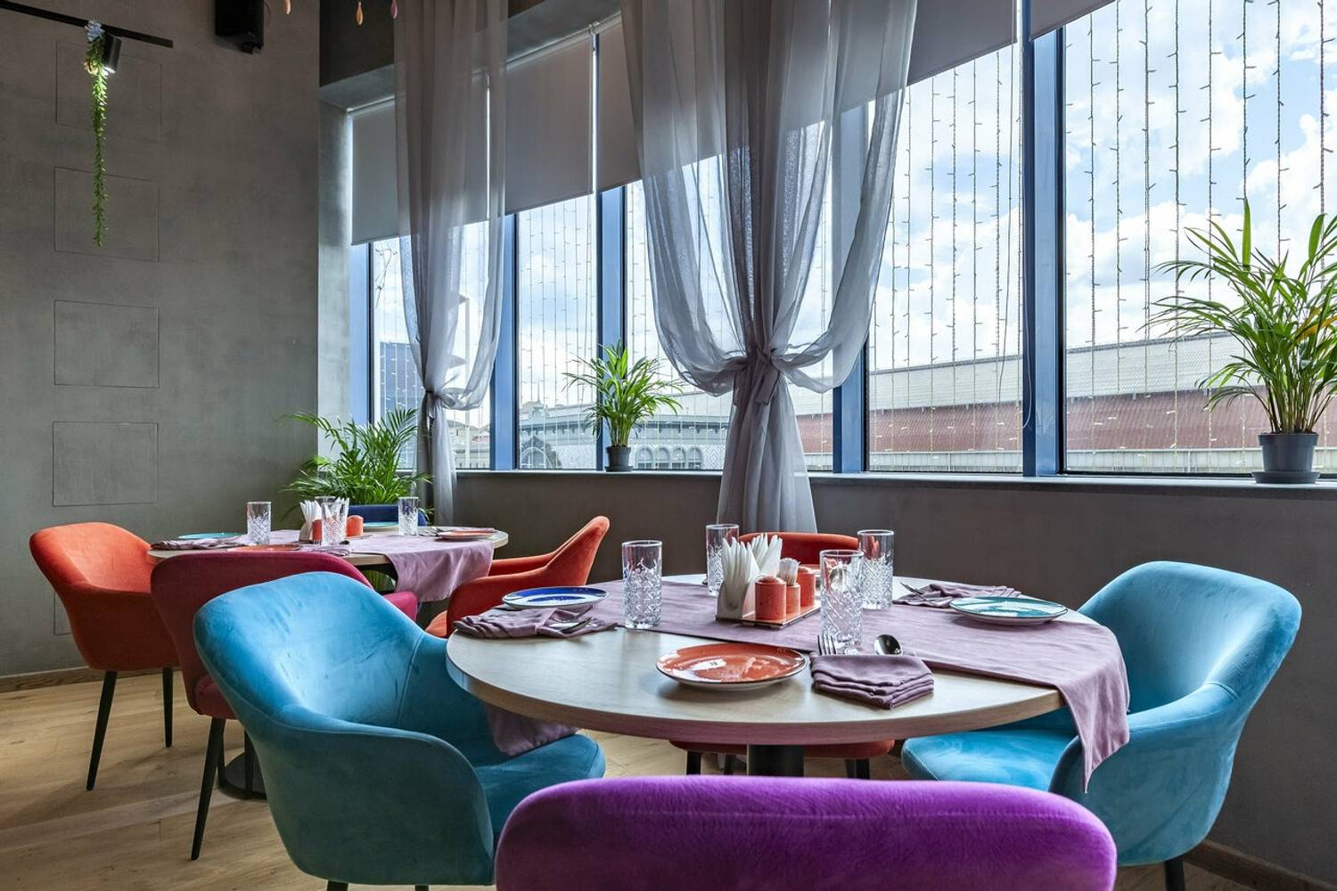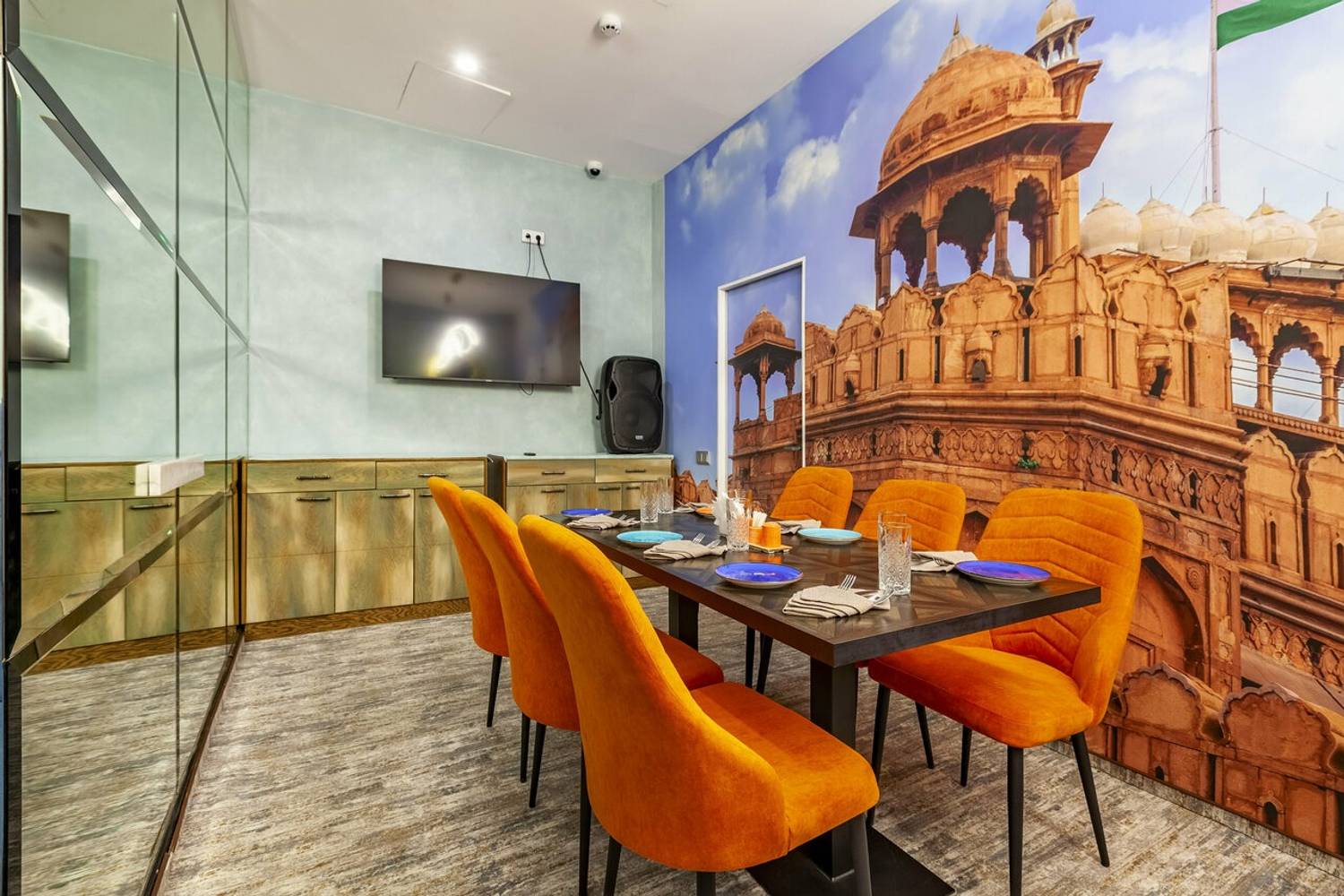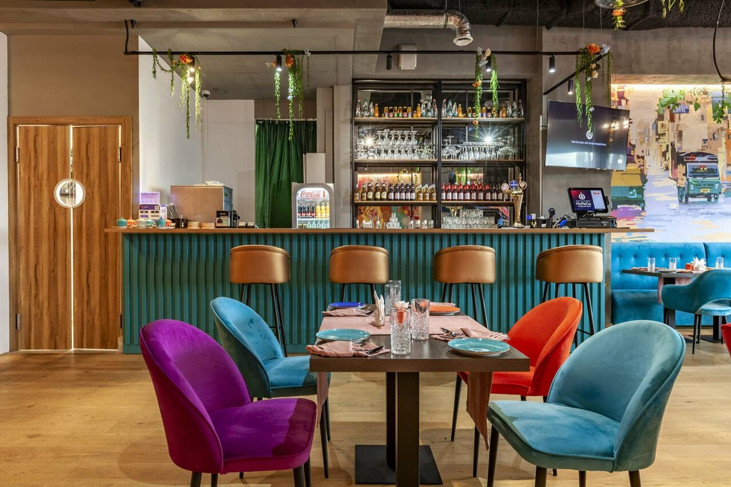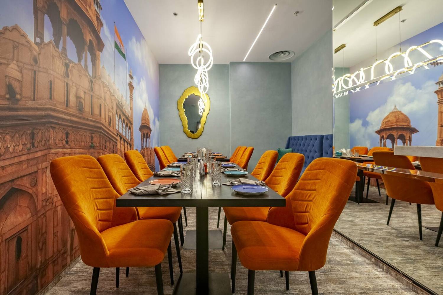 Атмосфера. Вы словно оказываетесь на оживленных улицах Дели. Стены украшены яркими графичными рисунками городских сцен, а также танцующими людьми с красочными брызгами, словно они отмечают праздник Холи. Неоновые надписи, яркие диваны и стулья в синих, оранжевых и фиолетовых тонах, декоративный мопед и люстры, украшенные растениями, дополняют атмосферу красочной Индии. Прозрачные длинные портьеры будто смягчают яркость пространства, добавляют нежности. Есть посадка как за столом, так и за стильной барной стойкой бирюзового оттенка.