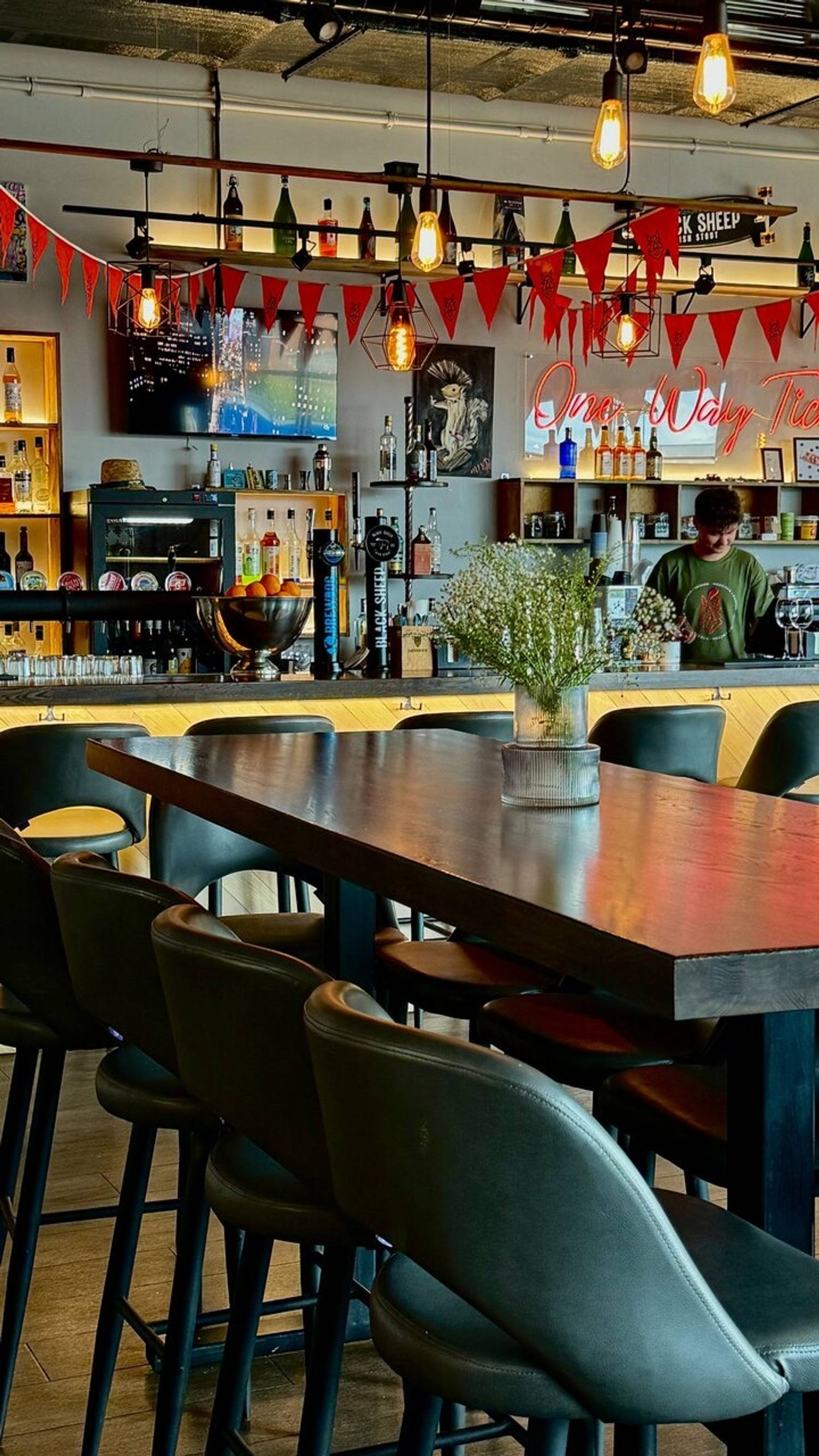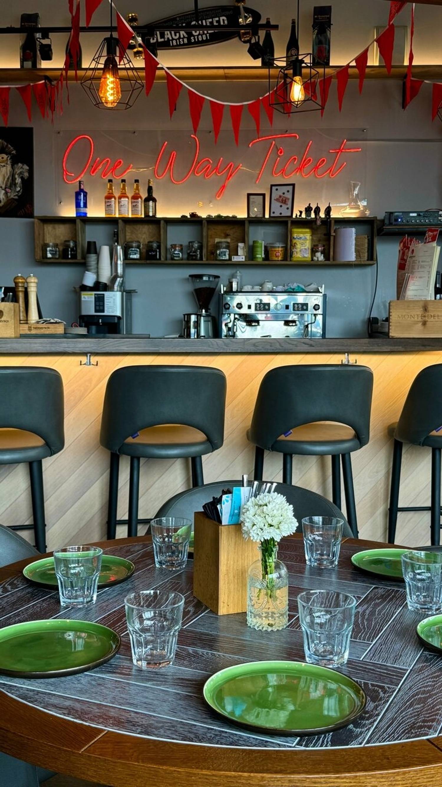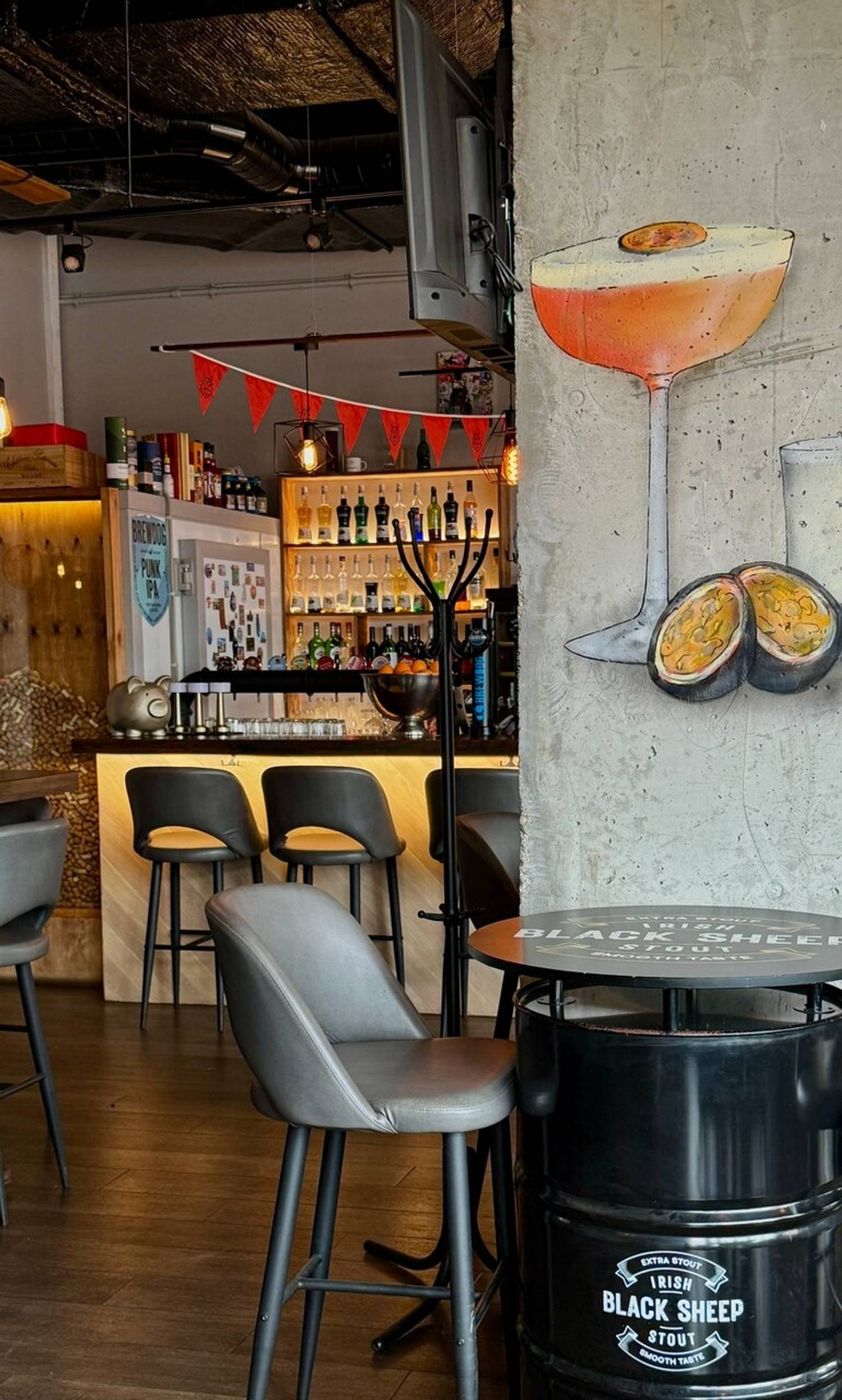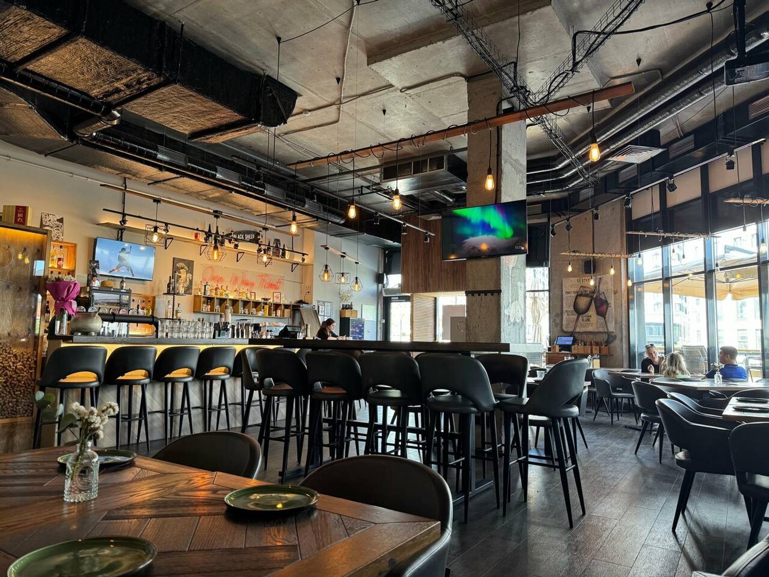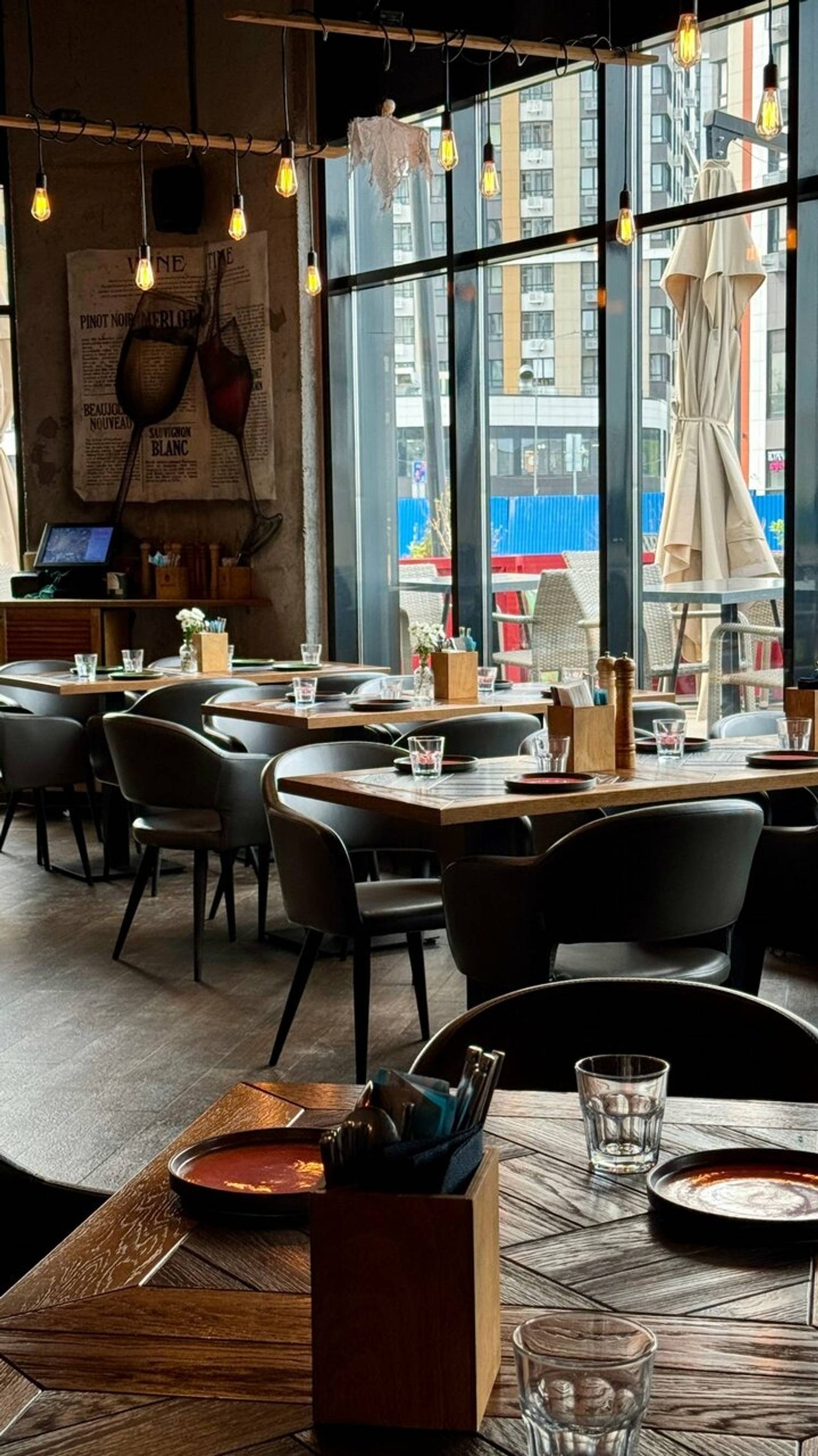 Атмосфера. Заведение создает ощущение уютного и стильного места «для своих». Минималистичный интерьер с панорамными окнами, живыми растениями, удобными креслами и ламповым освещением располагает к посиделкам и общению. Пространство адаптировано для разных сценариев: здесь есть большие столы для компаний, по выходным звучит живая музыка, а для семей с детьми предусмотрены стульчики и художественные принадлежности. Также бар проводит тематические мероприятия, от спортивных трансляций до винного казино.