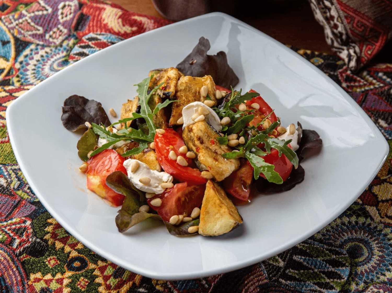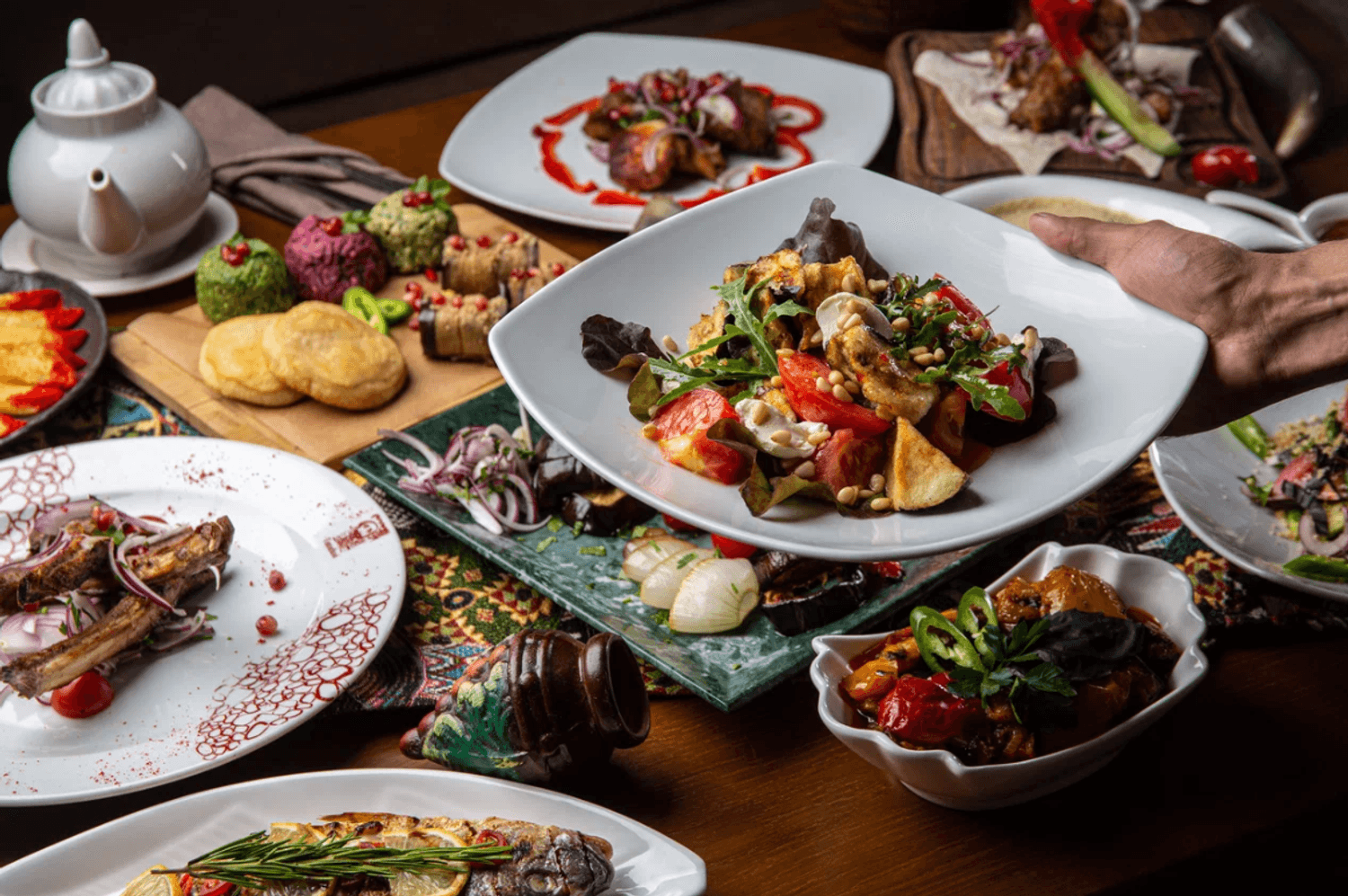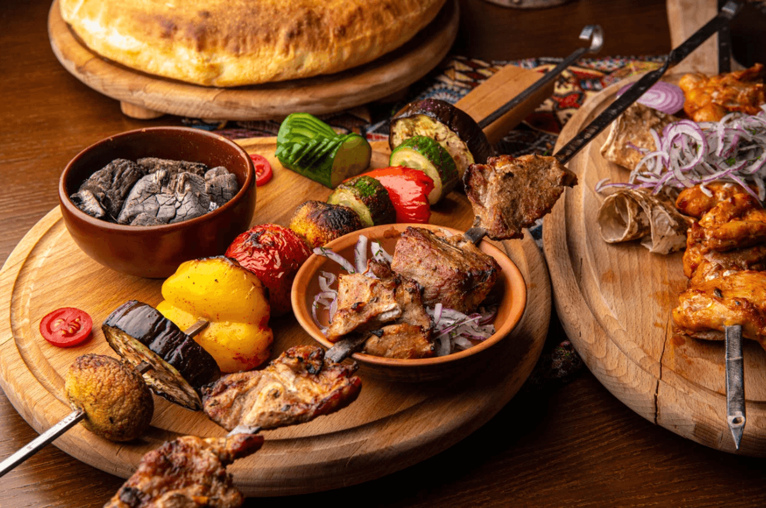 Еда и напитки. В меню — фондю по-грузински, суп чихиртма, кучмачи говяжий на кеци, мамалыга с сыром, оджахури из свинины, жареные хинкали и люля-кебаб из баранины. А на десерт предлагают тирамису, шу и Наполеон.