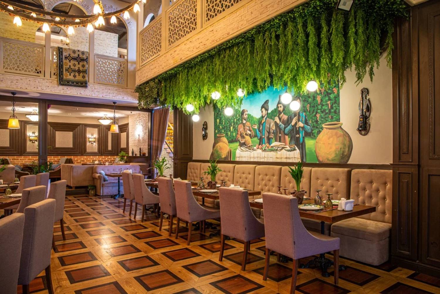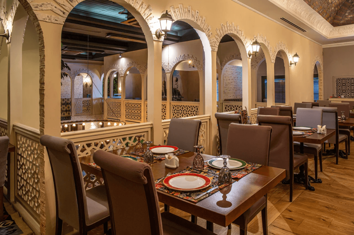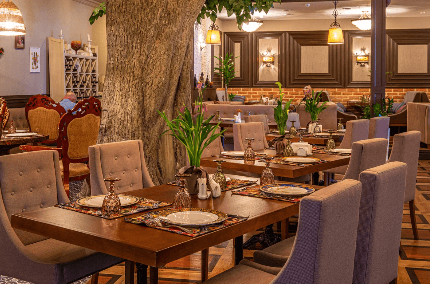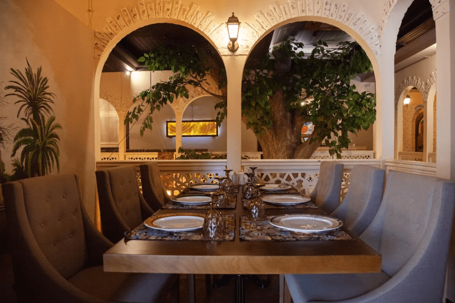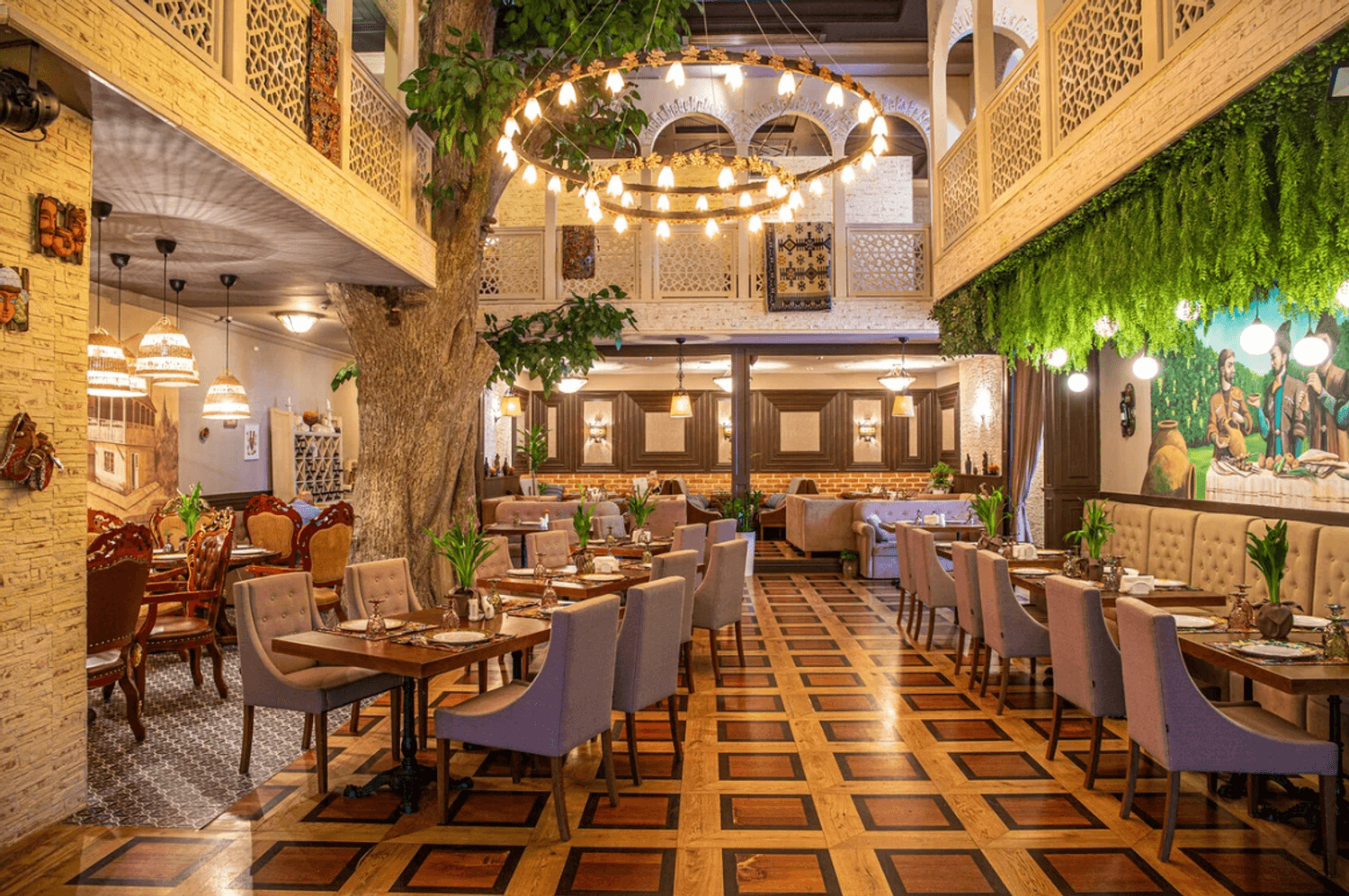 Атмосфера. Здесь целых семь банкетных залов с индивидуальным дизайном: от уютных комнат на 6 человек до просторных помещений. В основном зале растет дерево, чья крона добирается до 2 этажа. Интерьер дополняют стены с росписью тбилисских пейзажей и грузинским флагом, столы с живыми растениями в вазах и индивидуальные коврики с восточными орнаментами вместо скатертей.