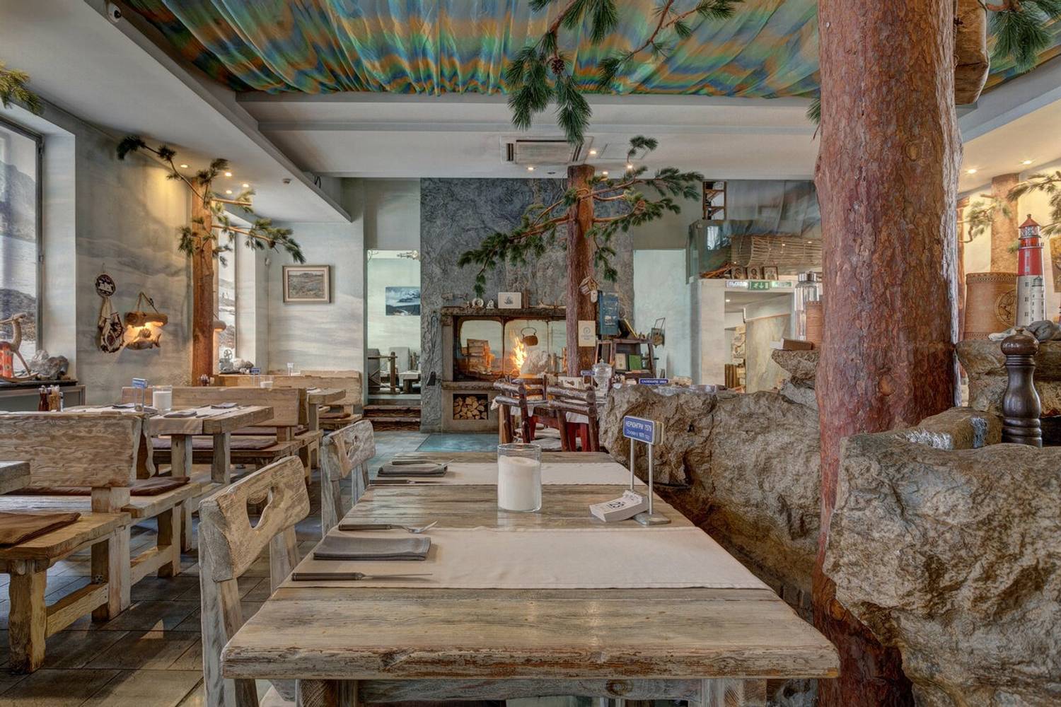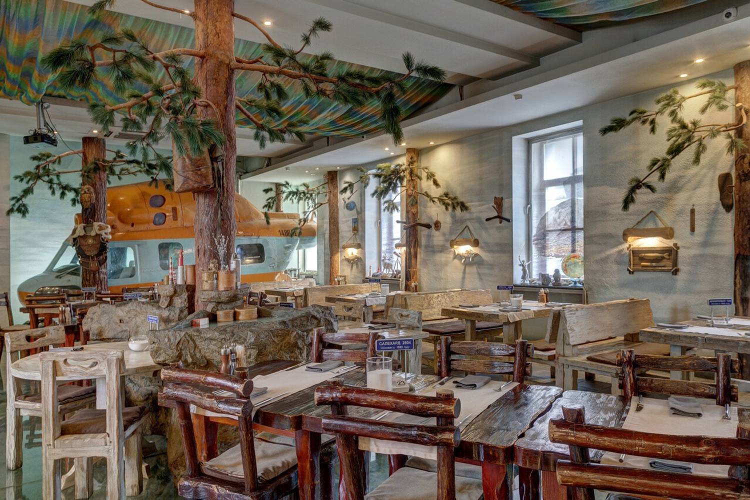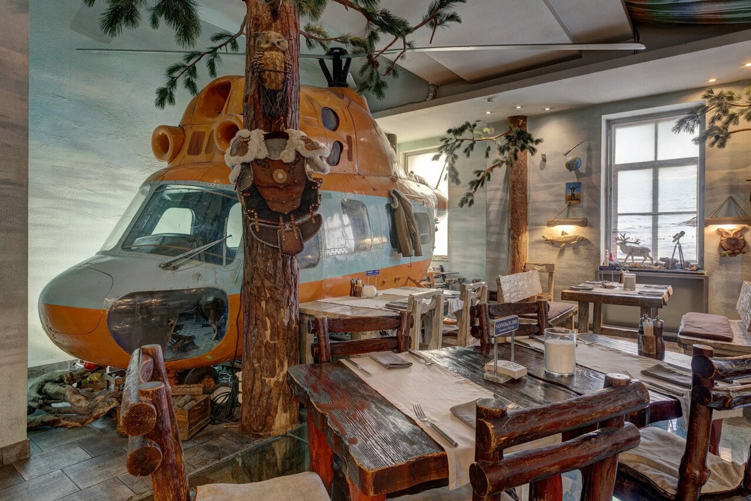 Атмосфера. Интерьер создает полный эффект присутствия на лесной поляне, куда на сине-оранжевом вертолете прибыла команда путешественников. Натянутое разноцветное полотно на потолке, массивные деревянные стулья, настоящие деревья в зале с развешанной на них походной одеждой и картины с лесными пейзажами формируют многослойную среду с эффектом погружения в походную концепцию. Помимо основного зала, ресторан предлагает VIP-домик и летнюю террасу на крыше.