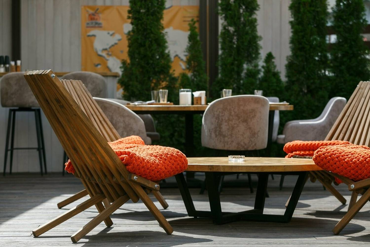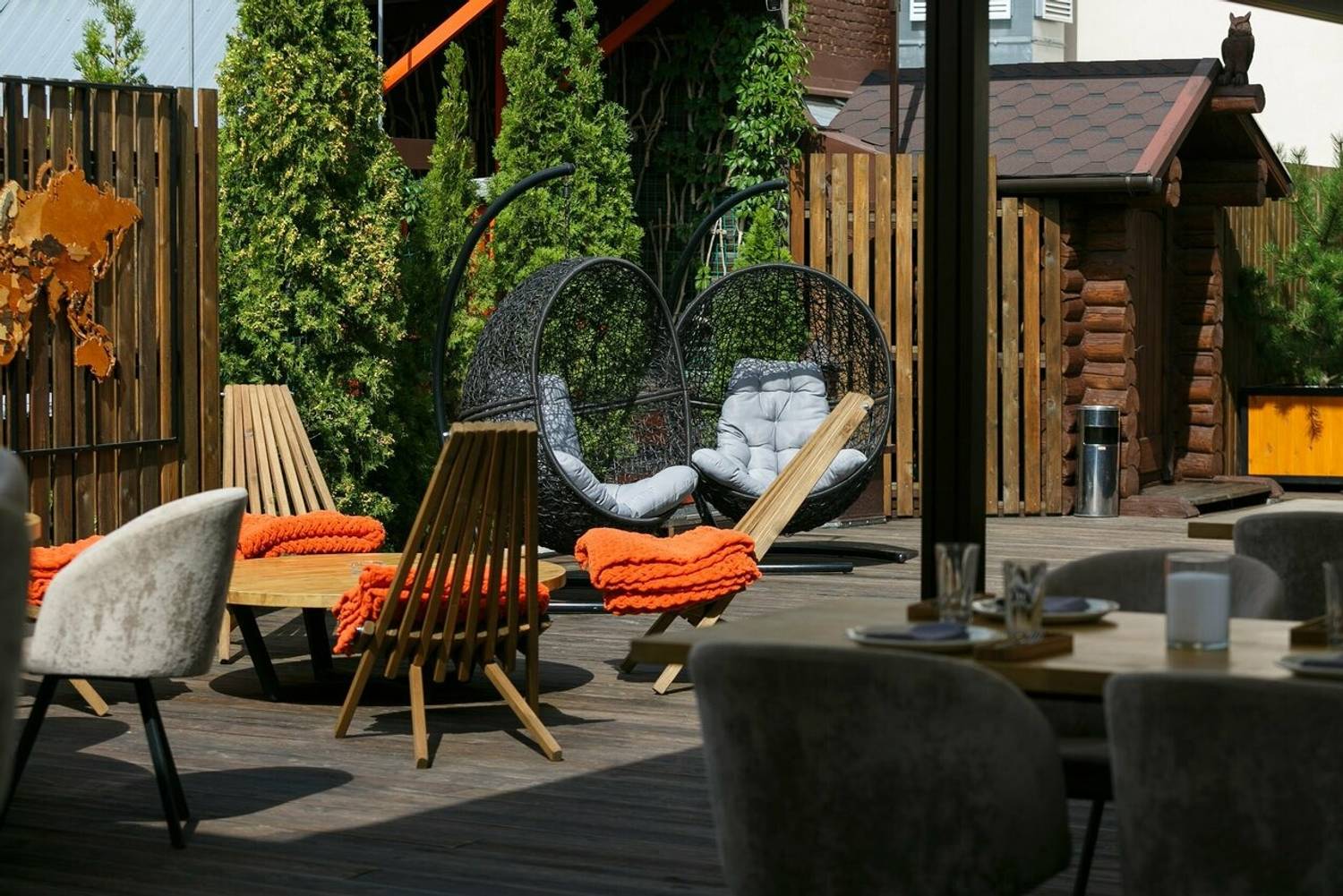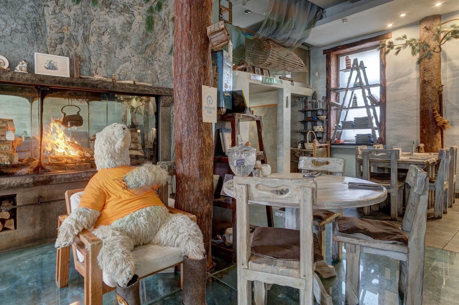 Атмосфера. Интерьер создает полный эффект присутствия на лесной поляне, куда на сине-оранжевом вертолете прибыла команда путешественников. Натянутое разноцветное полотно на потолке, массивные деревянные стулья, настоящие деревья в зале с развешанной на них походной одеждой и картины с лесными пейзажами формируют многослойную среду с эффектом погружения в походную концепцию. Помимо основного зала, ресторан предлагает VIP-домик и летнюю террасу на крыше.