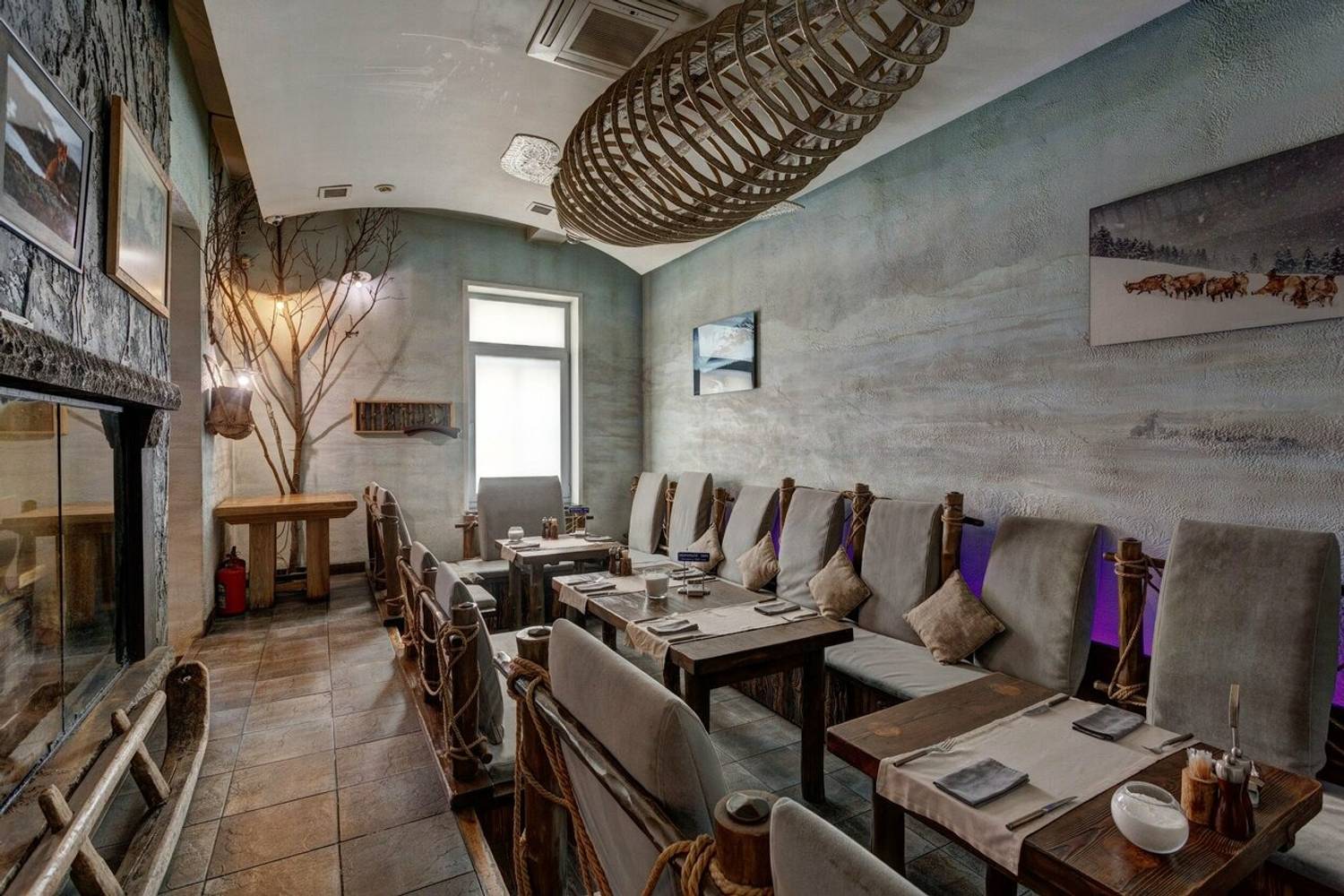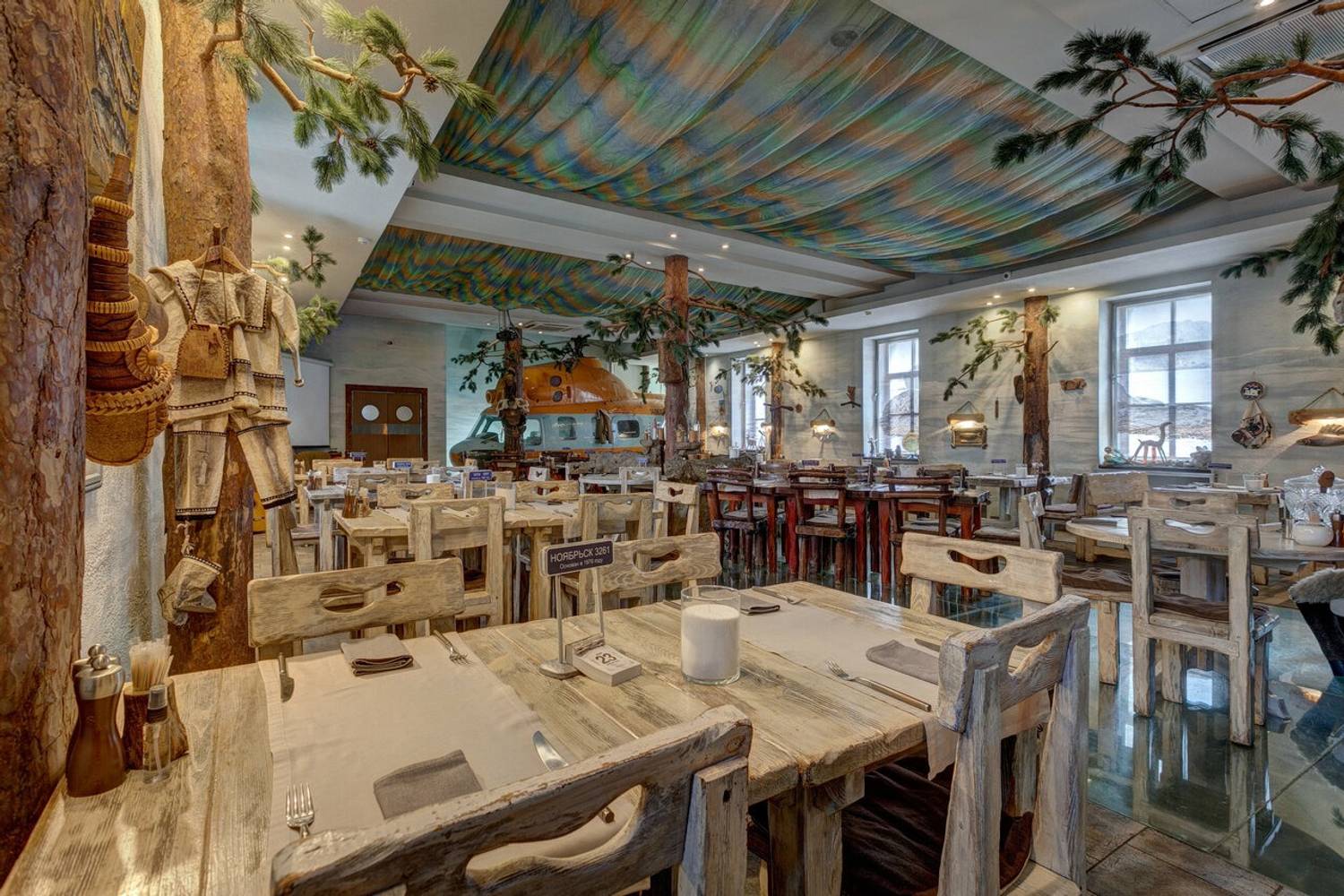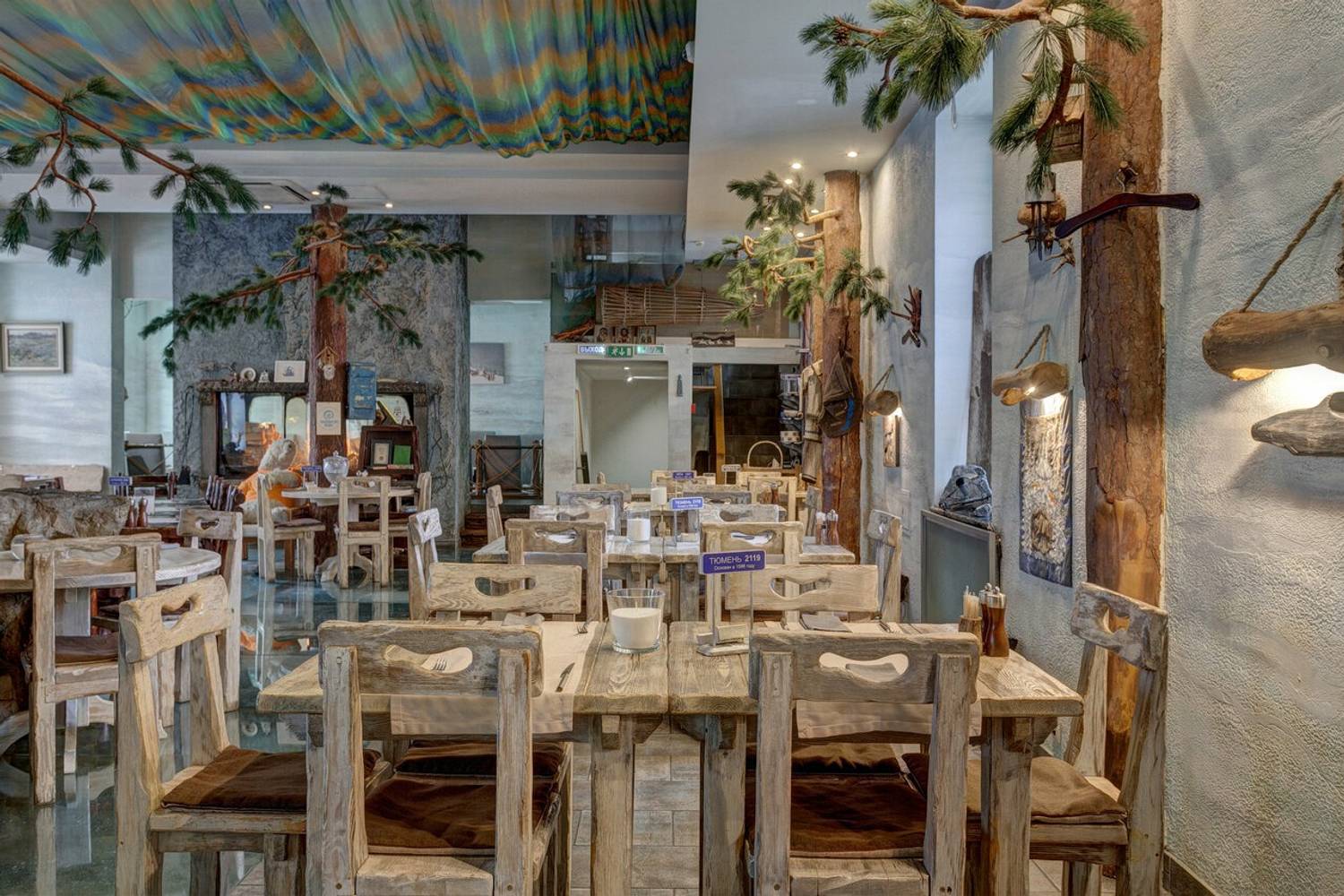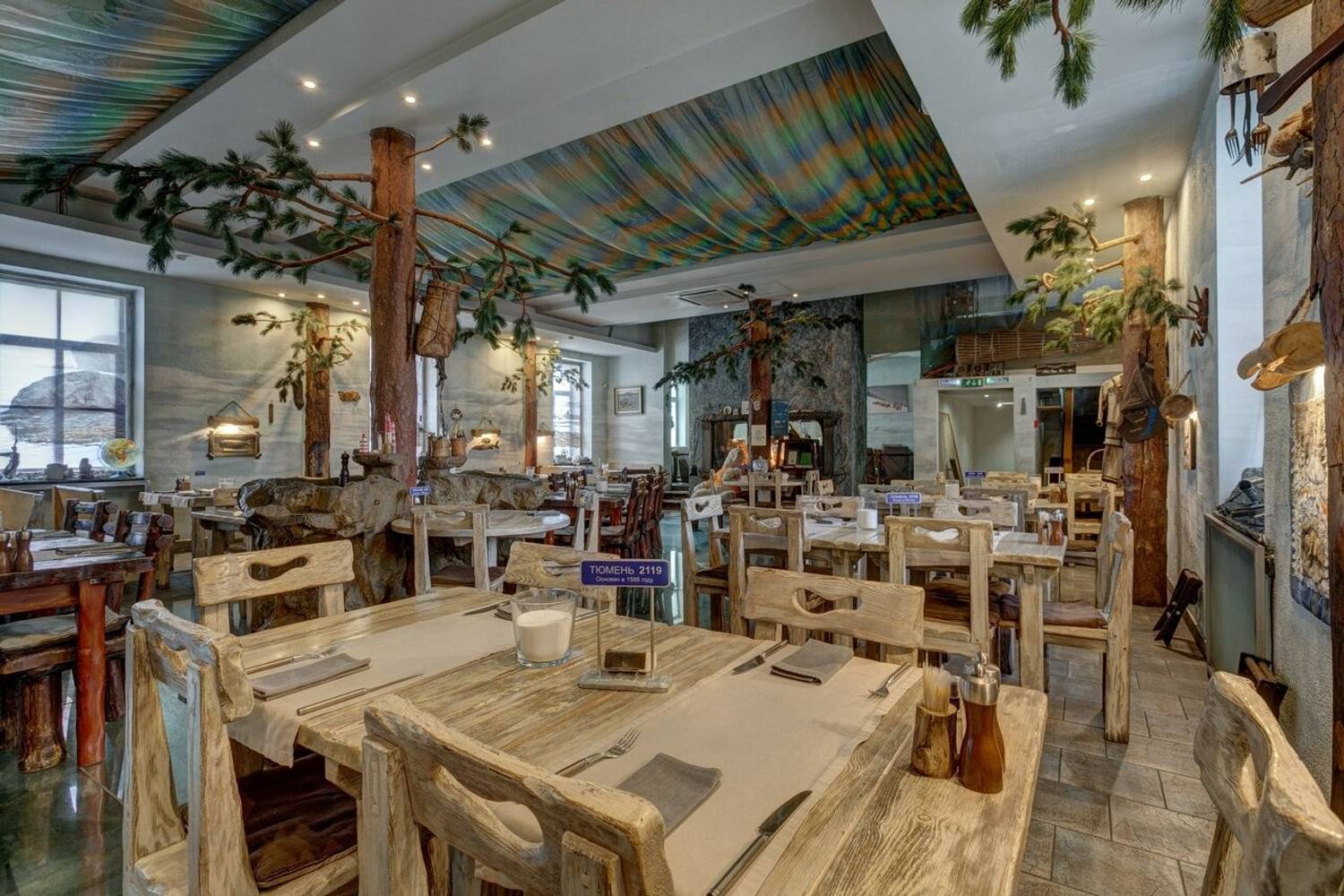 Еда и напитки. Меню представляет собой исследование авторской кухни Русского севера, где традиционные рецепты переосмыслены с современной точностью. На закуску берут тартар из кижуча с хрустальными кабачками, оленьи языки на гриле с соусом из брусники и жареные пермские посикунчики с мясом горно-алтайского барашка. Также стоит попробовать трофейный суп с мясом глухаря, рыбные пельмени с муксуном, нельмой и неркой, рубленую котлету-гриль из оленины и кабана. Десертная карта не менее привлекательна: муссовый торт из протертой морошки и белого шоколада, ассорти шоколадных камней с ягодной начинкой. Для юных гостей разработано отдельное детское меню, где собрали шашлычок из креветок, куриную котлету и какао. В будни готовят бизнес-ланч. Из напитков есть коктейли на основе фирменных настоек, вино и крепкий алкоголь.