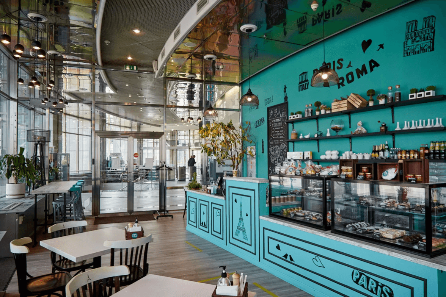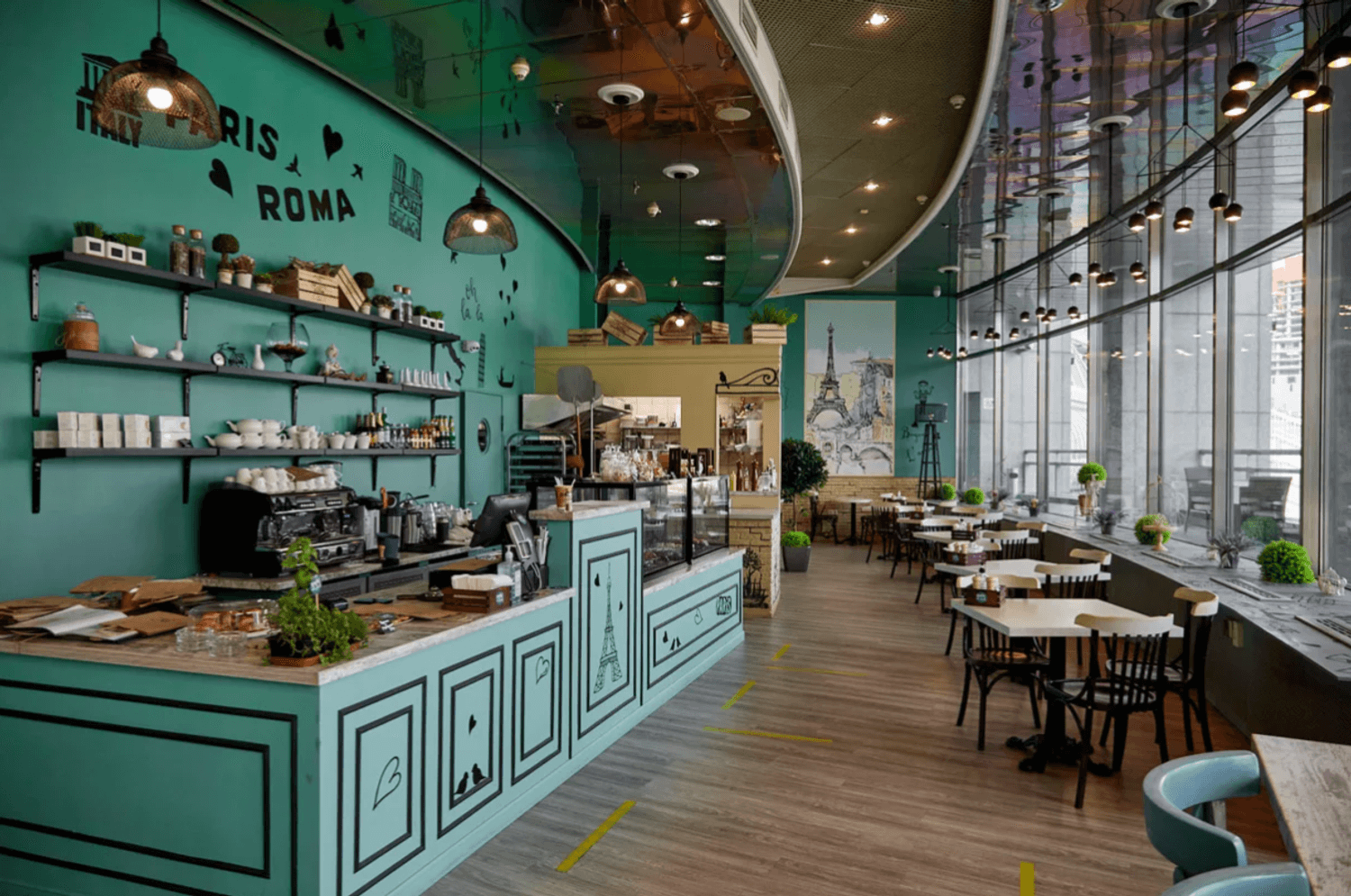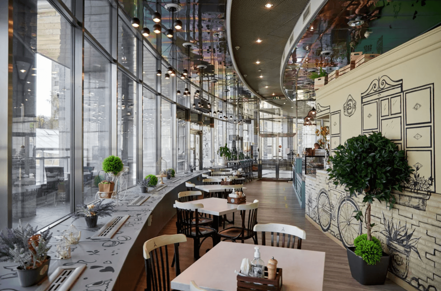 Интерьер создает особенное настроение: на стенах — стильные графические изображения Эйфелевой башни, а на столах — горшочки с лавандой, придающие пространству легкость и уют. Все сделано с любовью к деталям, чтобы вы могли расслабиться и почувствовать себя как дома.