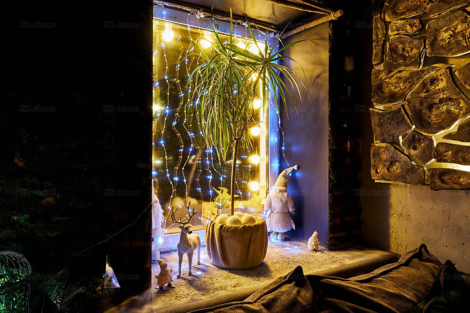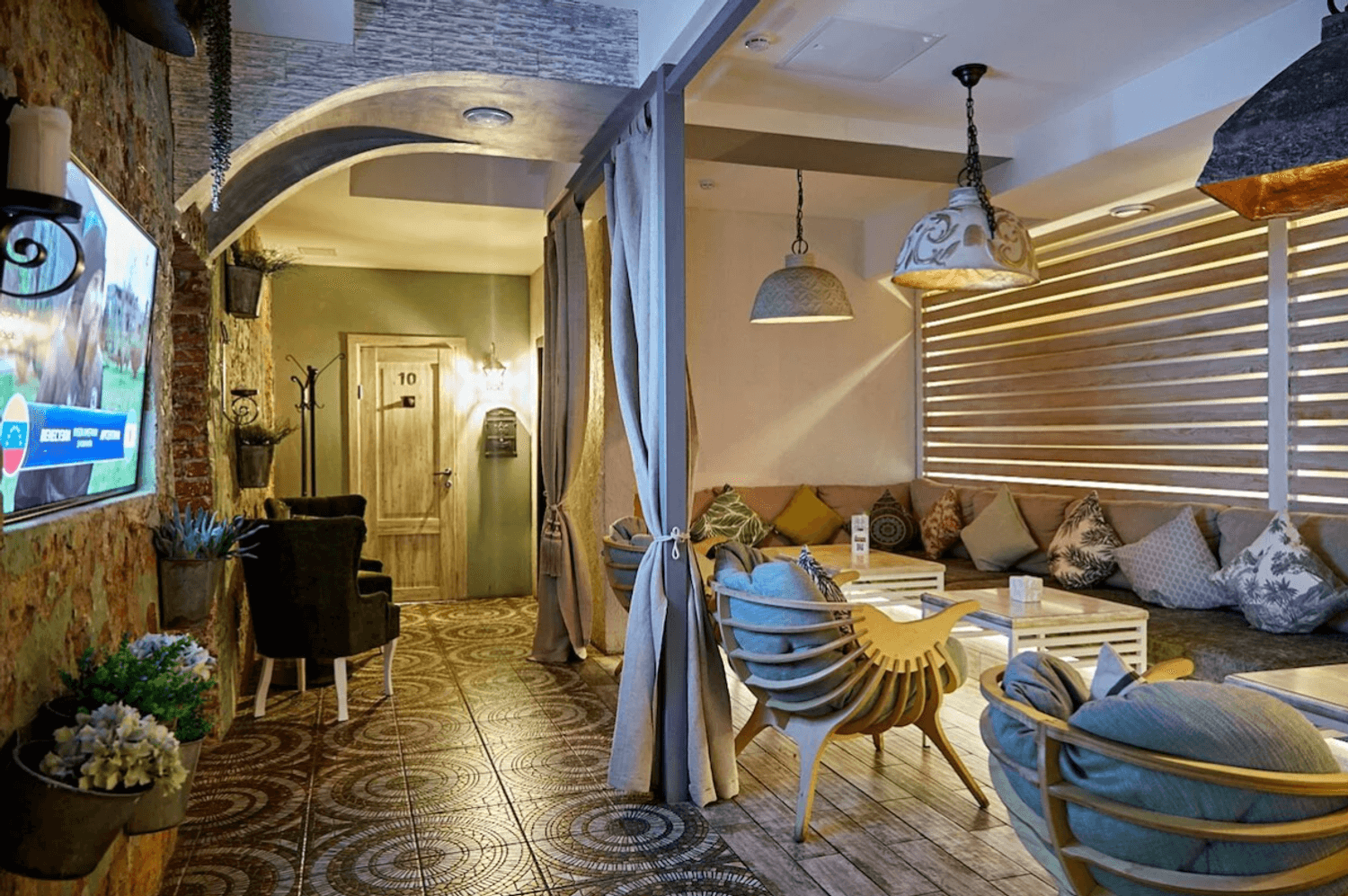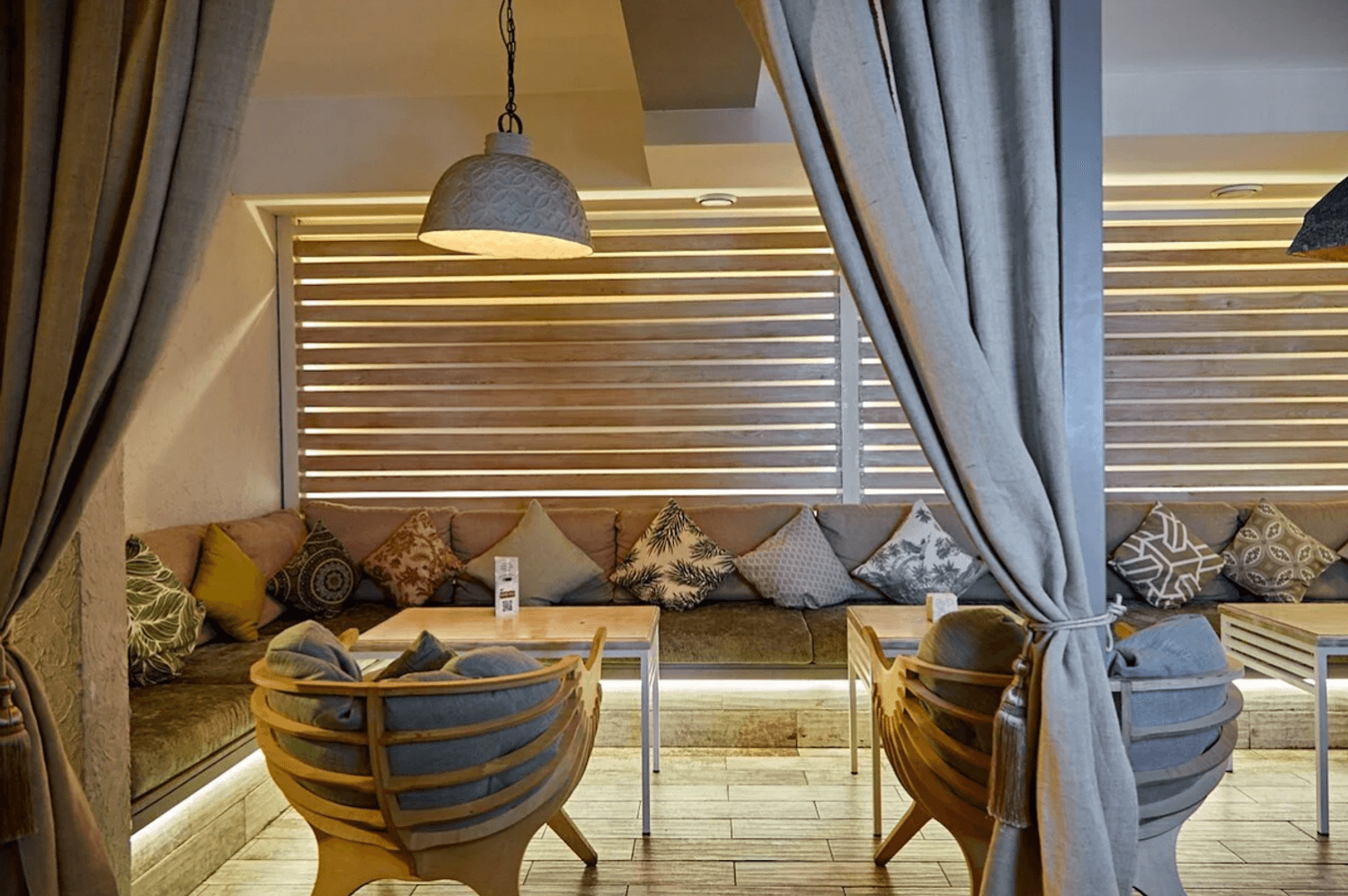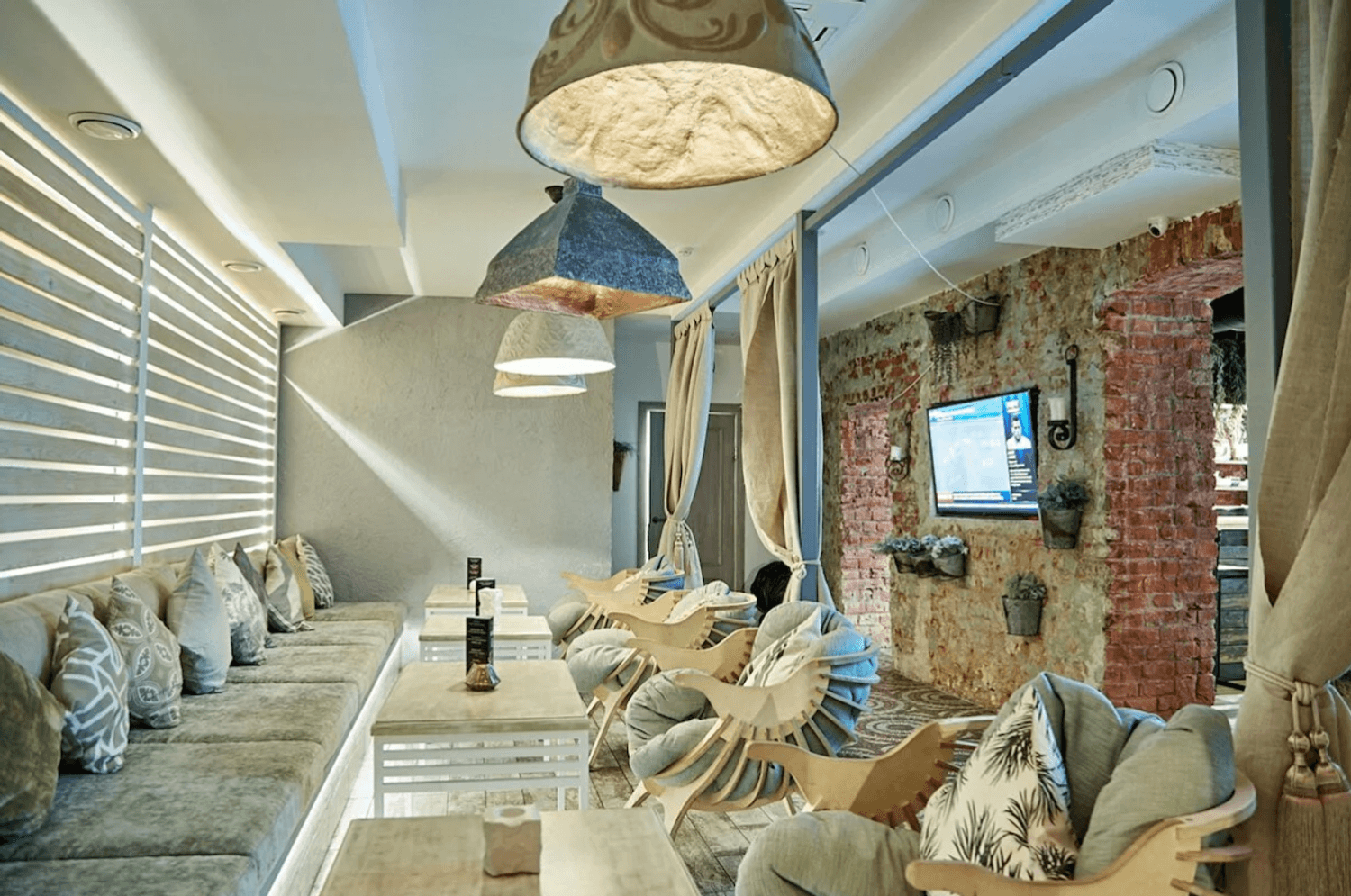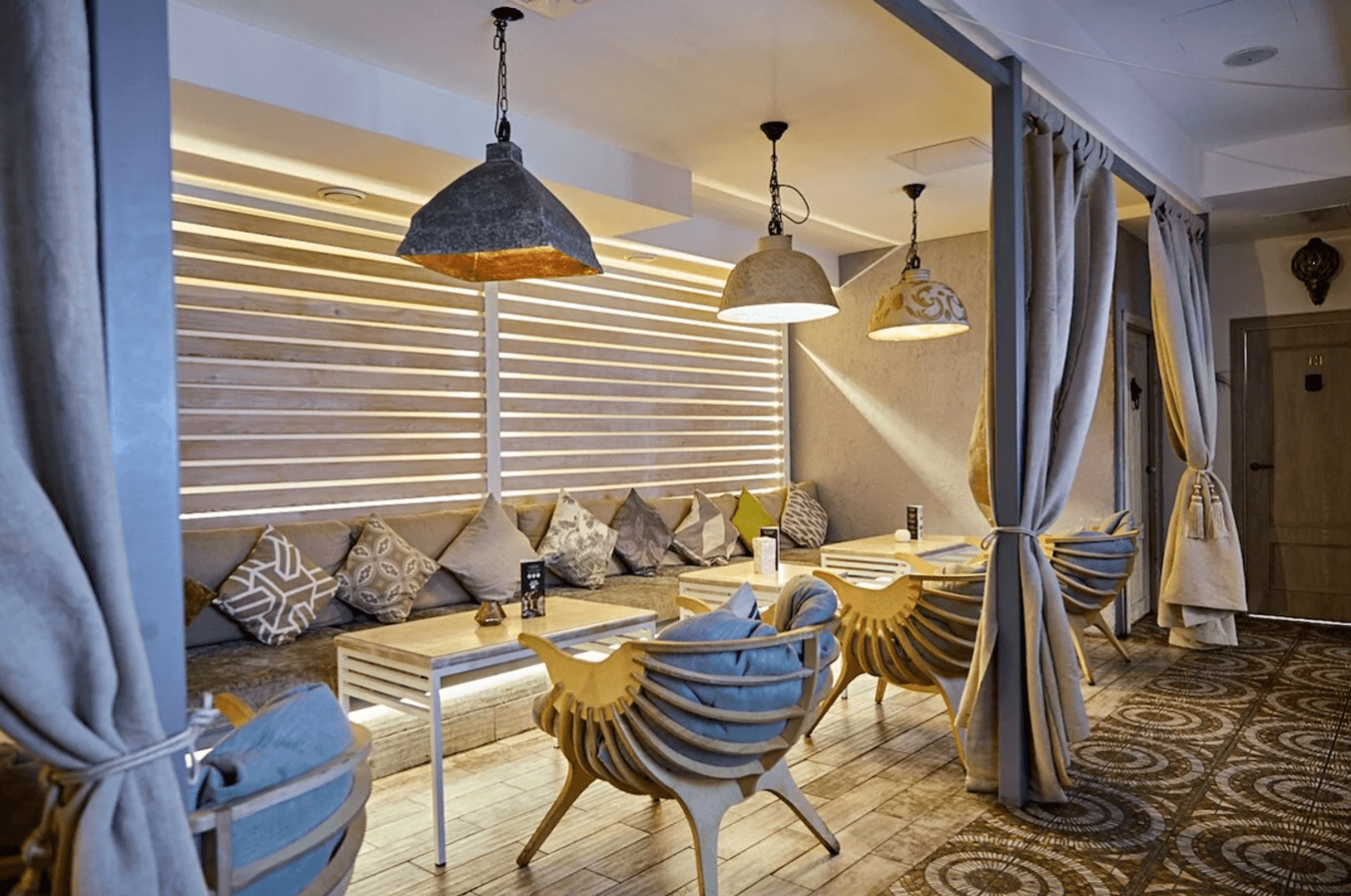 Атмосфера. Пространство оформлено в духе лофта с национальными марокканскими акцентами: состаренные кирпичные стены с мхом, пол с узорами, декоративные каменные элементы и теплая желтая подсветка. Есть уютные диванчики, отдельная VIP-кабинка, настольные игры и игровая приставка.