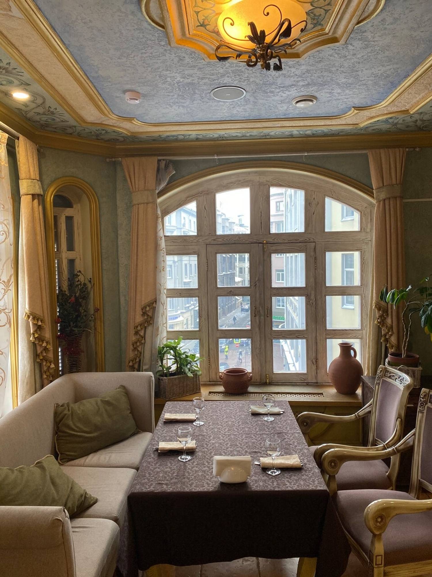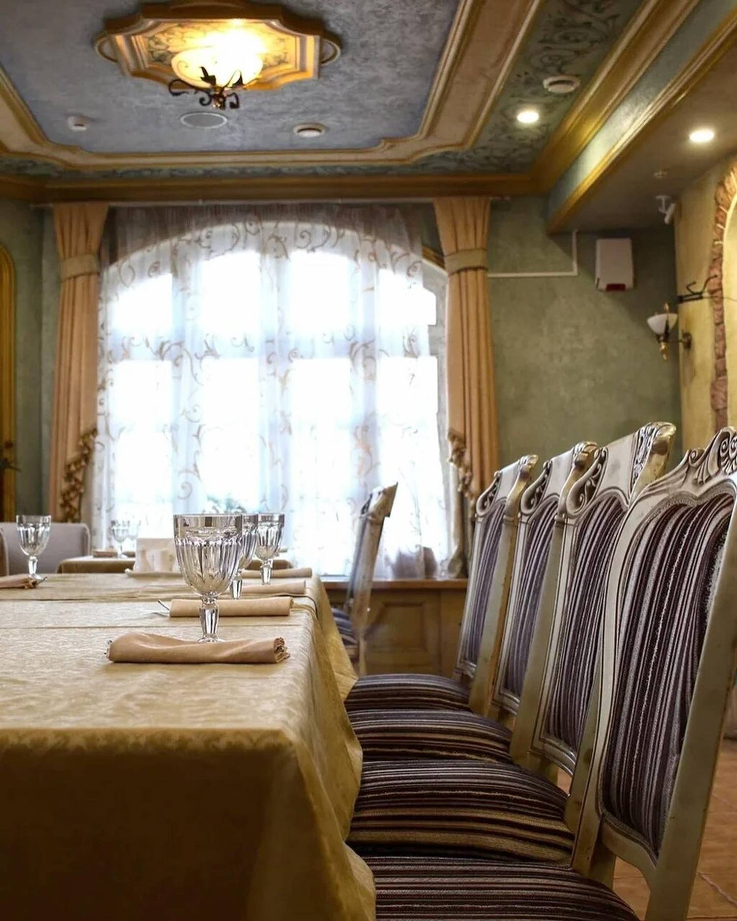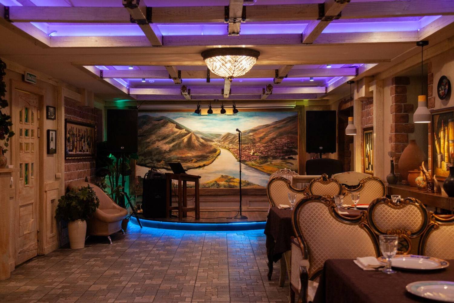 Атмосфера. Внутри зал напоминает дом знатного грузинского рода: антикварная мебель, хрустальные люстры и дубовые панели соседствуют с уютной террасой, увитой виноградом и живыми цветами. Интерьер сочетает благородную солидность гостиной особняка с камерной атмосферой сельского дома.