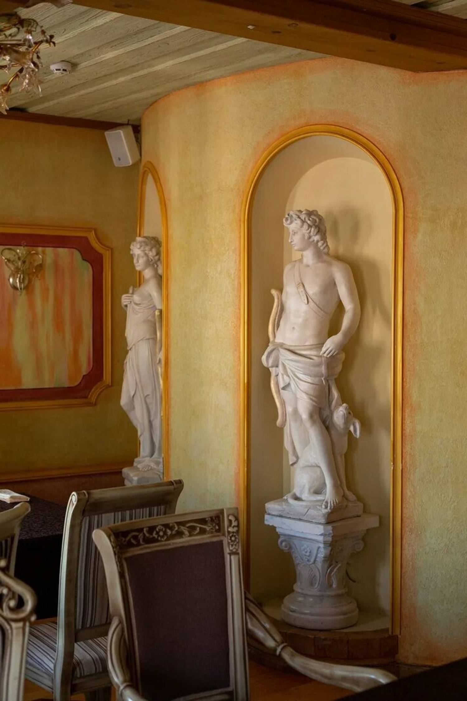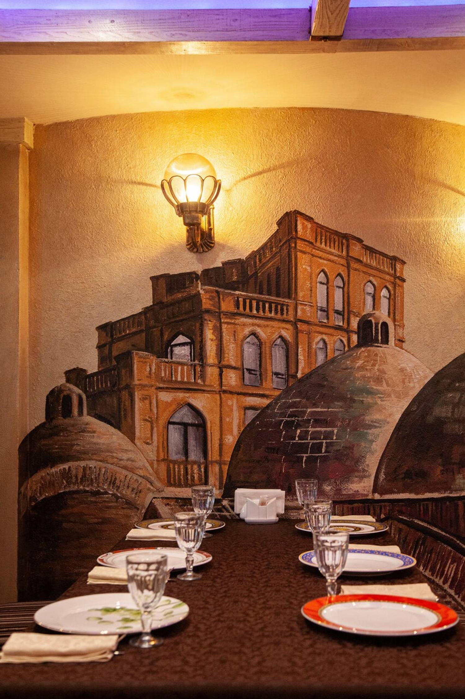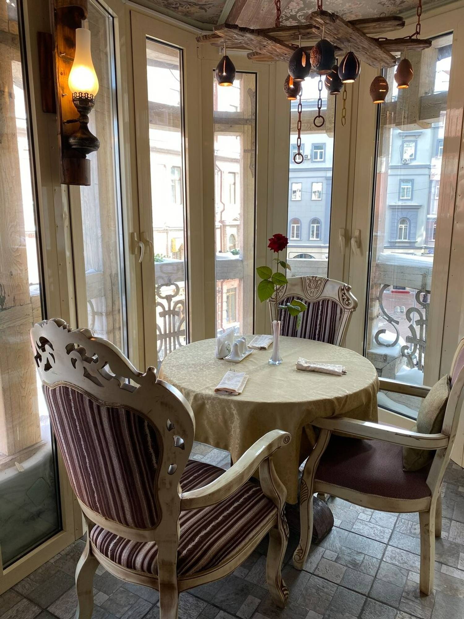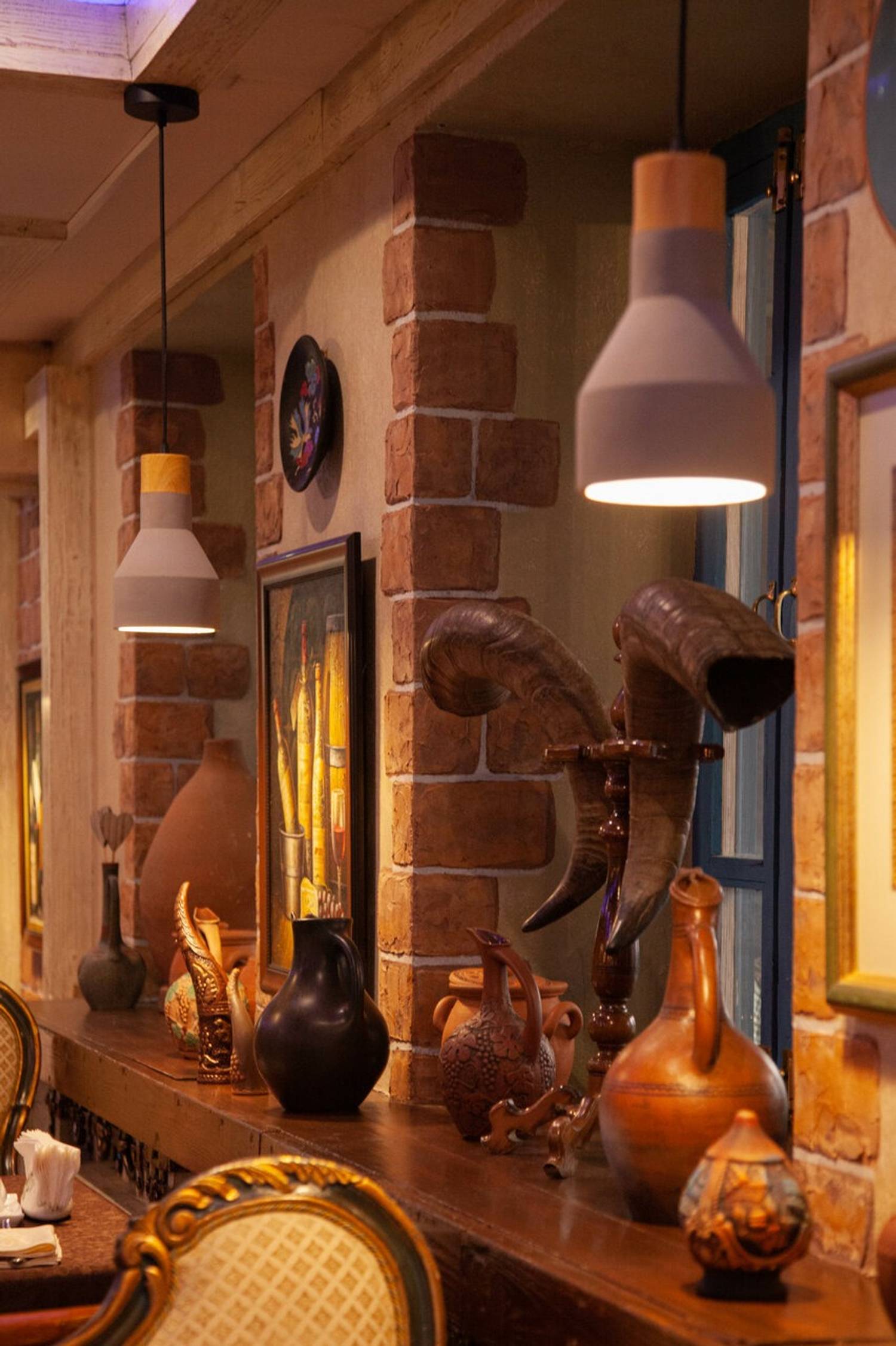 Атмосфера. Внутри зал напоминает дом знатного грузинского рода: антикварная мебель, хрустальные люстры и дубовые панели соседствуют с уютной террасой, увитой виноградом и живыми цветами. Интерьер сочетает благородную солидность гостиной особняка с камерной атмосферой сельского дома.