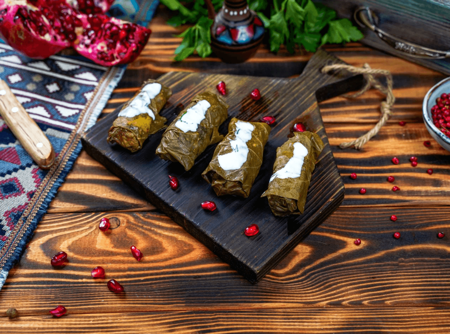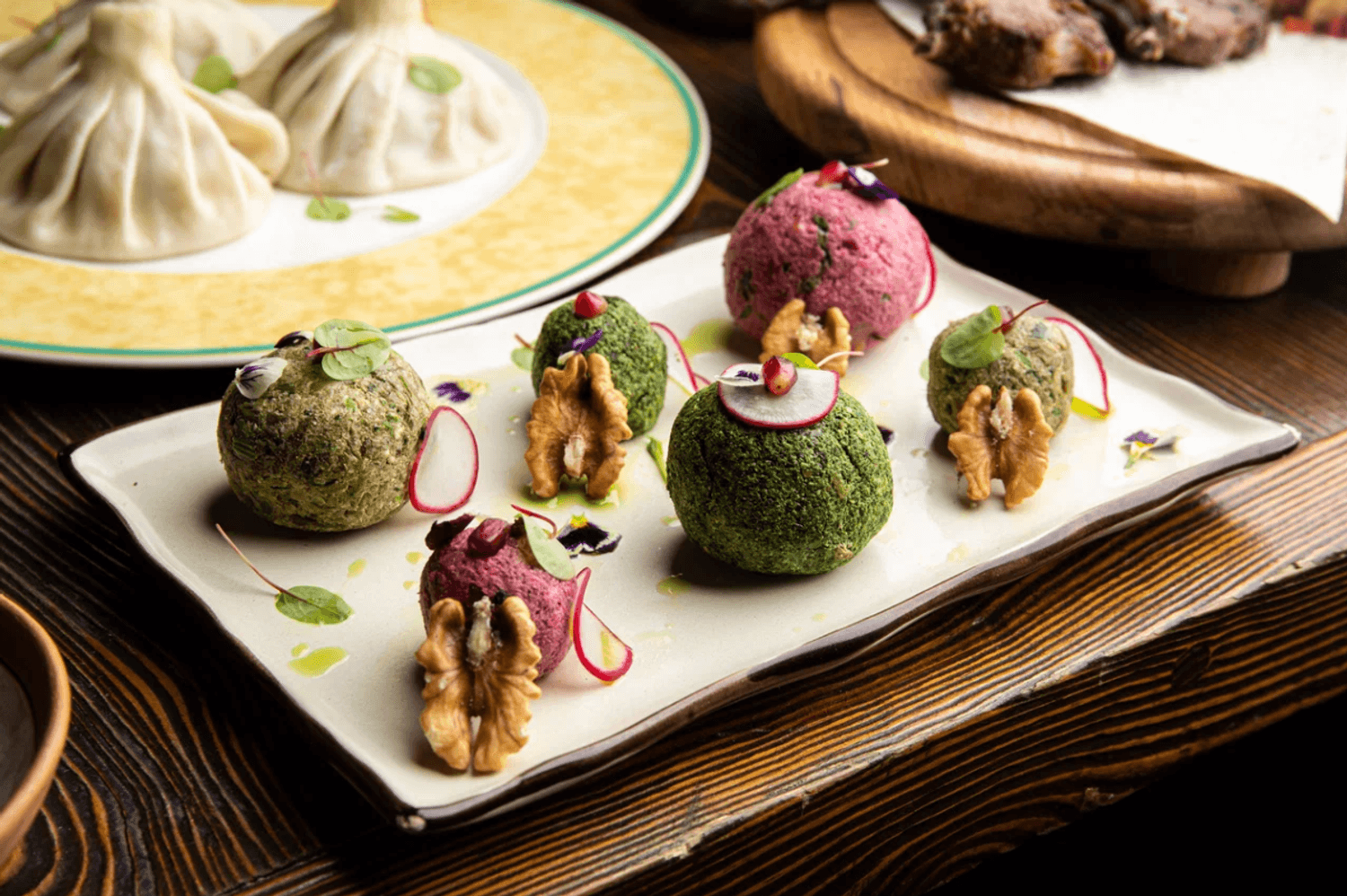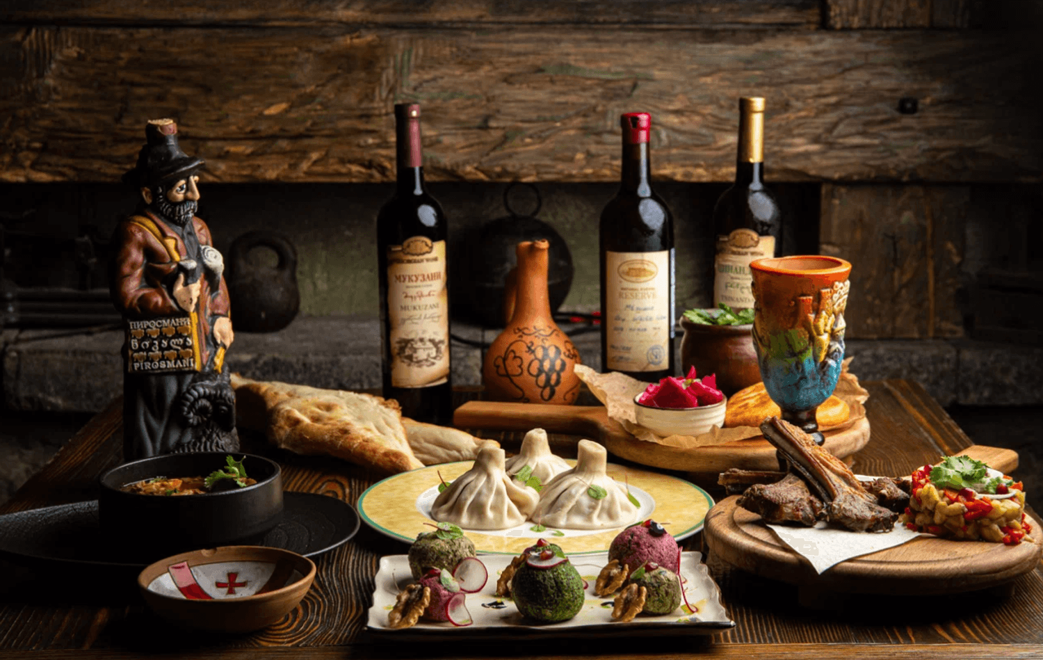 Еда и напитки. В меню — лобио, чакапули из баранины, сырные шарики с соусом из грецкого ореха, барабулька, цыпленок табака с ткемали, шашлык из телятины, хачапури по-аджарски с ветчиной. А на десерт готовят наполеон, шу и медовик.