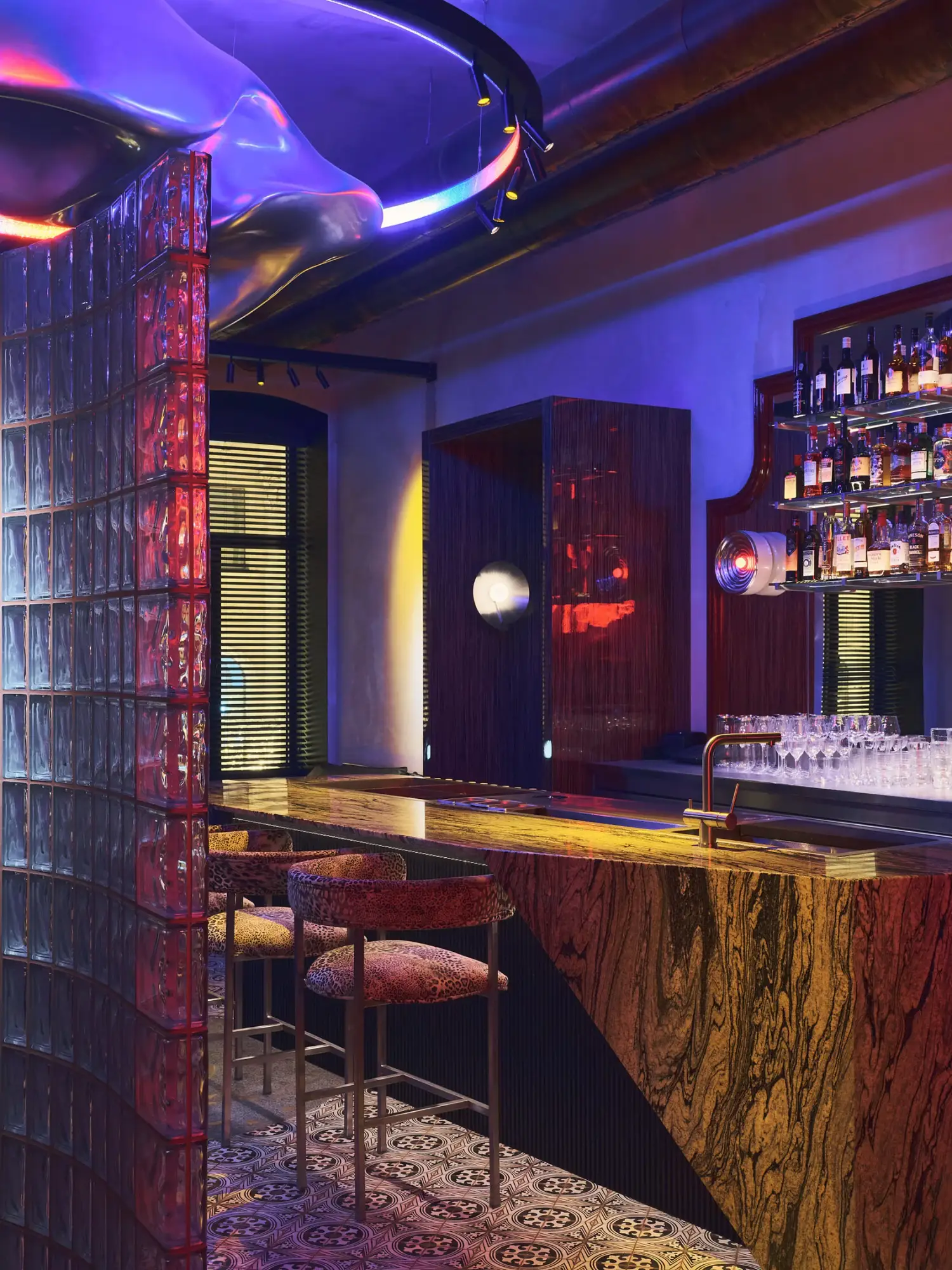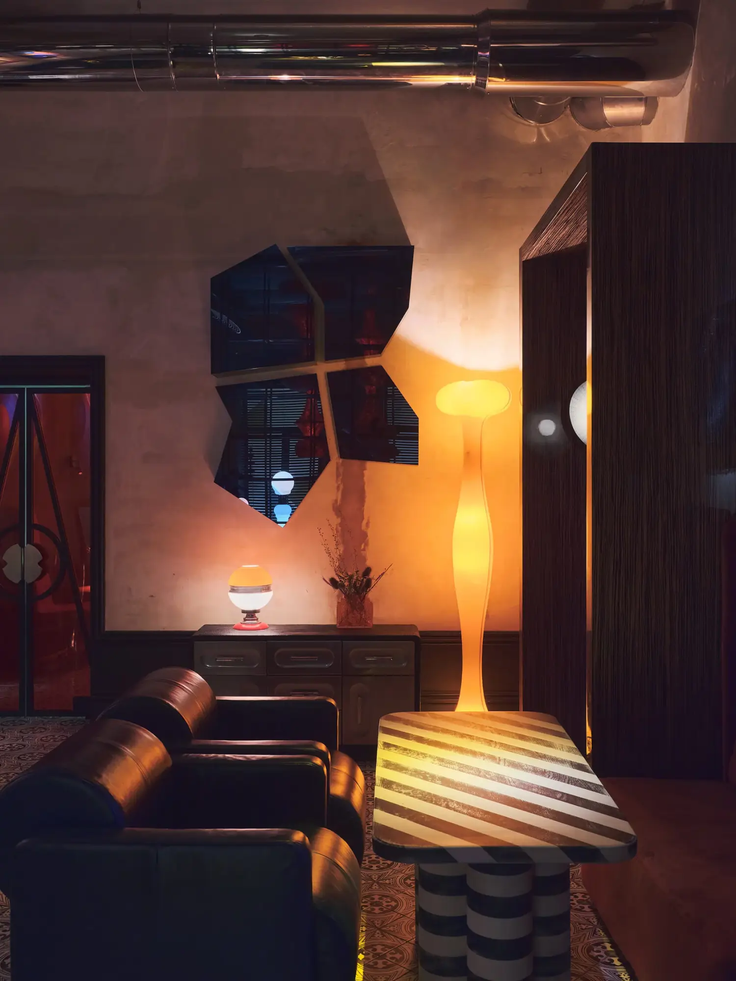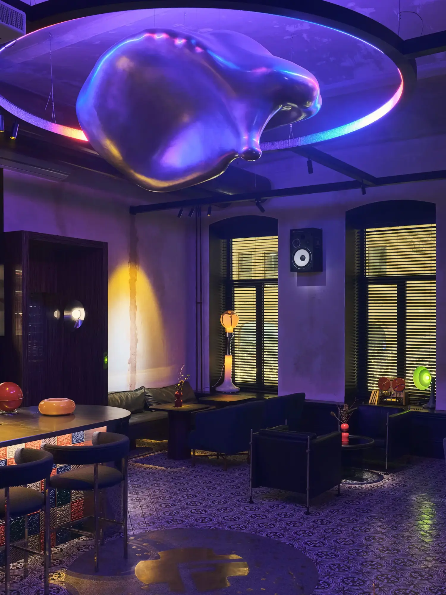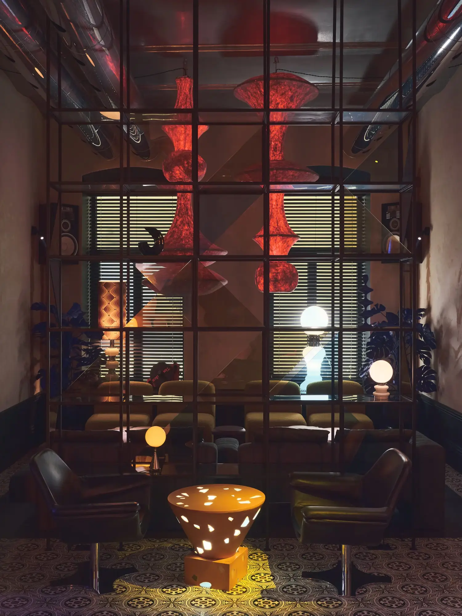 Интерьер заведения — это смесь фьюжна и ретро-футуризма. Здесь плавные линии сочетаются с четкими геометрическими формами, зелень гармонично соседствует со стеклоблоками, а экзотические принты и оригинальные светильники создают уникальную атмосферу. В таком окружении гости наслаждаются бестабачными паровыми коктейлями и живыми выступлениями музыкантов.