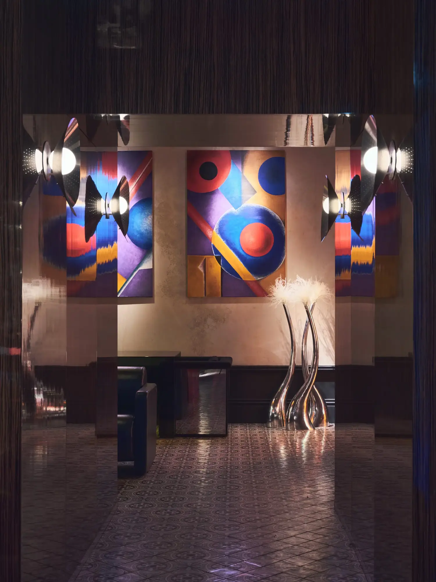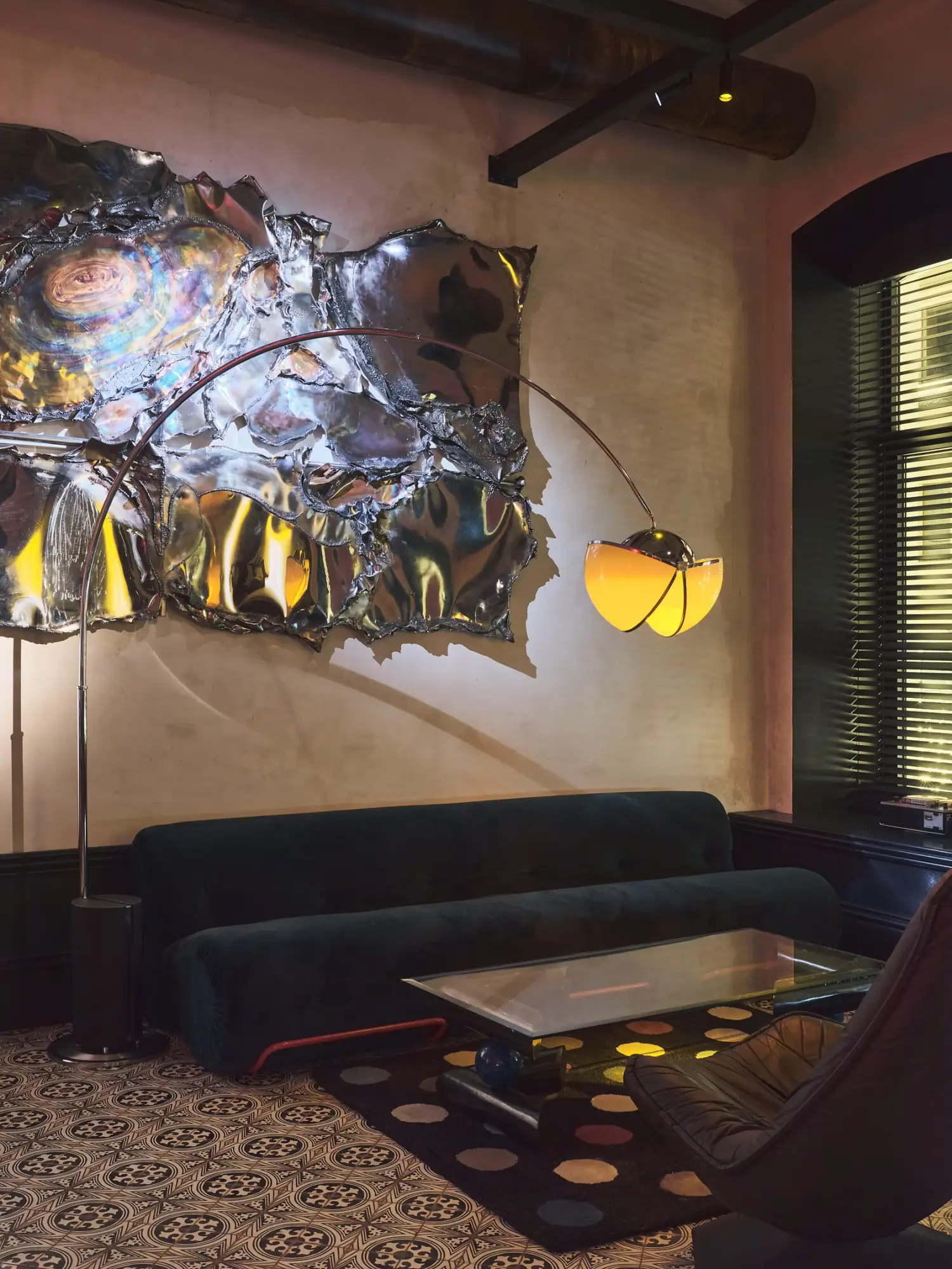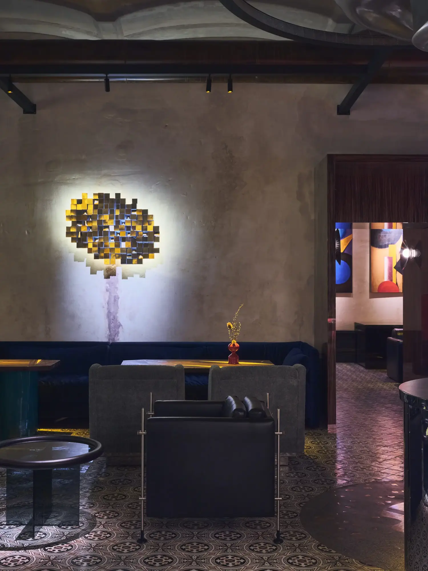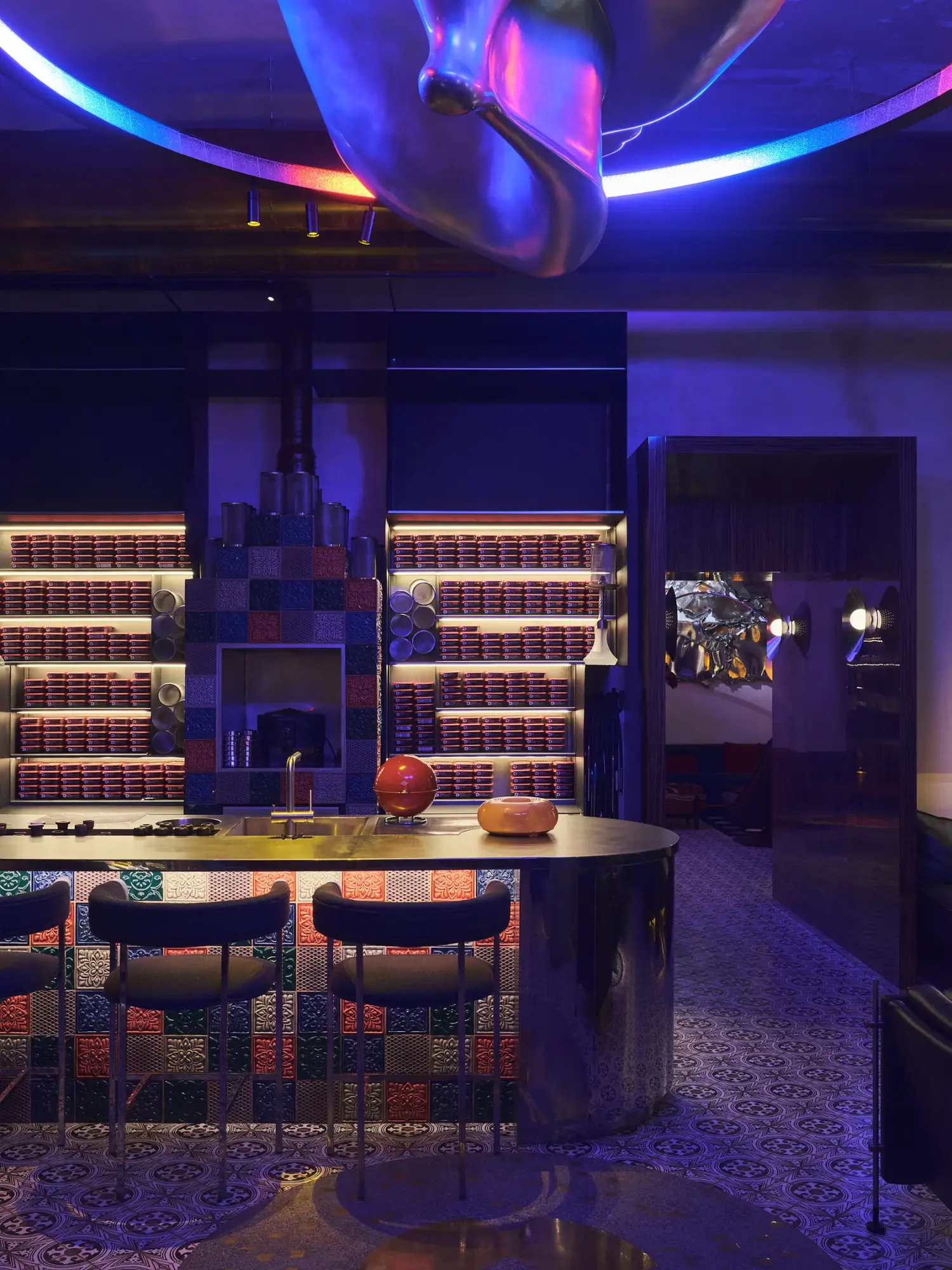 Интерьер заведения — это смесь фьюжна и ретро-футуризма. Здесь плавные линии сочетаются с четкими геометрическими формами, зелень гармонично соседствует со стеклоблоками, а экзотические принты и оригинальные светильники создают уникальную атмосферу. В таком окружении гости наслаждаются бестабачными паровыми коктейлями и живыми выступлениями музыкантов.