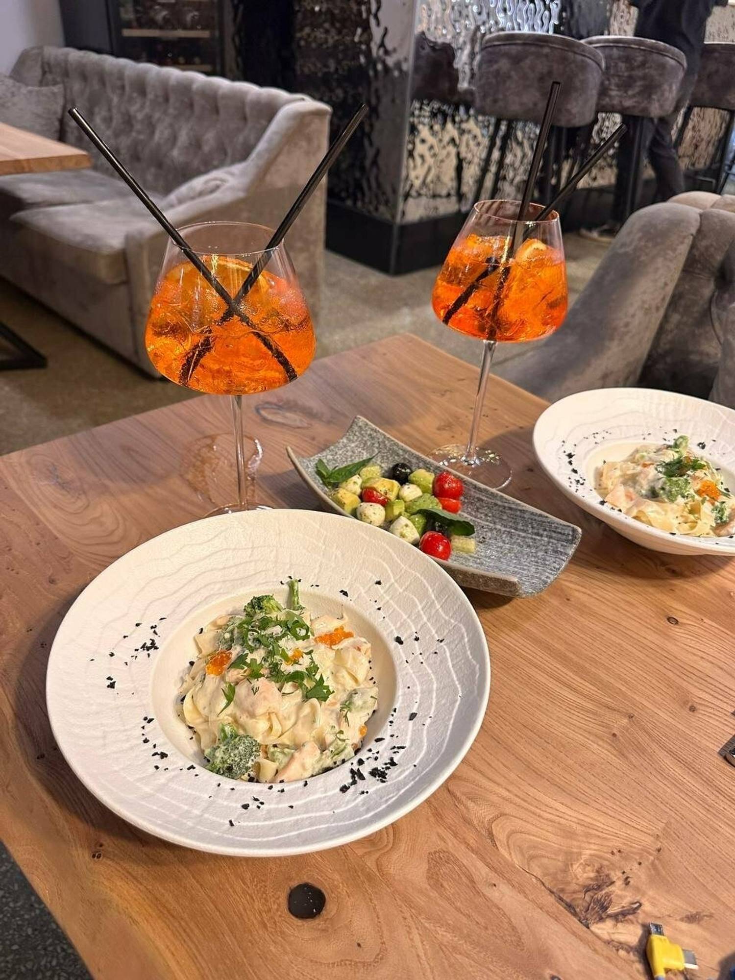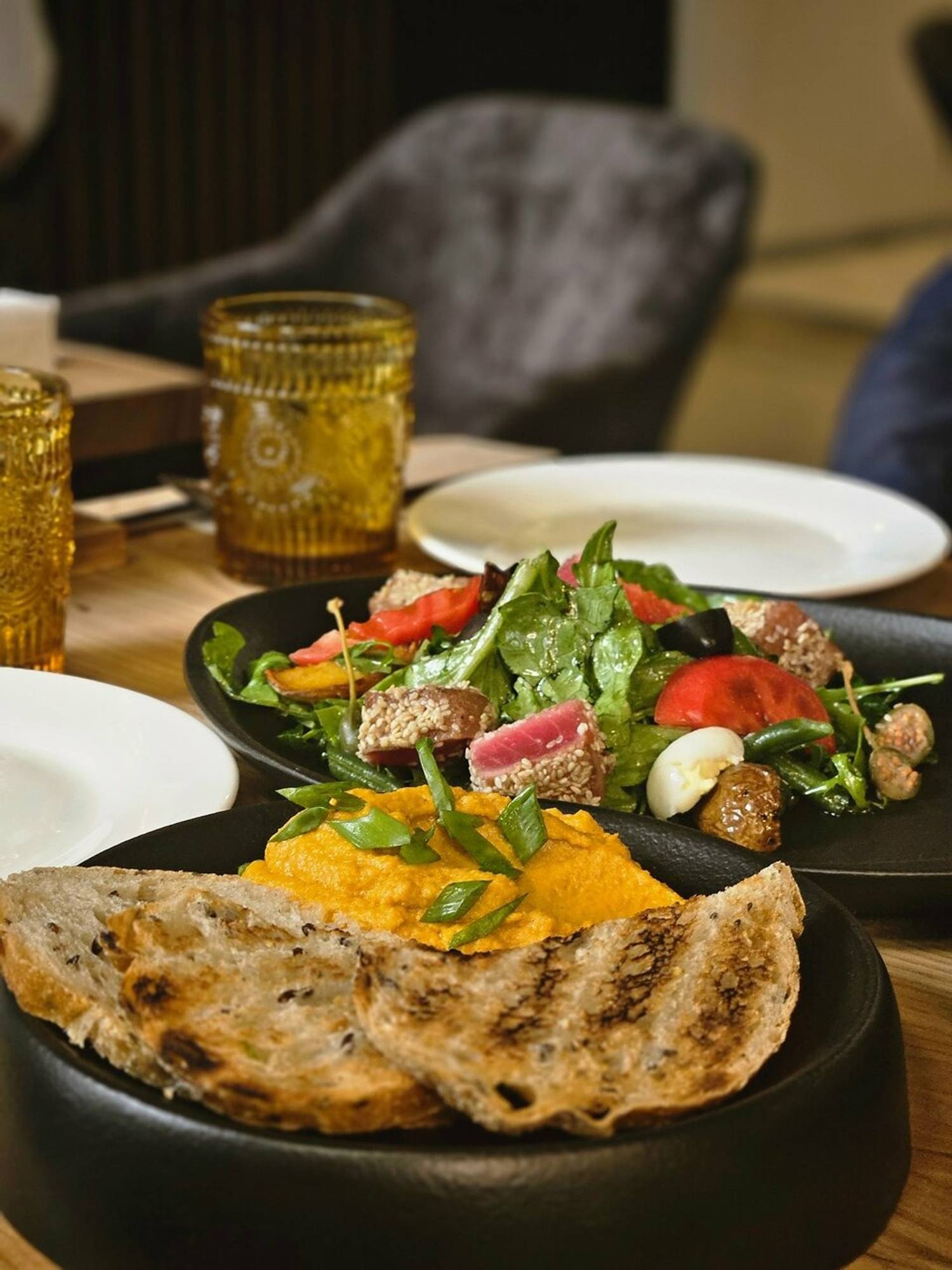 Еда и напитки. Меню из европейской классики, которая соседствует с азиатскими хитами: том ям, стейки, свиные ребра, бургеры, морепродукты на закуску. Мясо жарят на мангале, у морепродуктов — правильная текстура, у супа — баланс кислого и острого. Всё это можно заказать с доставкой, если не хочется выходить из дома, или взять комбо-обед в будни — сытно, быстро, без компромиссов во вкусе. Барная карта не пытается соперничать с профильными коктейльными заведениями, но свои позиции держит уверенно: два десятка вин, классика, крепкий алкоголь и авторские коктейли вроде «Цветов осени» с мандарином и бабл-гамом — неожиданно, питко, без приторности.