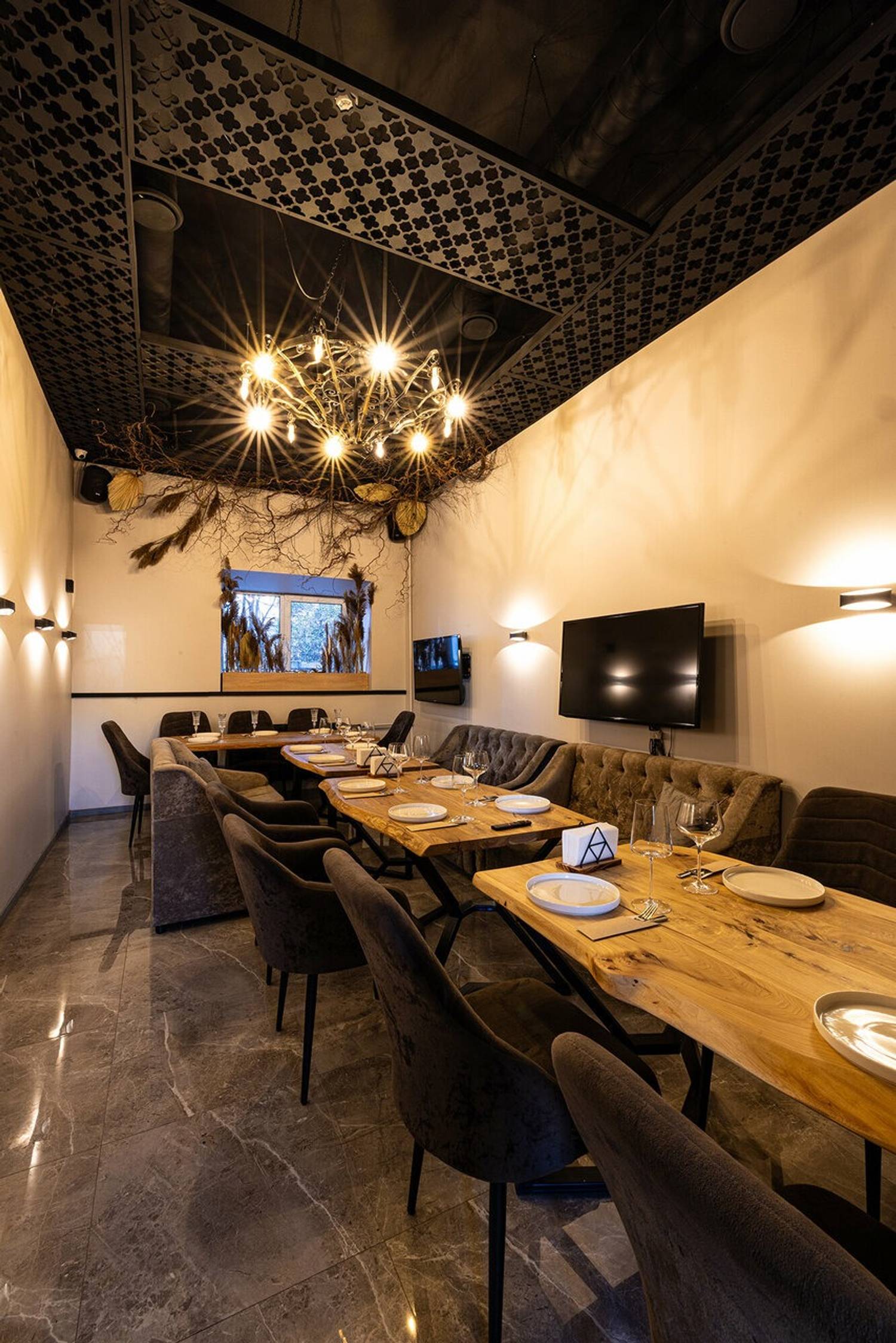 Атмосфера. Интерьер здесь простой — без попыток удивить модными фактурами или кричащими инсталляциями. Дерево, текстиль, мягкий свет, три отдельные VIP-комнаты для тех, кому нужна полная приватность. Пространство живет разными ритмами: в будни сюда приходят на бизнес-ланч, по выходным — отмечают мальчишники и семейные праздники. На больших экранах транслируют спортивные трансляции, но они не доминируют в зале, а скорее дополняют вечер для тех, кто пришёл болеть. Здесь любители кальянов оценят паровые коктейли.