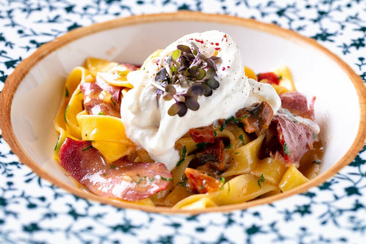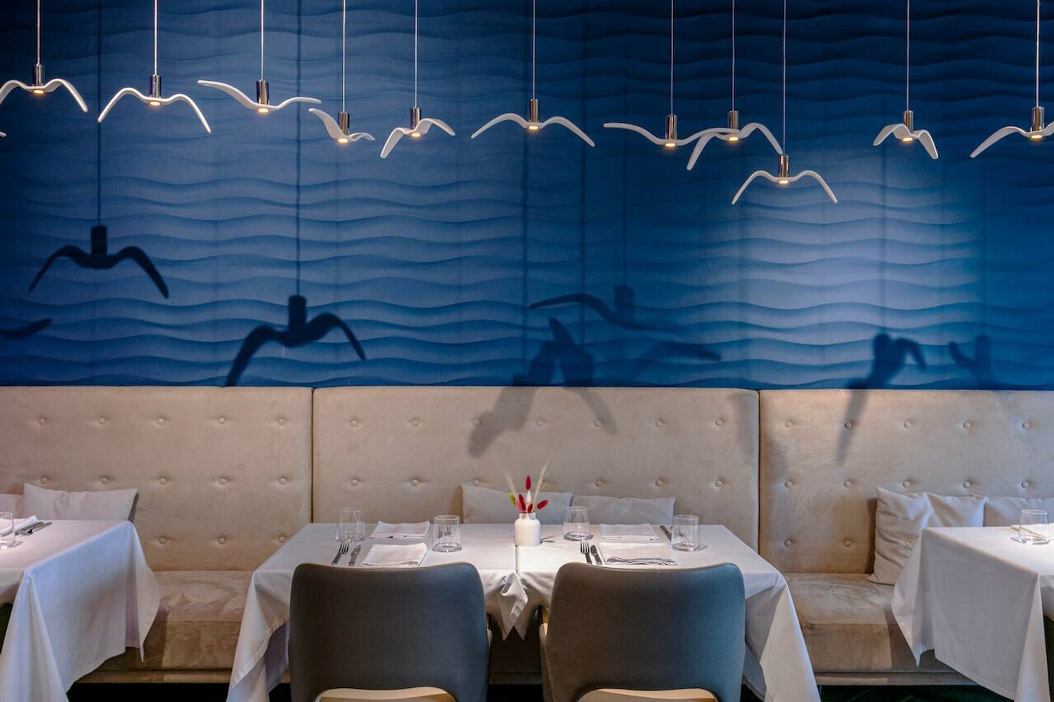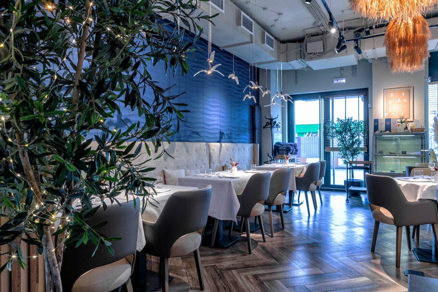 Атмосфера. Интерьер здесь собирали с любовью к деталям. Лимонные деревья в кадках, сухоцветы, винные бутылки на полках, белые скатерти, светлые диваны — все это работает на одну задачу: создать ощущение, что ты не в Москве, а где-то на солнечном побережье Италии, в маленькой семейной траттории, где хозяева радуются каждому гостю. Полки с вином занимают целые стены — это и декор, и намек: здесь знают толк в напитках. Летом открывается терраса, и тогда ужин становится почти курортным.