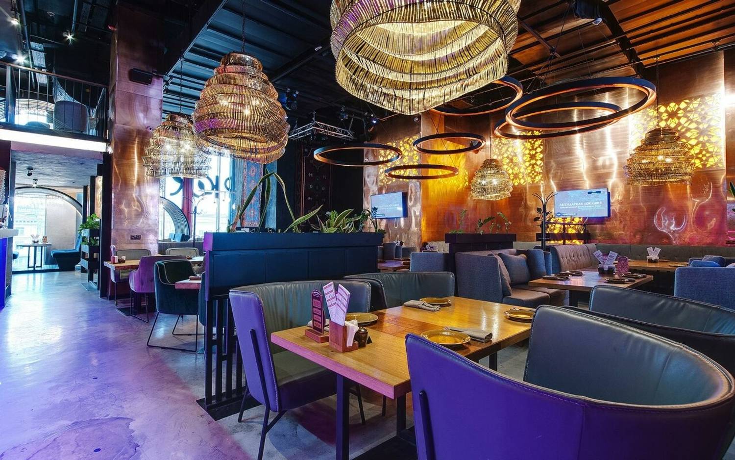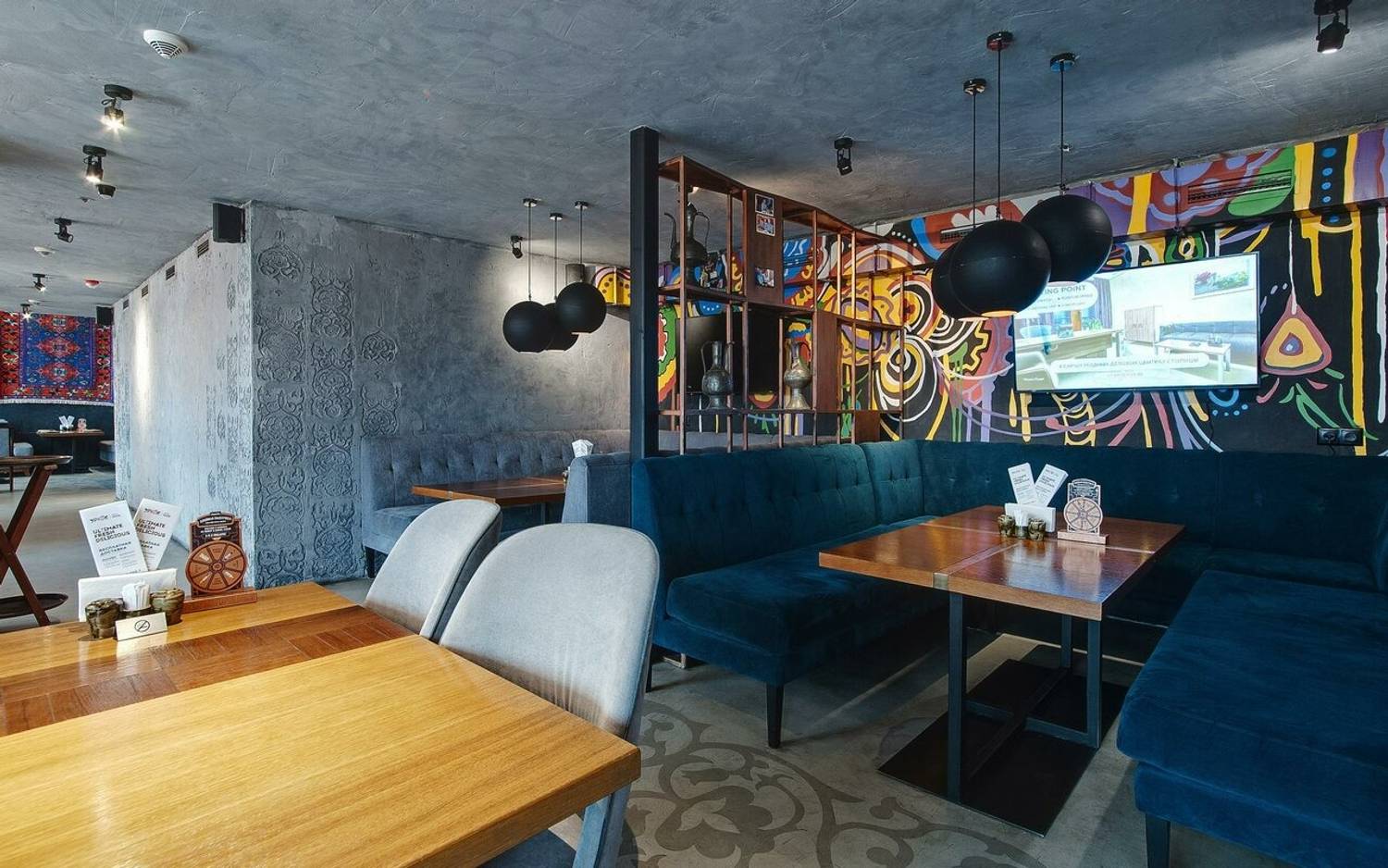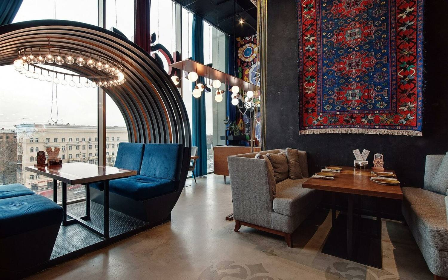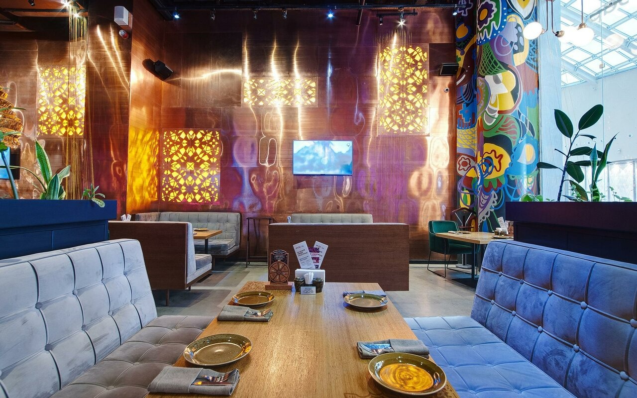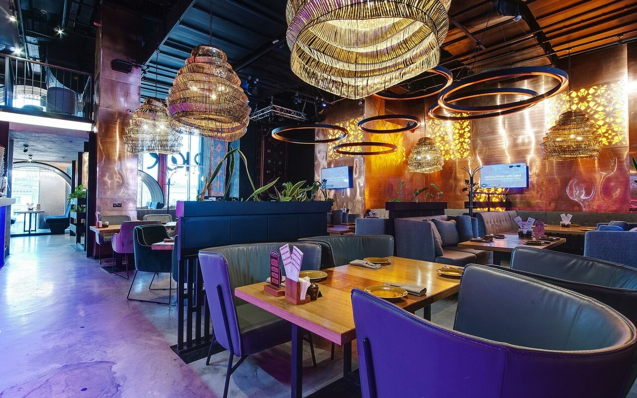 Атмосфера. Двухуровневое пространство ресторана объединяет восточные мотивы с элементами современного дизайна: красно-синий ковер на стене, яркие орнаменты на стенах и национальная посуда на полках. Гости могут расположиться на мягких диванах в общем зале или выбрать уединенные ниши с панорамными окнами, откуда открывается вид на город.