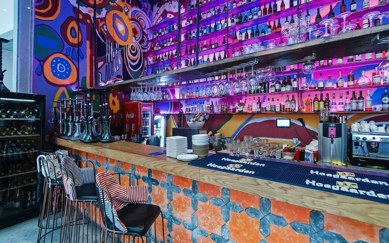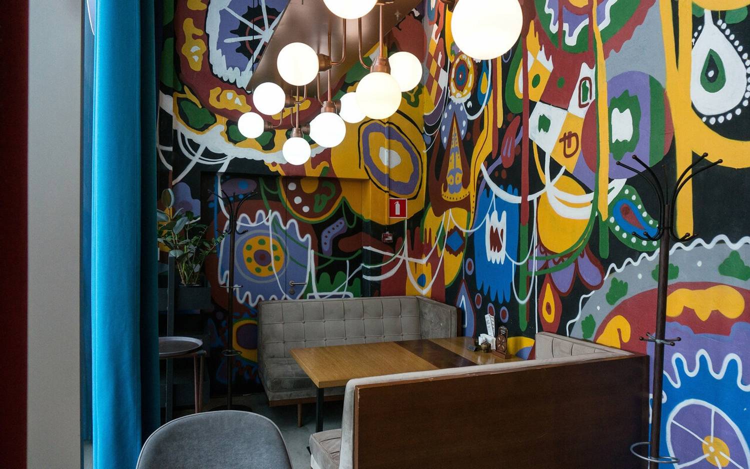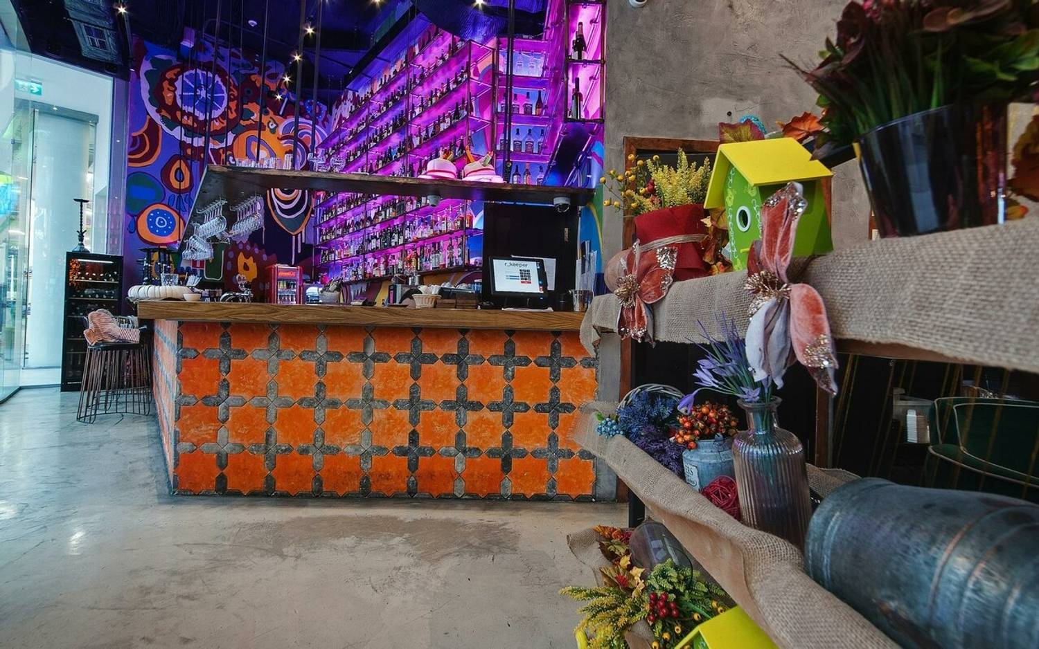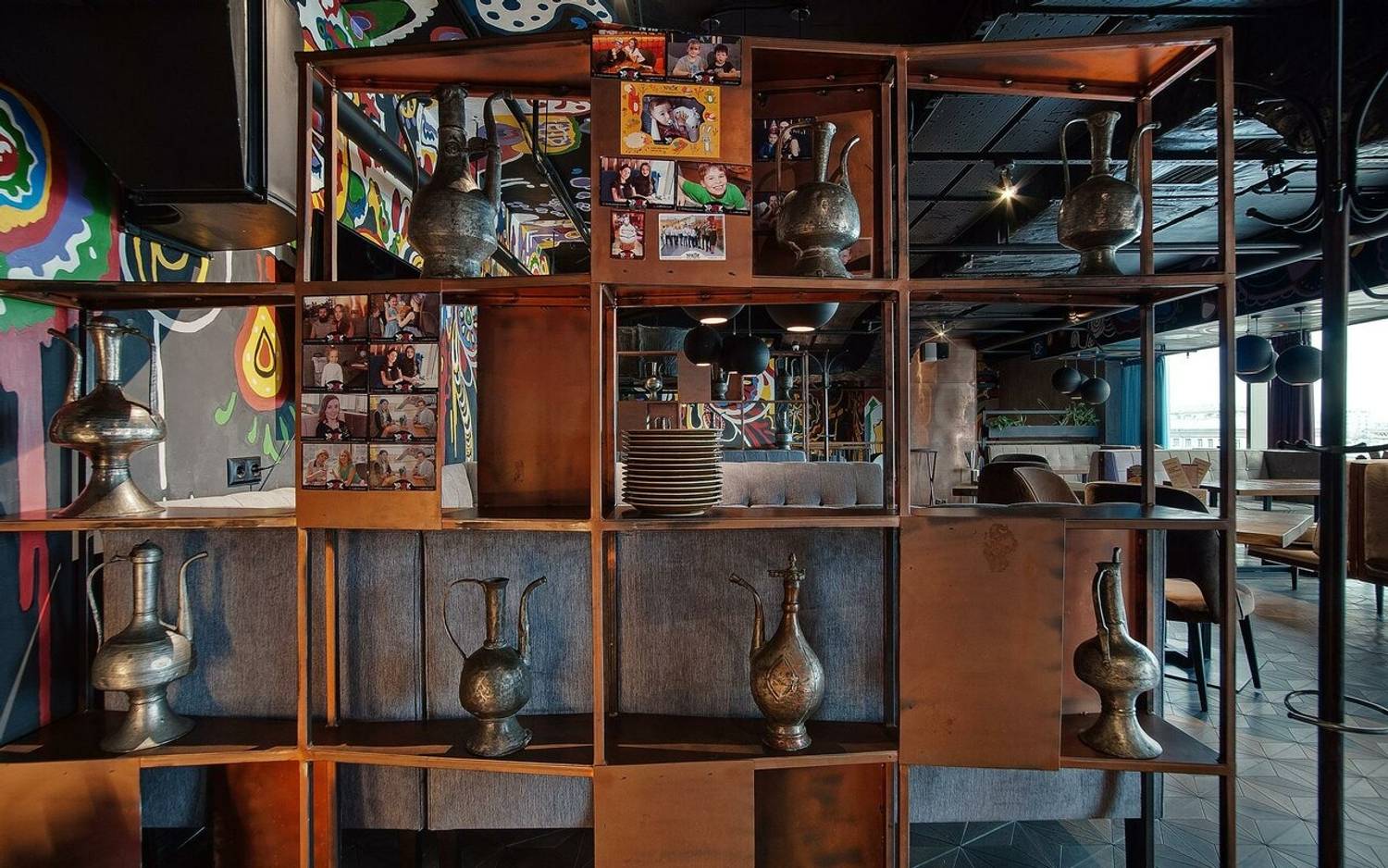 Атмосфера. Двухуровневое пространство ресторана объединяет восточные мотивы с элементами современного дизайна: красно-синий ковер на стене, яркие орнаменты на стенах и национальная посуда на полках. Гости могут расположиться на мягких диванах в общем зале или выбрать уединенные ниши с панорамными окнами, откуда открывается вид на город.