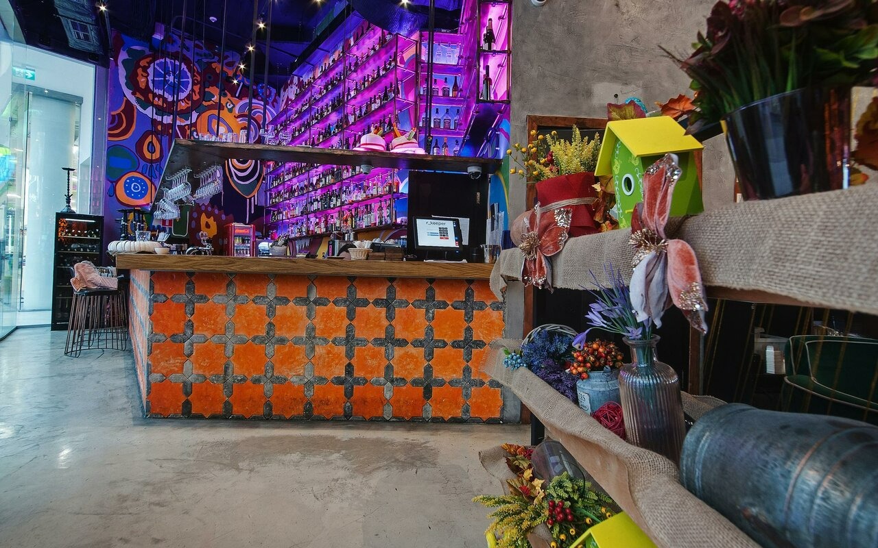 Еда и напитки. В меню — чайханский плов, ролл с лососем и сливочным сыром, бефстроганов с мраморной говядиной, аджапсандали, хумус бейрутский. Из выпечки готовят самсу по-бухарски с курицей и говядиной, кутаб с зеленью, тандырная лепешка. А на десерт подают дубайский чизкейк и яблочный пирог.