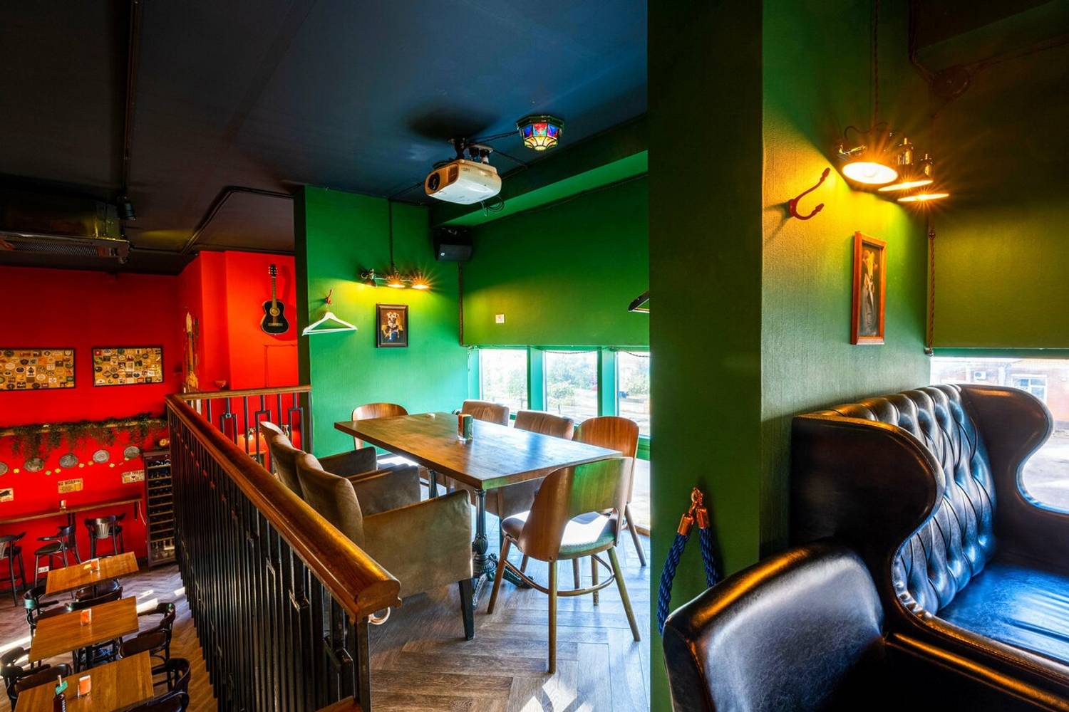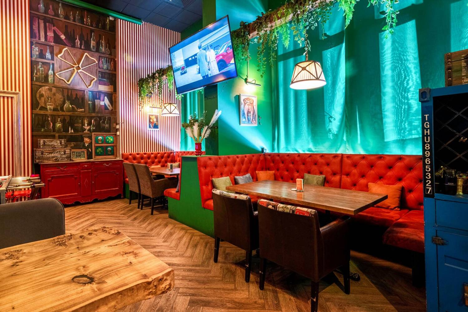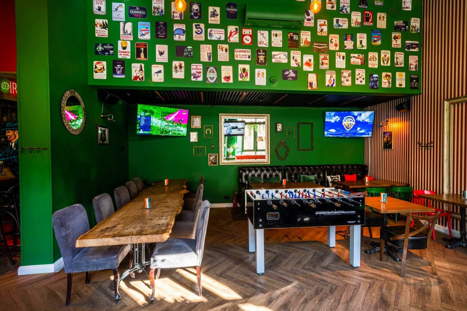 Атмосфера. Внутри — классический ирландский уют: приглушенный свет, теплая древесина, мягкие диваны, в которые хочется провалиться с кружкой пива. В интерьере фирменные красные и зеленые оттенки. Запах свежего эля витает в воздухе, смешиваясь с ароматами из кухни. Днем здесь тихо и спокойно — можно зайти перекусить или поработать. Вечером пространство оживает: начинаются квизы, турниры по мафии, концерты местных групп. Для любителей спорта — большие экраны и живые трансляции. А те, кто засиделись на месте, могут поиграть в кикер.