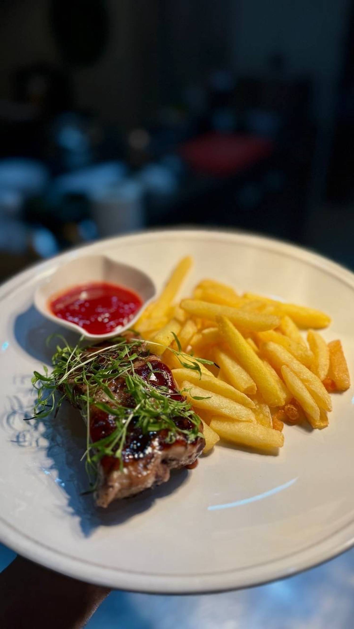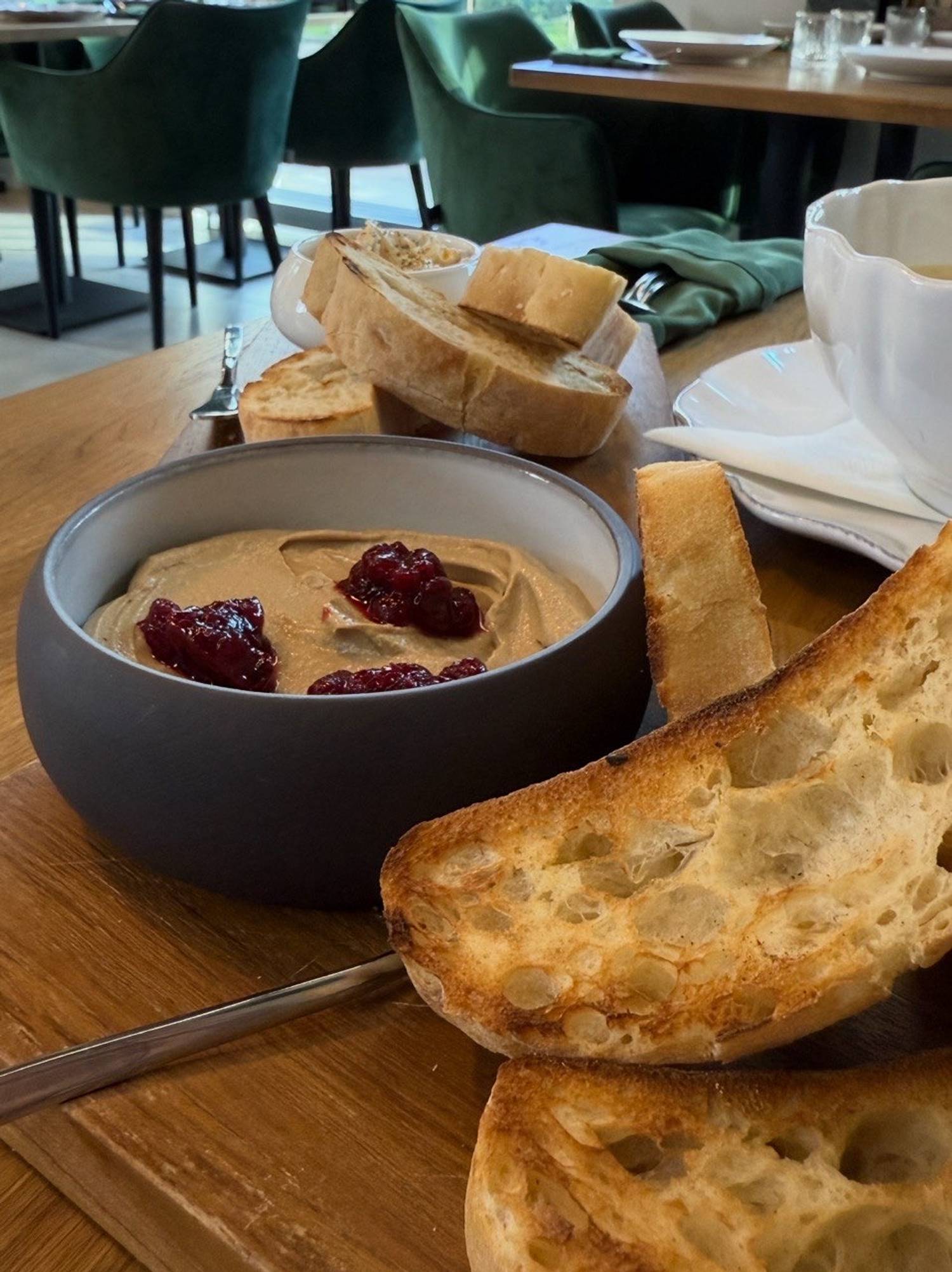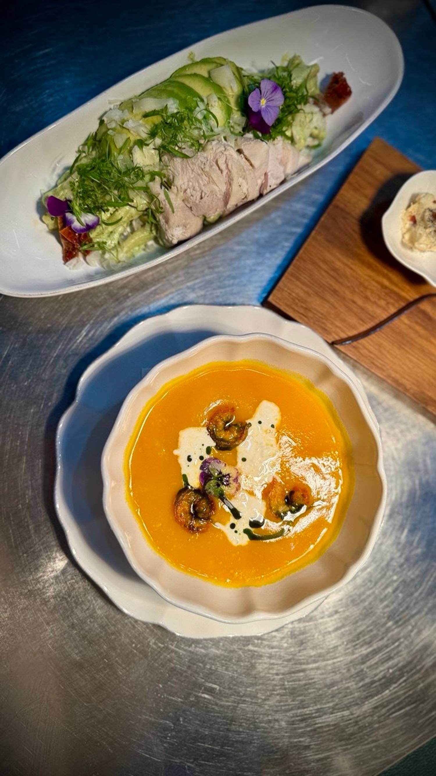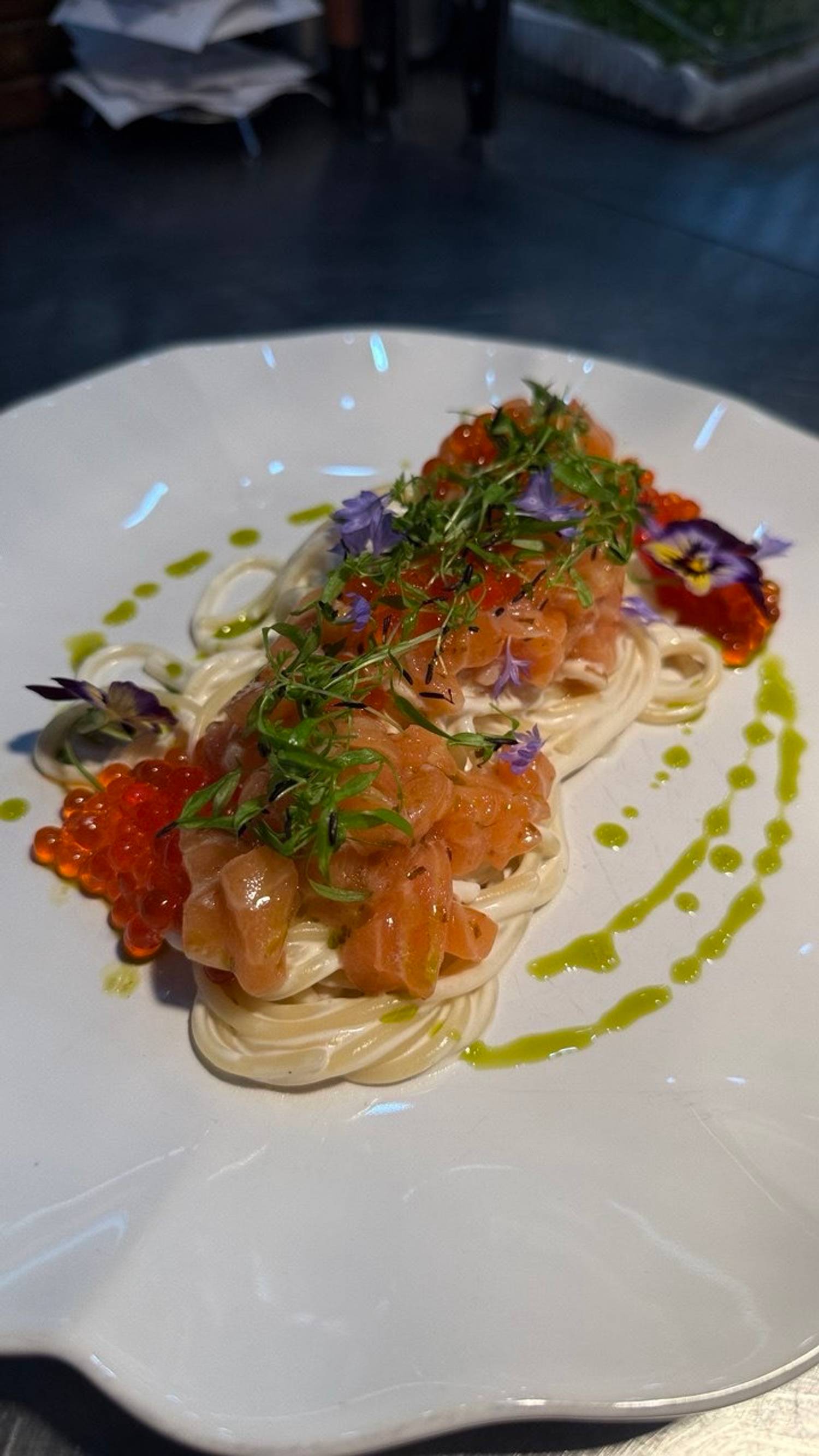 Еда и напитки. Меню здесь — авторские вариации европейской классики с эстетичной подачей и неожиданными акцентами. Буррата с томатами и еловыми шишками — да, те самые шишки, которые добавляют блюду лесной нотки. Авокадо с тартаром из угря — для любителей экспериментов на грани. Брускетта с тартаром из говядины и маринованными опятами — отличный баланс мяса и грибов. Пончики с креветками и печеным соусом терияки — это уже чистое хулиганство, но какое же вкусное. Завтраки здесь тоже с фантазией: японский бриошь с омлетом и лососем, ленивые сырники из топленого творога с ягодами, круассан с манго и маракуйей. Сладость, свежесть, экзотика — и все это до обеда. Барная карта — отдельная гордость. Авторские коктейли с названиями, от которых улыбаешься: «Персиковый шампань», «Рафаэлло», «Тукан». Последний, видимо, в честь тех самых птиц, что сидят на стенах. Лёгкие, фруктовые, с правильным балансом — идеальное сопровождение для тропического вечера.