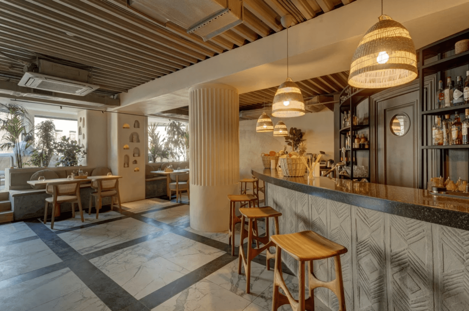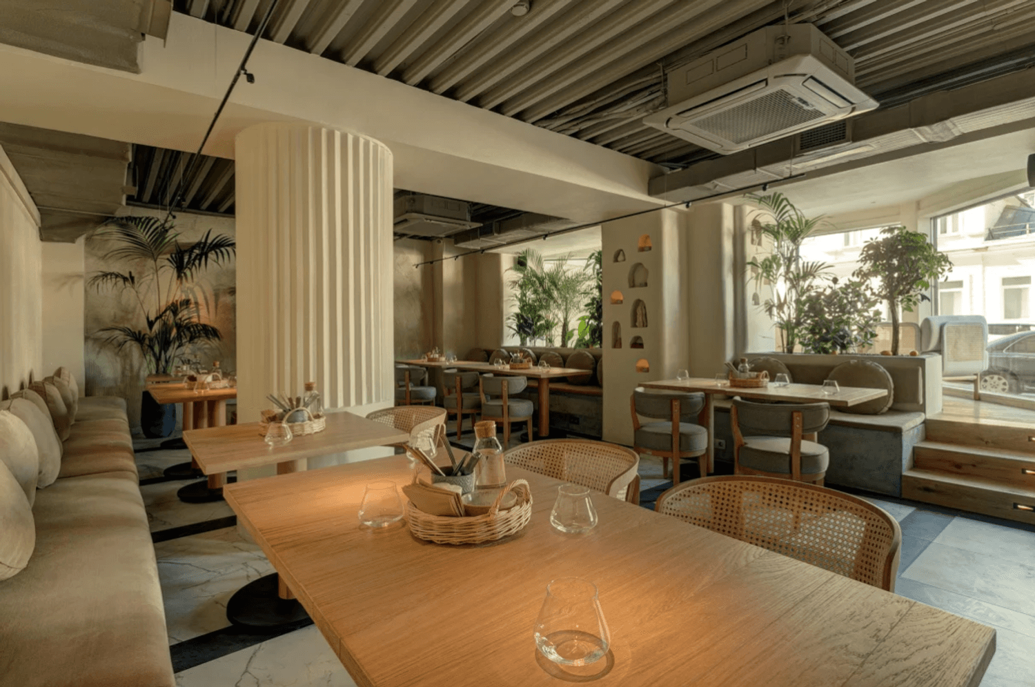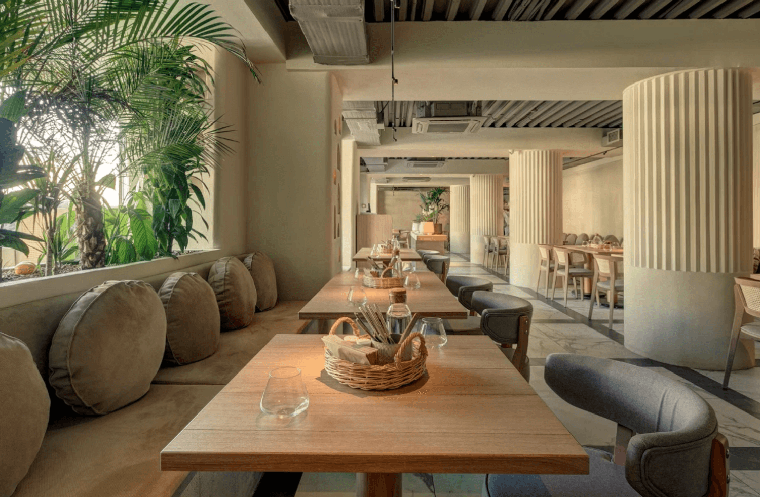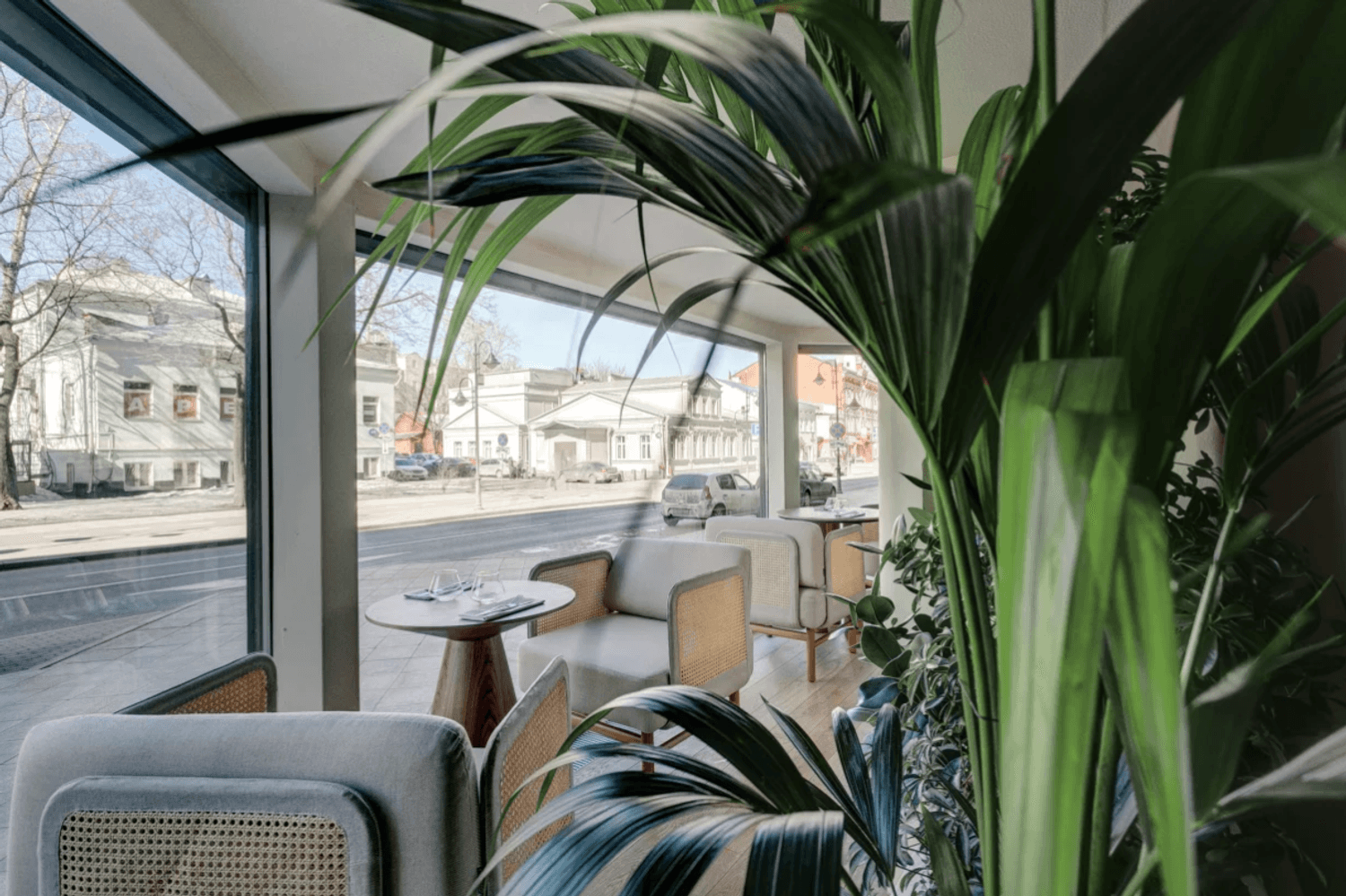 Атмосфера. Пространство оформлено в стиле мексиканского курорта с акцентами современного стиля: плавные линии стен и мебели, натуральные материалы — белый камень, светлое дерево, соломенные светильники и обилие зелени. Летняя терраса с песочными оттенками, плетеными коврами и соломенными зонтиками воссоздает атмосферу Тулума.