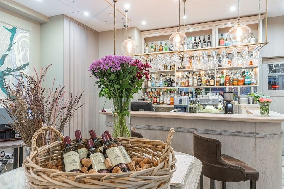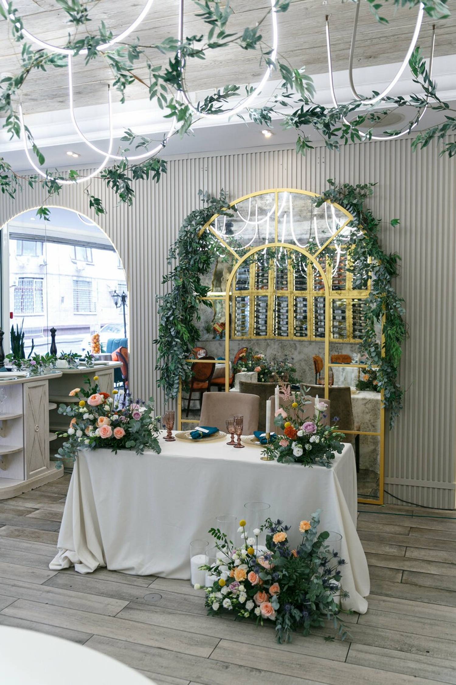 Атмосфера. Пространство с арками, которые разделяют зал на две половины. Теплая деревянная мебель, арочные люстры, бело-кремовая гамма и изумрудно-оранжевые акценты в обивке стульев создают гармонию.