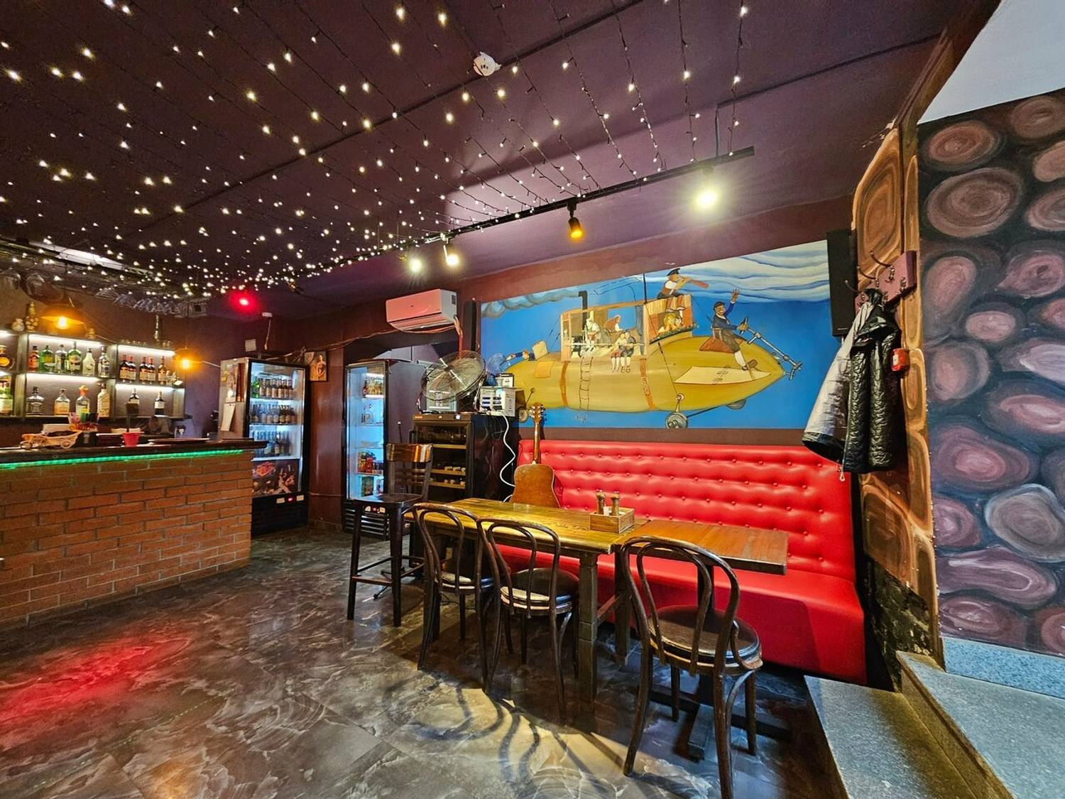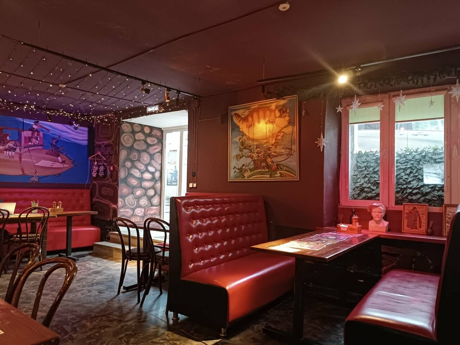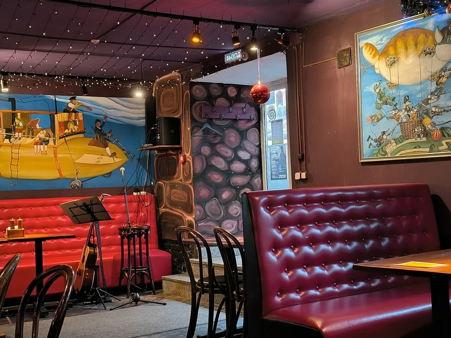 Атмосфера. Внутри — уютный и одновременно немного хулиганский стиль. Бордовые кожаные диваны, кирпичные стены, венские стулья, картины с дирижаблями на стенах. Барная стойка сложена из кирпича — грубо, честно, по-домашнему. Есть небольшая сцена для музыкантов: каждую пятницу и субботу здесь исполняют живую музыку, поют любимые песни, принимают заявки из зала. Проводят тематические встречи, музыкальные вечера. Место, куда приходят не просто поесть, а провести время с душой.