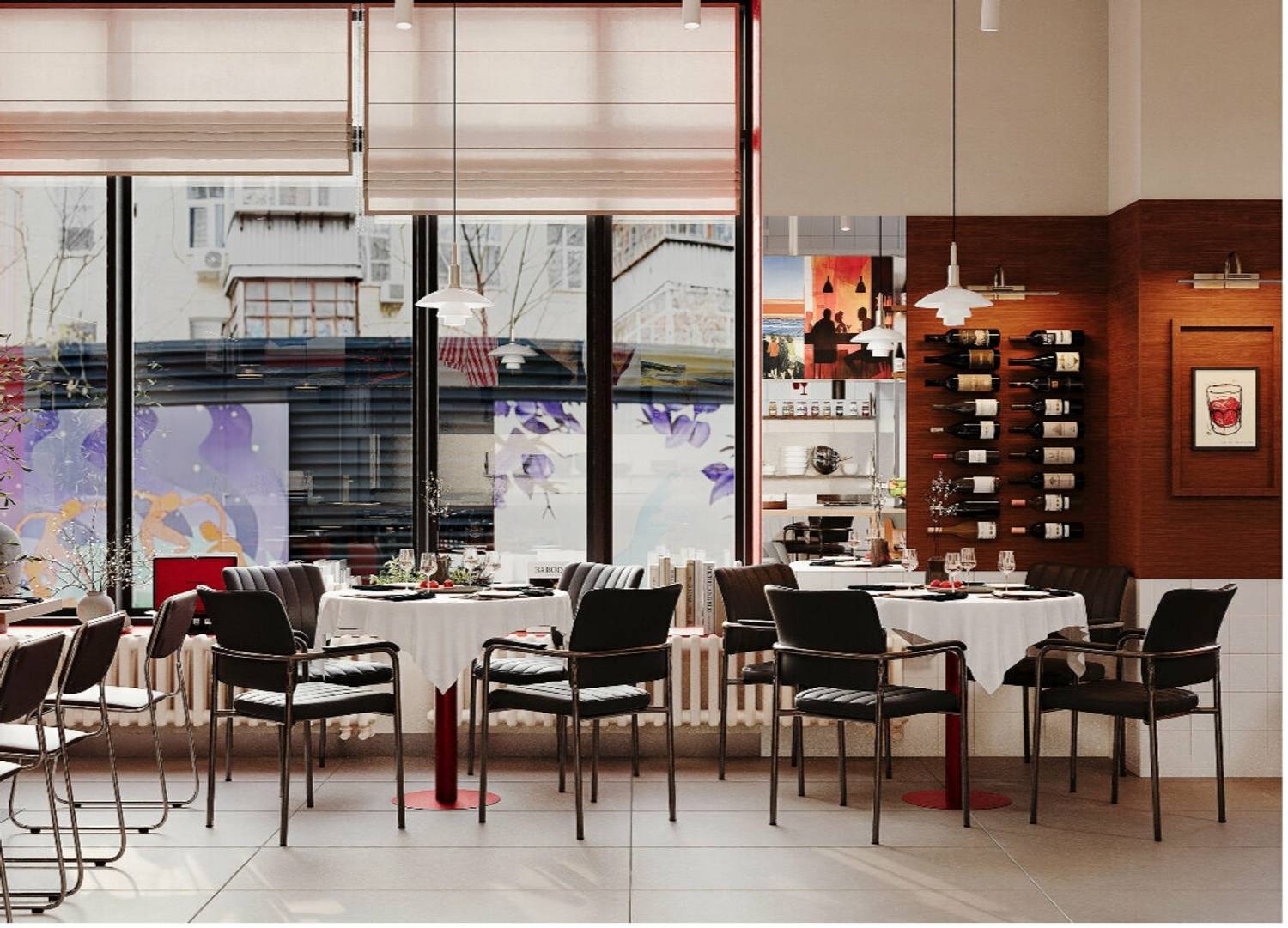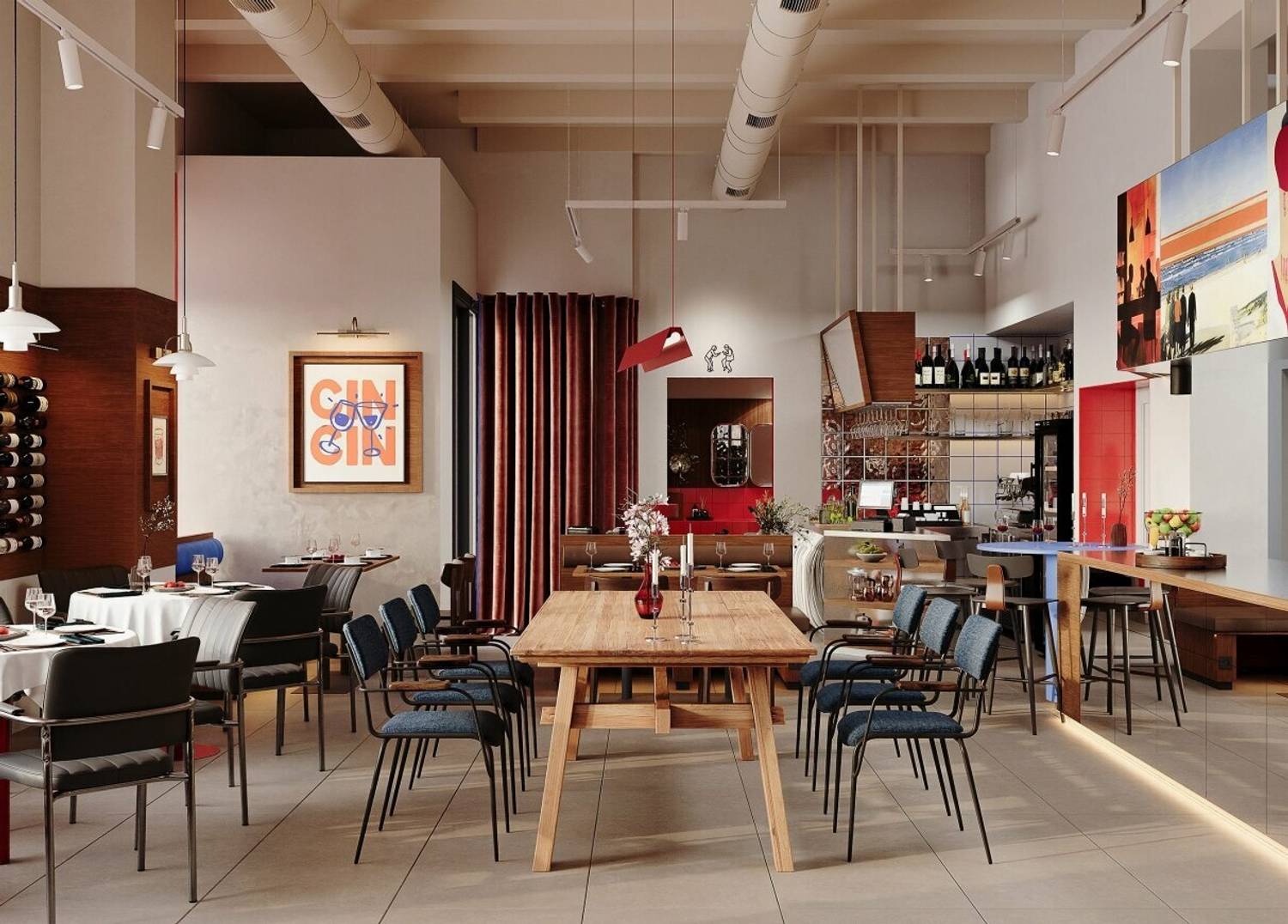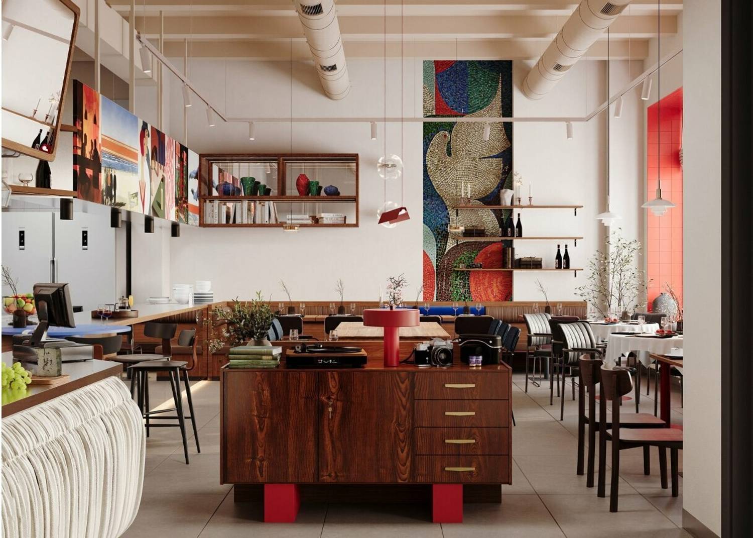 Атмосфера. Пространство заряжает энергией и желанием остаться подольше. Здесь много контрастов, постеры на стенах, барная стойка отделана зеркальной плиткой, а яркие дофаминовые элементы добавляют настроения с первых минут. Светлые стены и обилие контрастов создают динамичный фон, который не перегружает, а наоборот, настраивает на легкое общение. Здесь комфортно зайти на обед, задержаться на ужин или просто выпить коктейль, рассматривая детали продуманного дизайна.