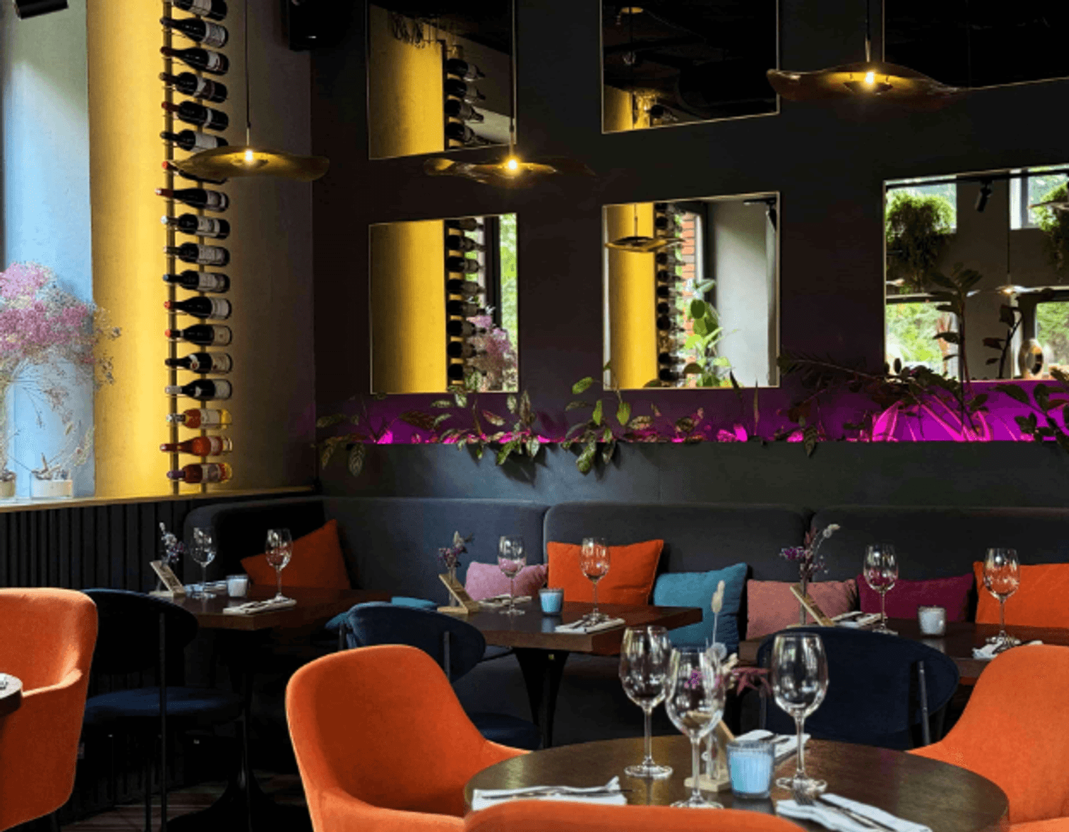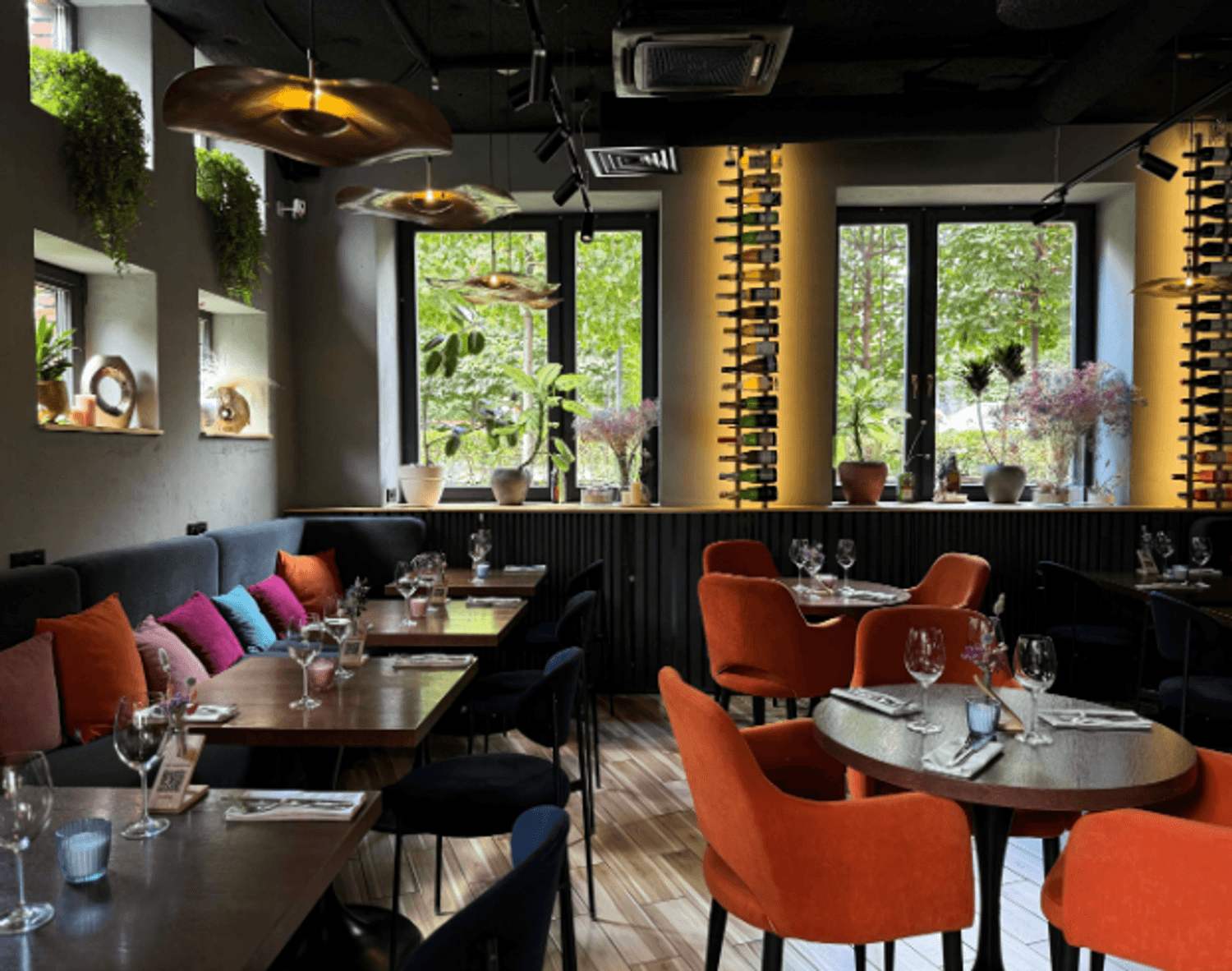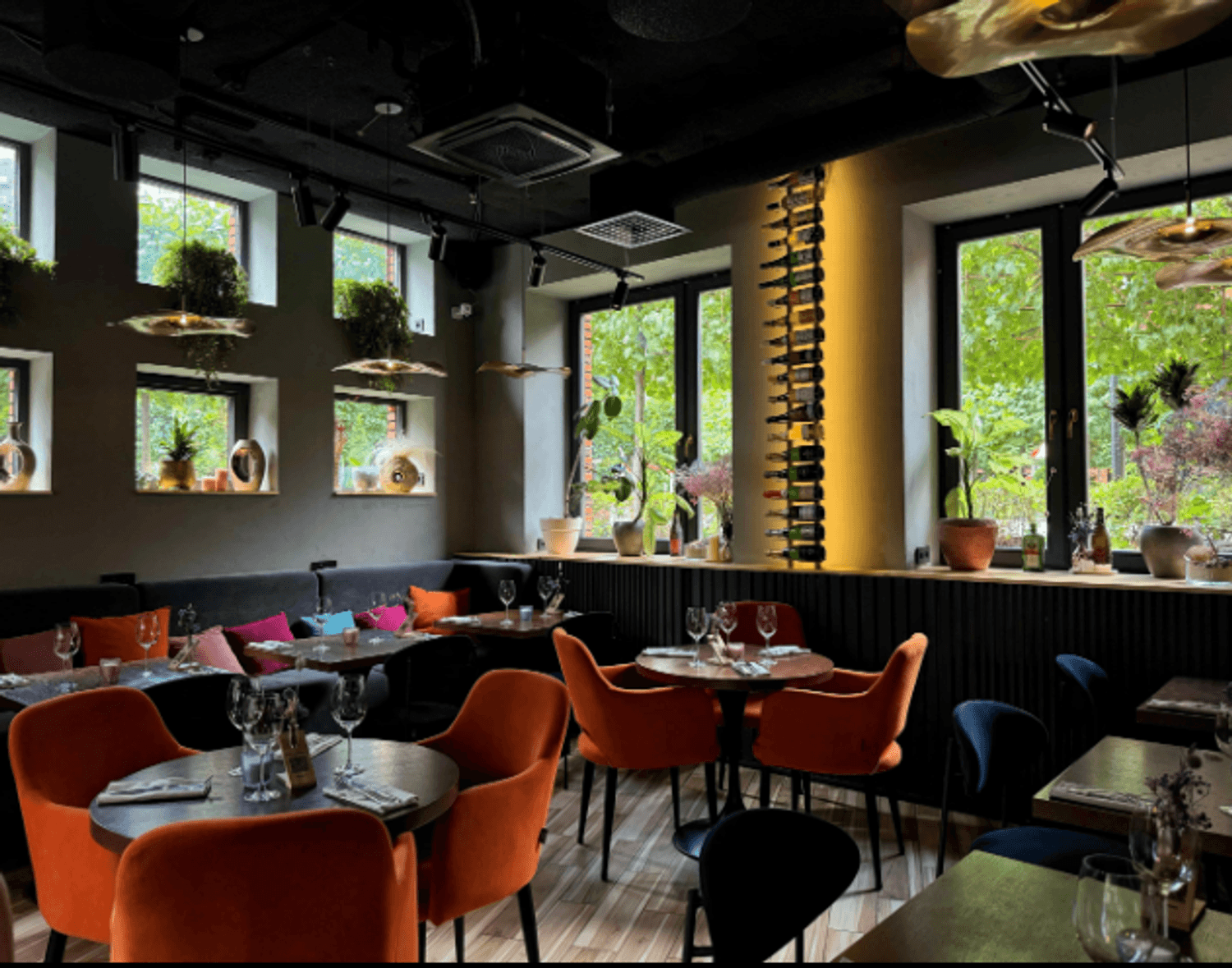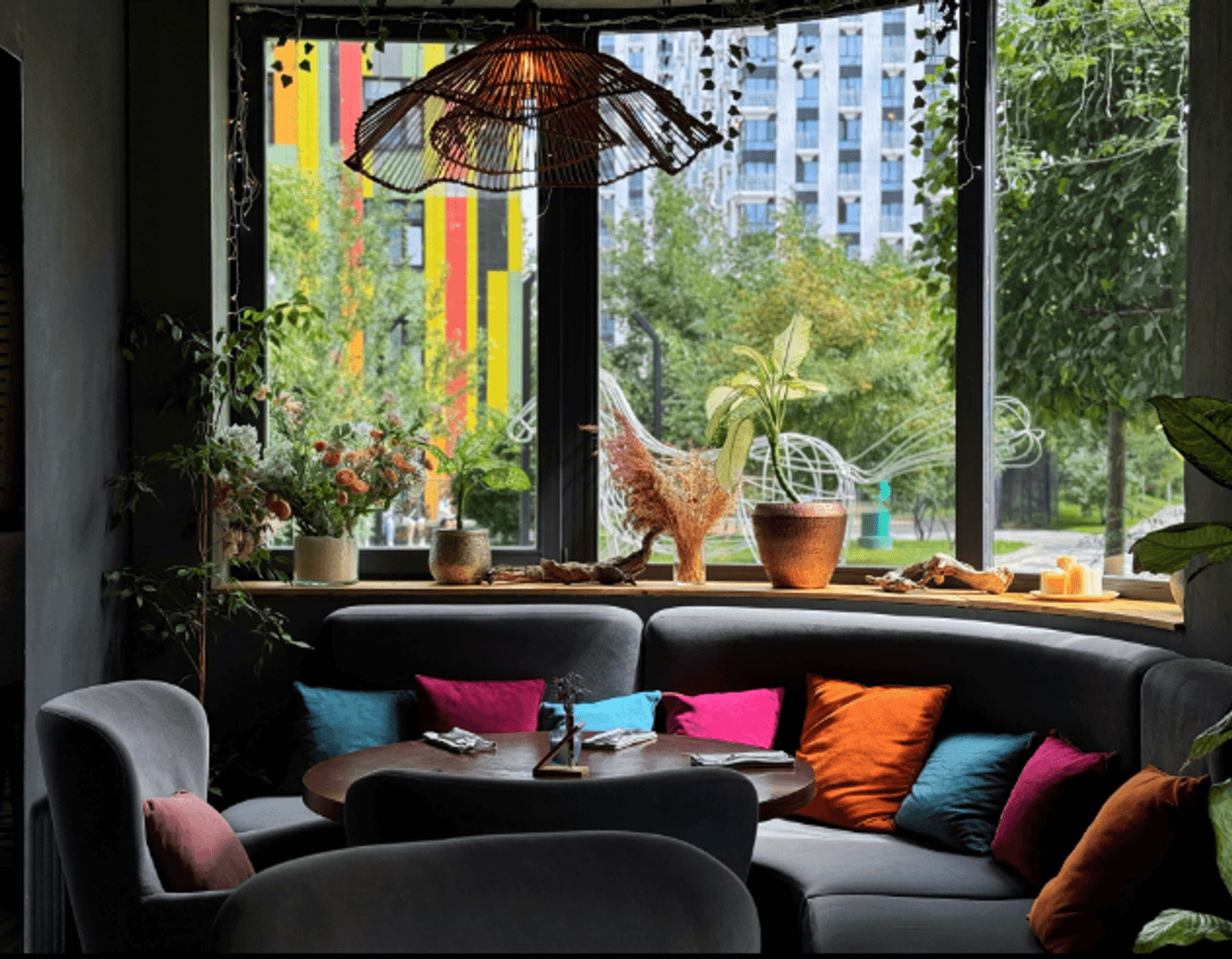 Атмосфера. Пространство с большими окнами оформлено в кофейных и синих тонах с оранжевыми акцентами. В интерьере использованы велюровые диваны, люстры с абажурами, свечи в нишах и композиции из сухоцветов, а необычные окна навевают мысли о необычных работах архитектурных дизайнеров.
