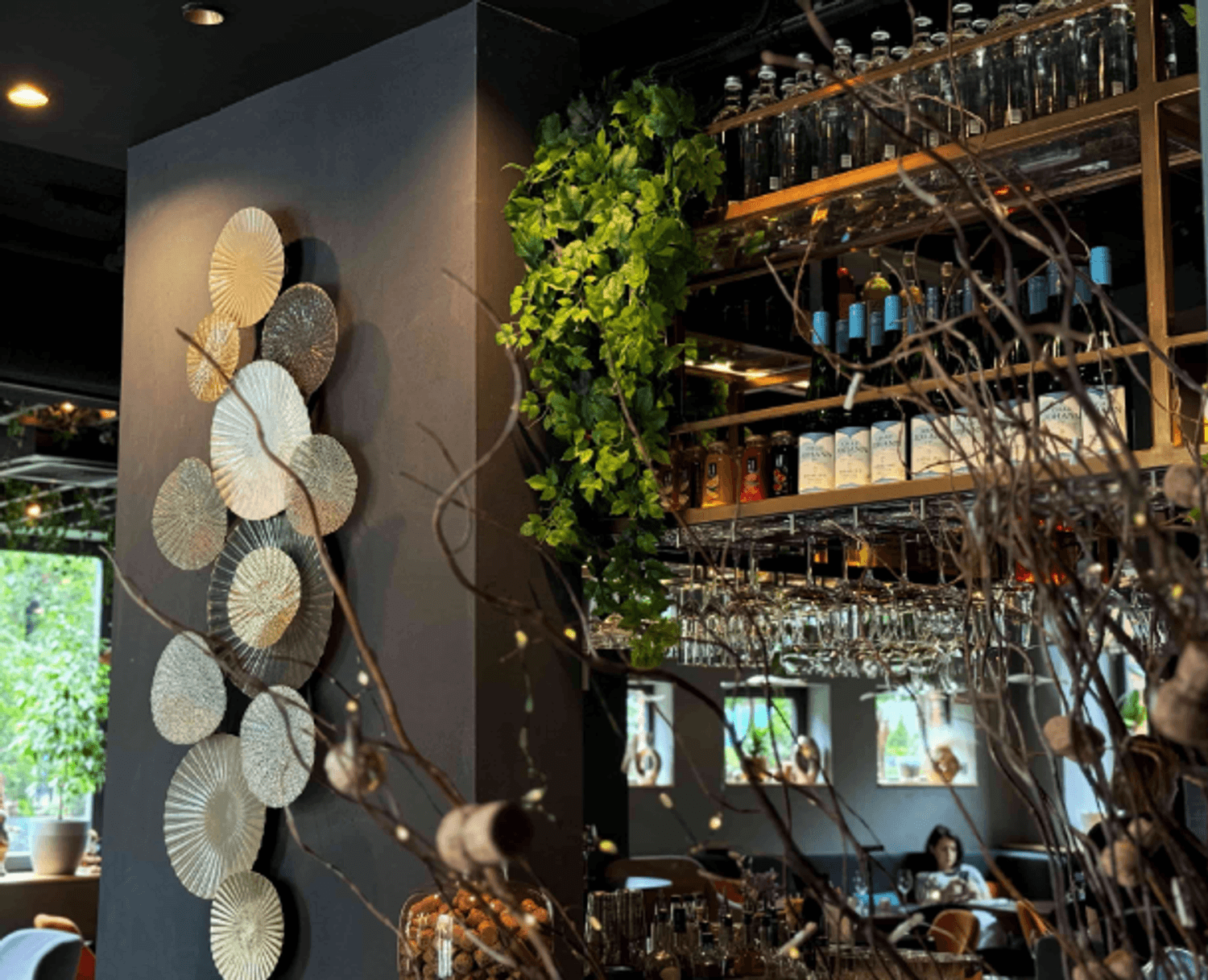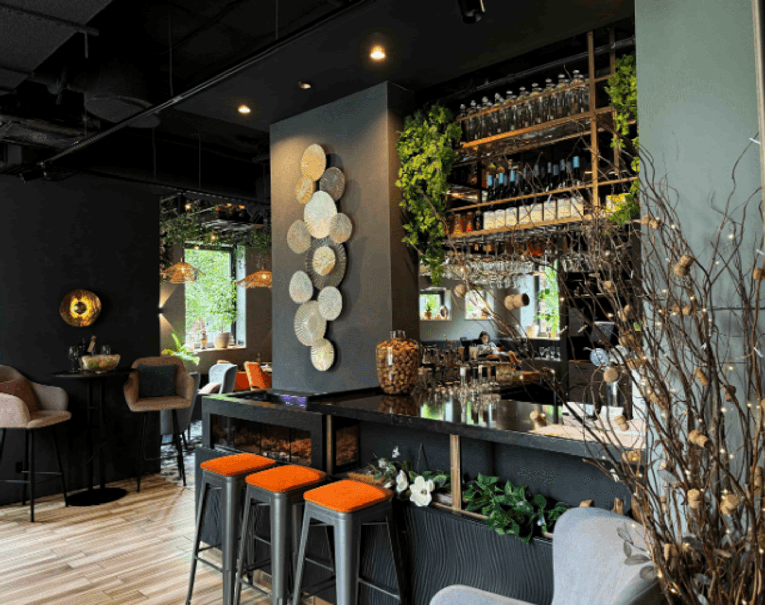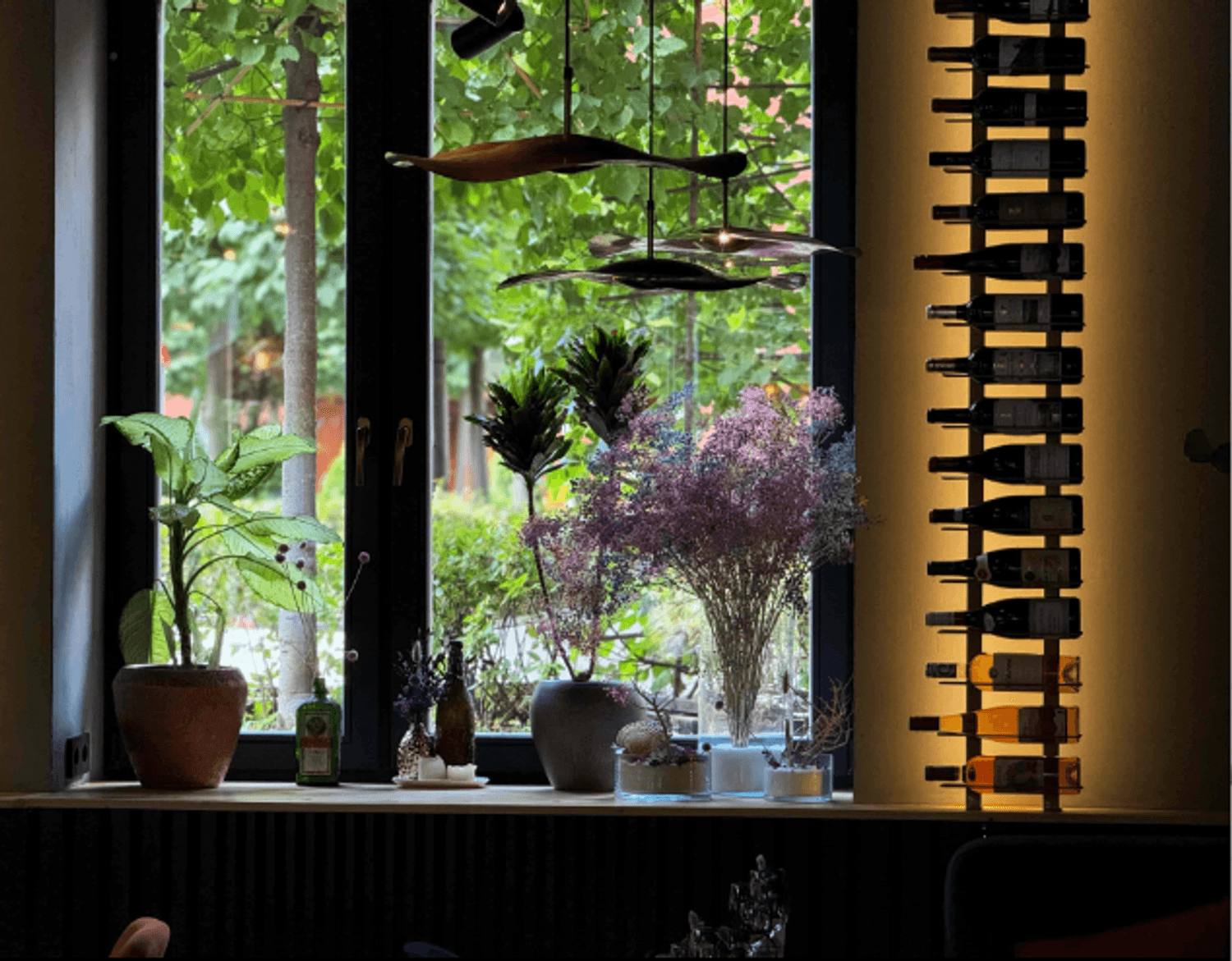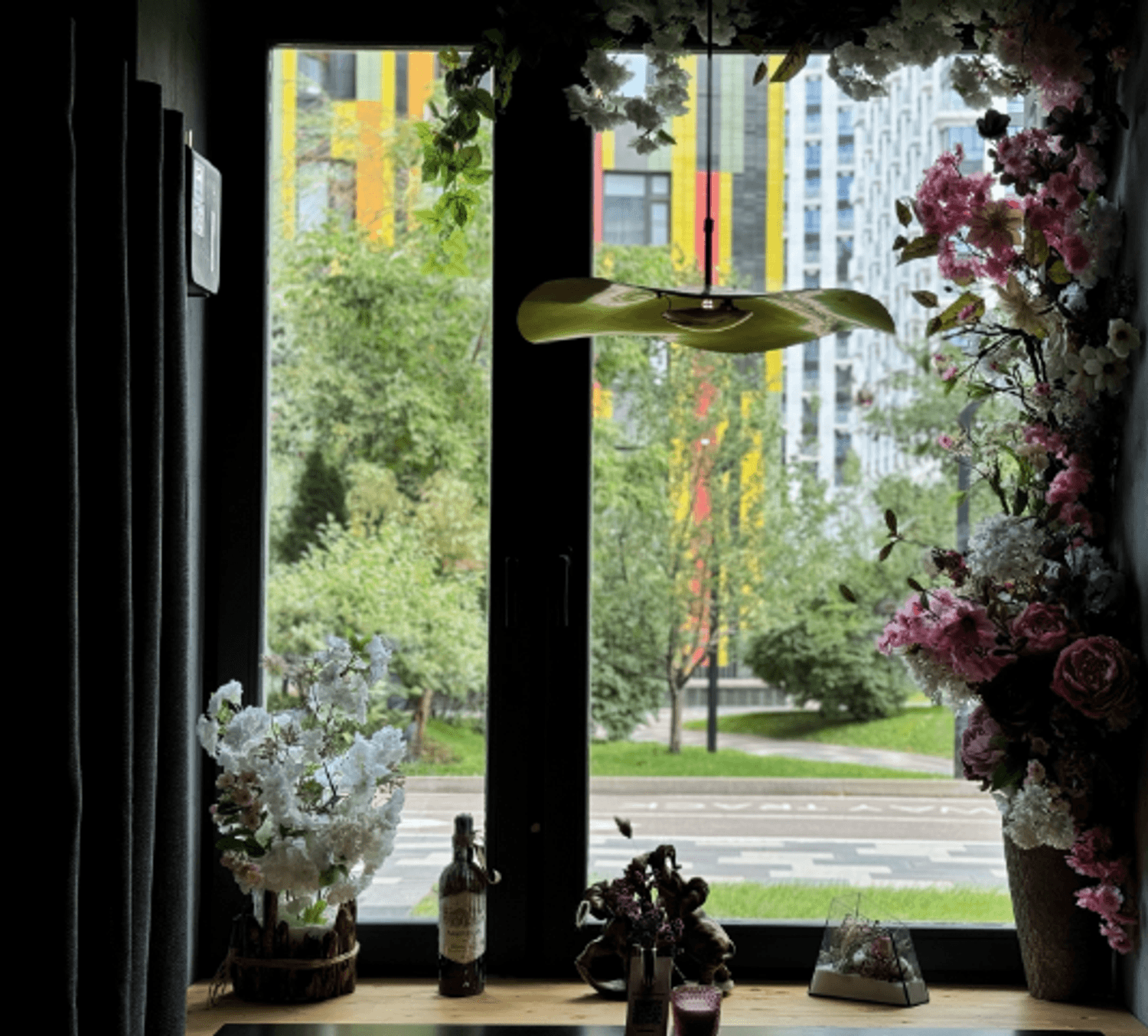 Атмосфера. Пространство с большими окнами оформлено в кофейных и синих тонах с оранжевыми акцентами. В интерьере использованы велюровые диваны, люстры с абажурами, свечи в нишах и композиции из сухоцветов, а необычные окна навевают мысли о необычных работах архитектурных дизайнеров.